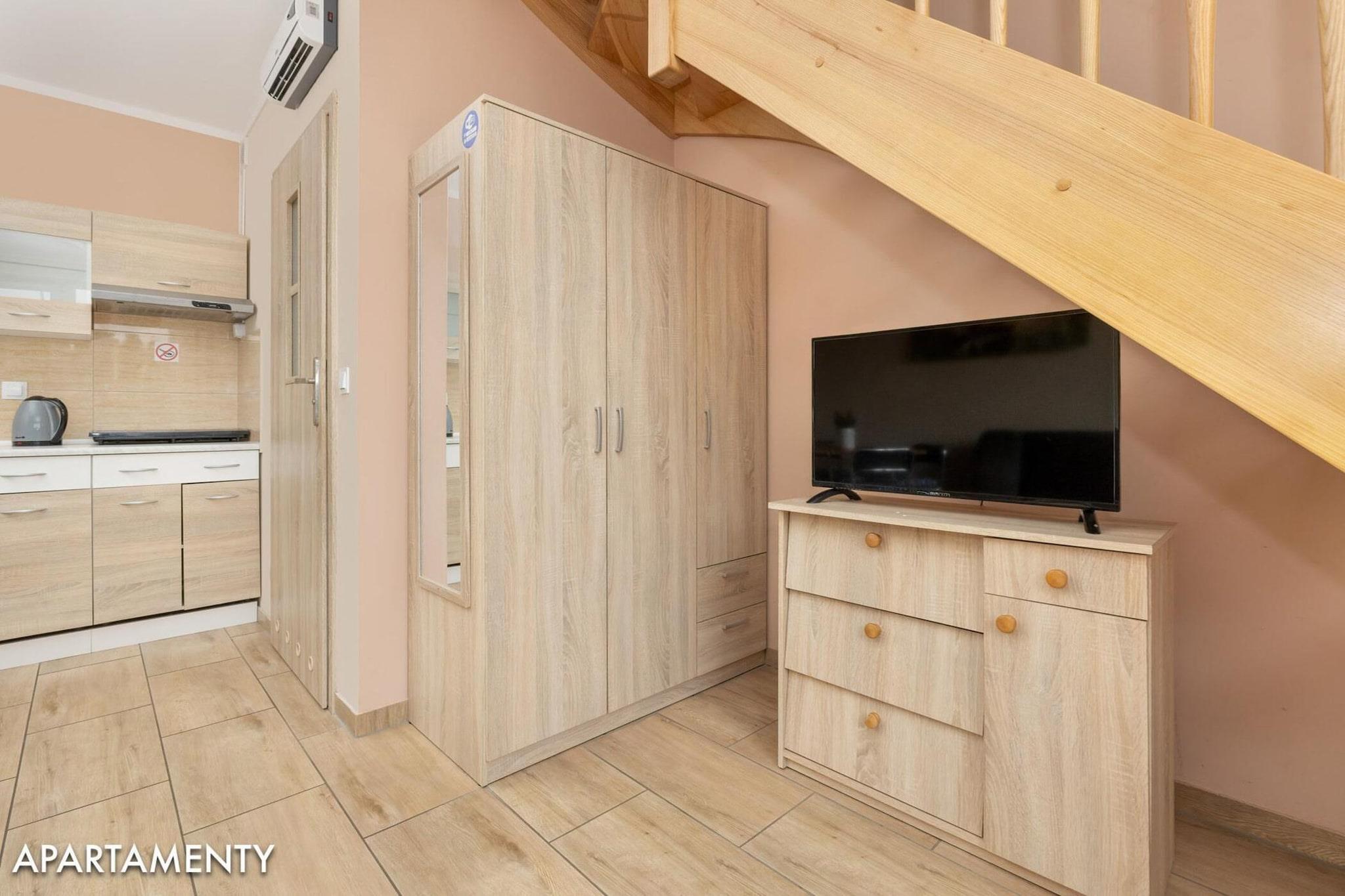 Ein Familienferienresort in einem gepflegten und umzäunten Gelände, in ruhiger Lage, nahe dem See. Nur 400 m bis zum Strand. Das Zentrum des Ferienortes ist nur wenige Schritte entfernt. Die Ferienanlage bietet komfortable, zweistöckige Ferienwohnungen. Auf der unteren Ebene befindet sich ein geräumiges Wohnzimmer mit einem Doppelschlafsofa, einem Fernseher und einem Tisch für 4 Personen. Das Wohnzimmer ist mit einer gut ausgestatteten Küche verbunden. Im Erdgeschoss befindet sich außerdem ein Badezimmer mit Dusche. Auf der oberen Ebene befindet sich ein Schlafzimmer. WLAN ist verfügbar. Vor Ort gibt es einen Parkplatz und einen attraktiven Spielplatz. Im Preis des Aufenthalts sind enthalten: Bettwäsche, Handtücher, Strom- und Wasserverbrauch, Internet, Parkplatz, Endreinigung, Hochstuhl und Babybett (vorherige Reservierung erforderlich). Niechorze ist ein Ferienort in der Woiwodschaft Westpommern. Es liegt am Ufer der Ostsee und ist das Zentrum der malerischen Rewal-Küste. Wie es sich für eine Küstenstadt gehört, bietet Niechorze den Touristen einen sauberen Strand und einen bewachten Badebereich. Hier gibt es auch einen Angelstützpunkt, der sich perfekt als Hintergrund für Erinnerungsfotos eignet. Da Sie sich in der Nähe des Strandes befinden, müssen Sie unbedingt das Wahrzeichen der Stadt sehen. Es ist ein hoher Leuchtturm, der für Besucher geöffnet ist. Der Stolz der Stadt (und eigentlich der gesamten Region) ist die renovierte Schmalspurbahn, die Ihnen einen reizvollen Ausflug in benachbarte Ferienorte ermöglicht. Im Resort lohnt sich ein Besuch des Meeresfischereimuseums und des Ozeanariums. Ein unbestrittener Vorteil ist die unmittelbare Nähe zum See Liwia Luza mit Aussichts- und Angelplattformen. Rund um den Stausee gibt es einen Wander- und Radweg. Eine interessante Fahrradroute führt auch zum Kurort Mrzezyno.