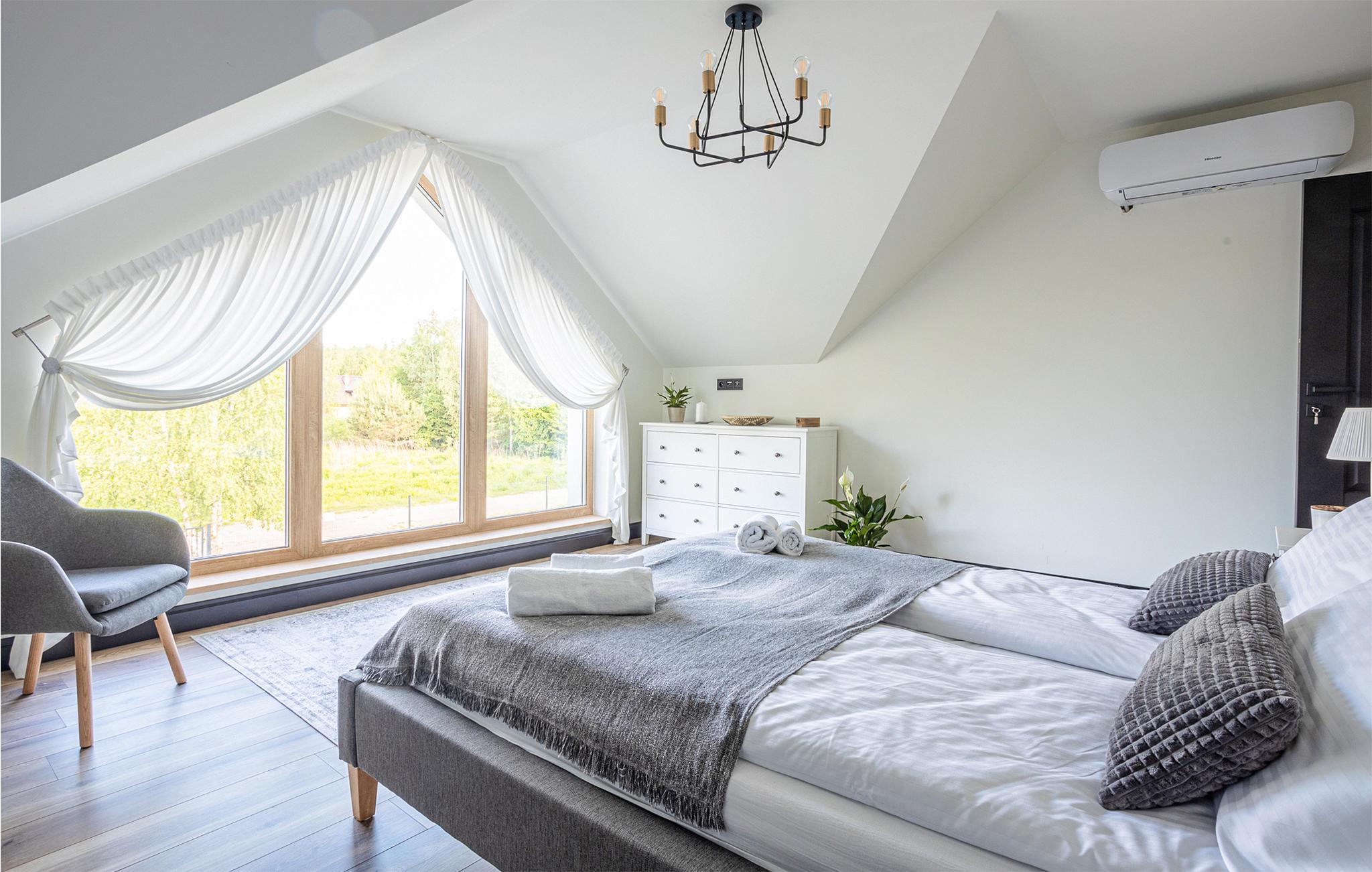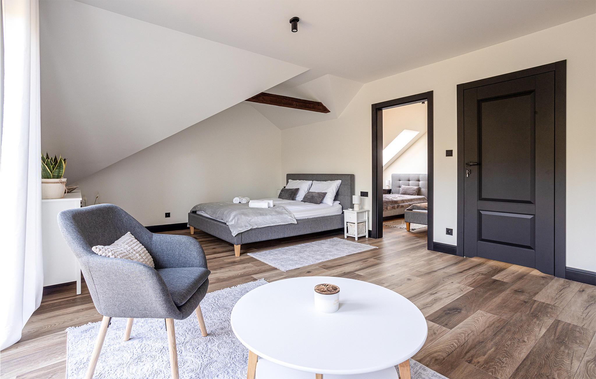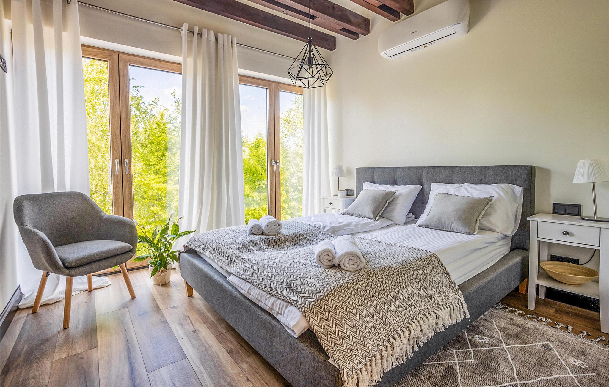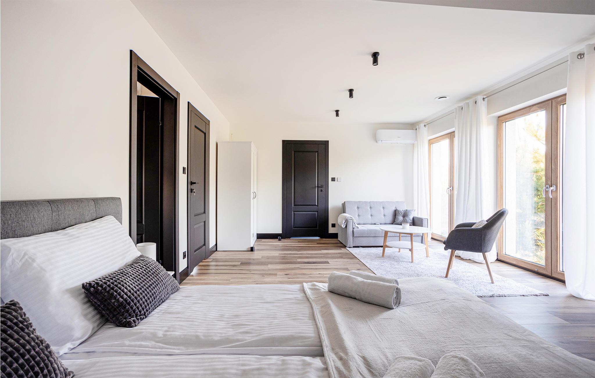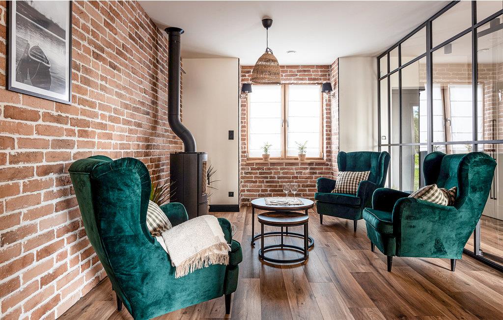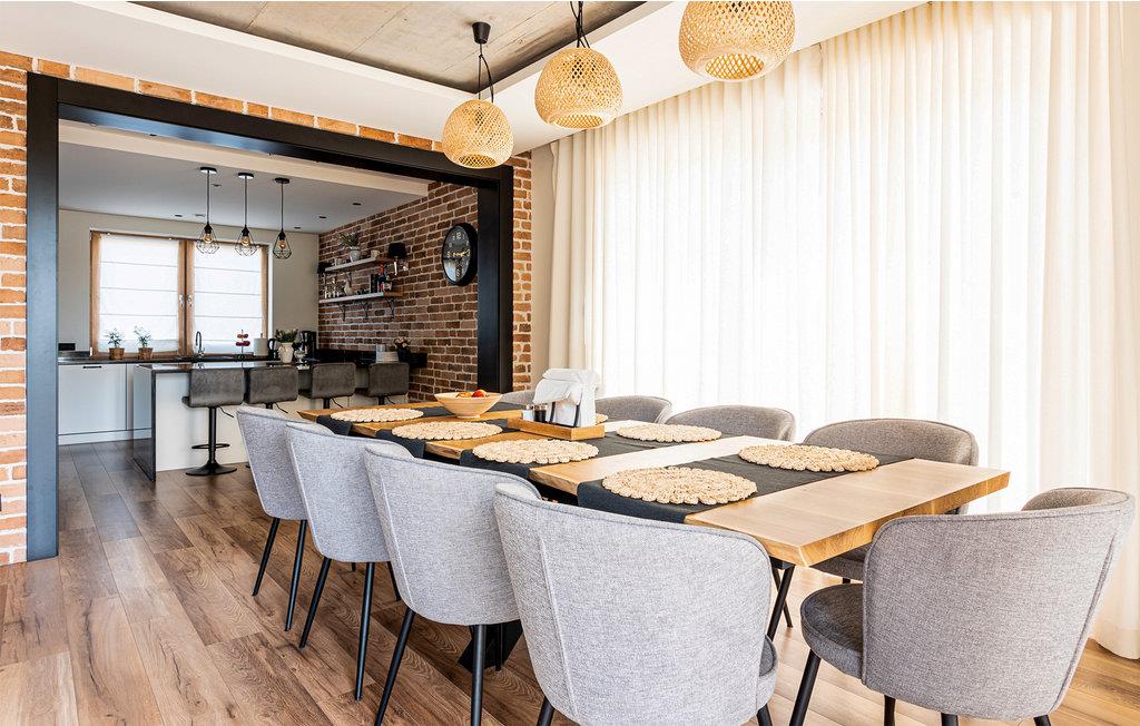 Dieses geräumige Ferienhaus ist ein wahrgewordener Traum in den Masuren. Genießen Sie eine entspannte Auszeit von Ihrem Alltag und freuen sich auf Design, hochwertigen Möbel und gemütliche Räume zum Zurückziehen. Genießen Sie eine Tasse Tee vor dem Kaminofen oder zaubern in der modernen Küche leckere Gerichte. Für gemeinsame Mahlzeiten haben Sie viel Platz am langen Esstisch oder auf der teilweise überdachten Terrasse. Hier können Sie auch relaxen und ein Bad im finnischen Holzbad nehmen, während Ihre Kinder im Garten spielen.
