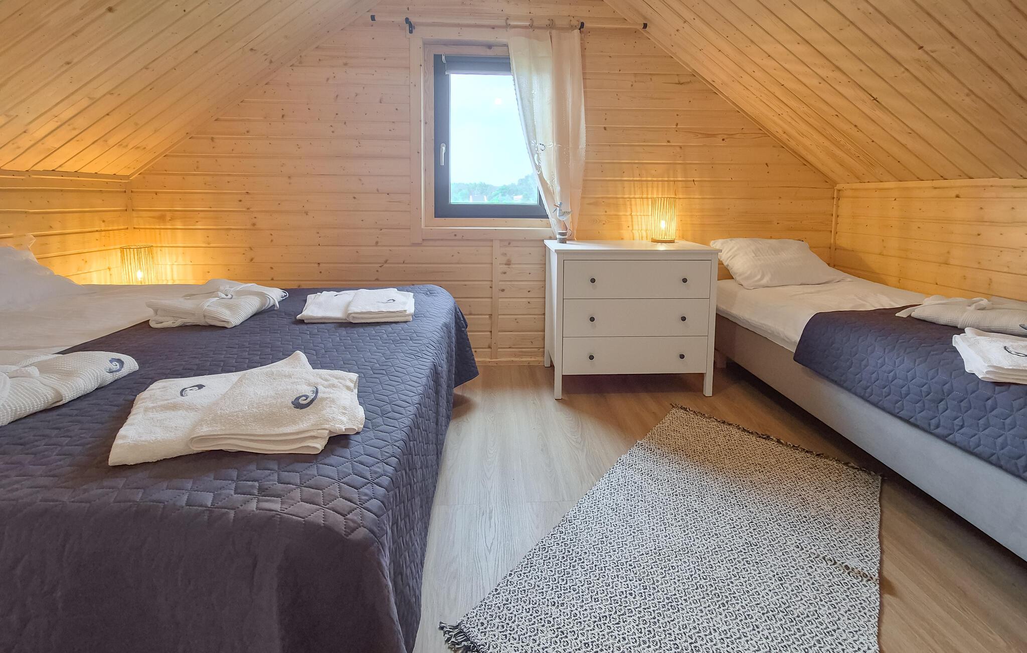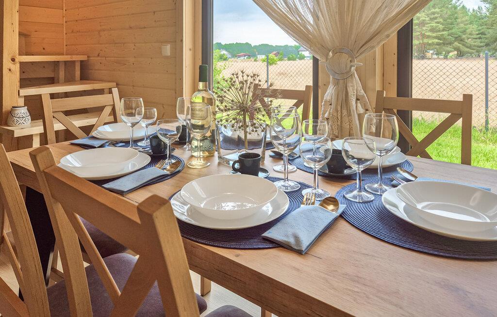 Spaß und Erholung erwarten Sie in diesem einladenden Ferienhaus in Nowe Warpno. Hier finden Familien und Freundesgruppen genau das richtige Ambiente, um eine schöne Urlaubszeit zu verbringen. Genießen Sie die friedliche Umgebung und entspannen Sie auf der großzügigen Veranda. Machen Sie es sich in der gemütlichen Sitzecke bequem oder fordern Sie Ihre Liebsten zu einer Runde Tischfußball heraus. Verschiedene Freizeitmöglichkeiten wie Petanque und Volleyball sorgen für Abwechslung, während die jüngsten Gäste die vielen Spielgeräte im Garten erobern können.