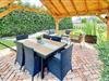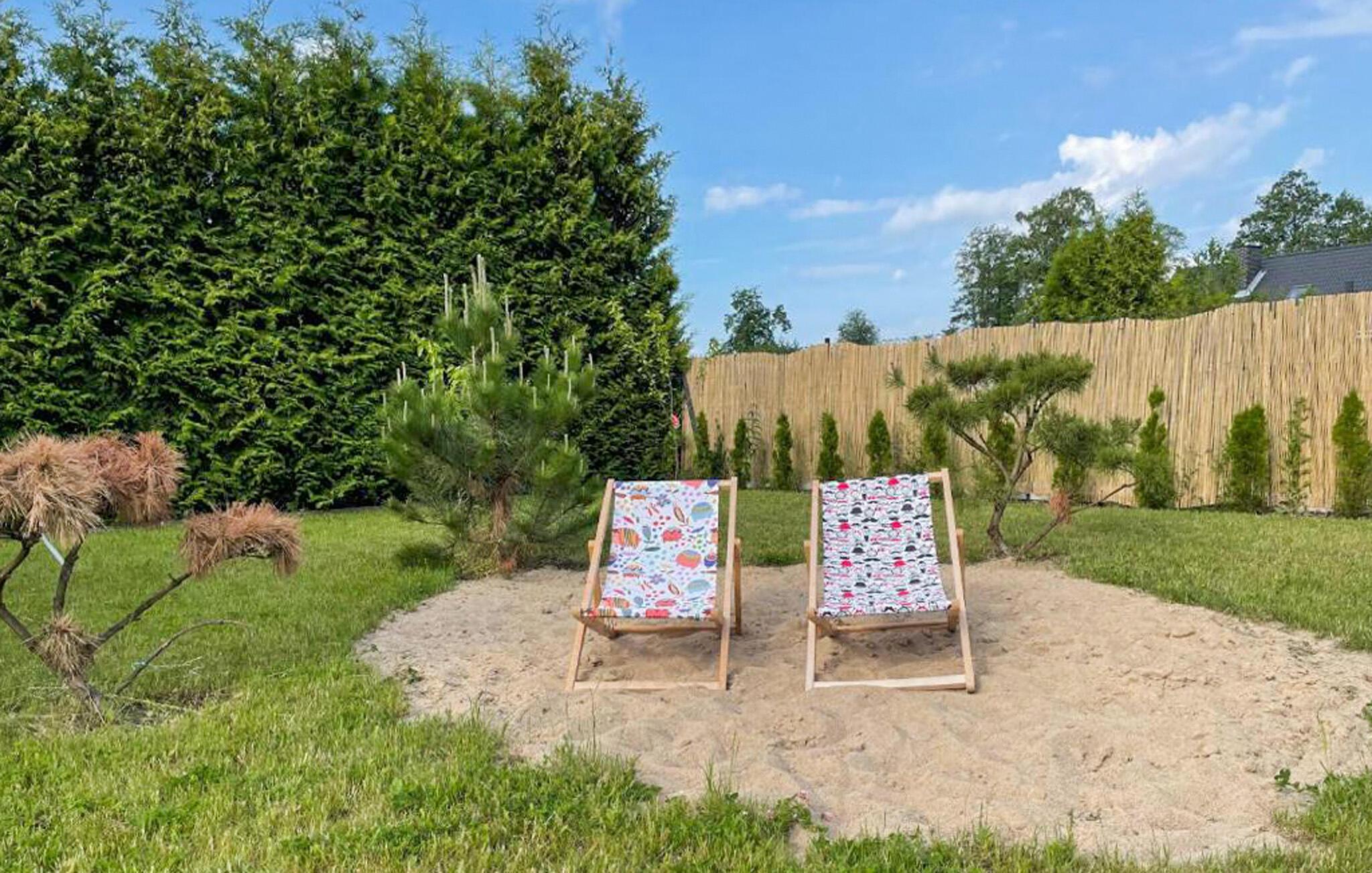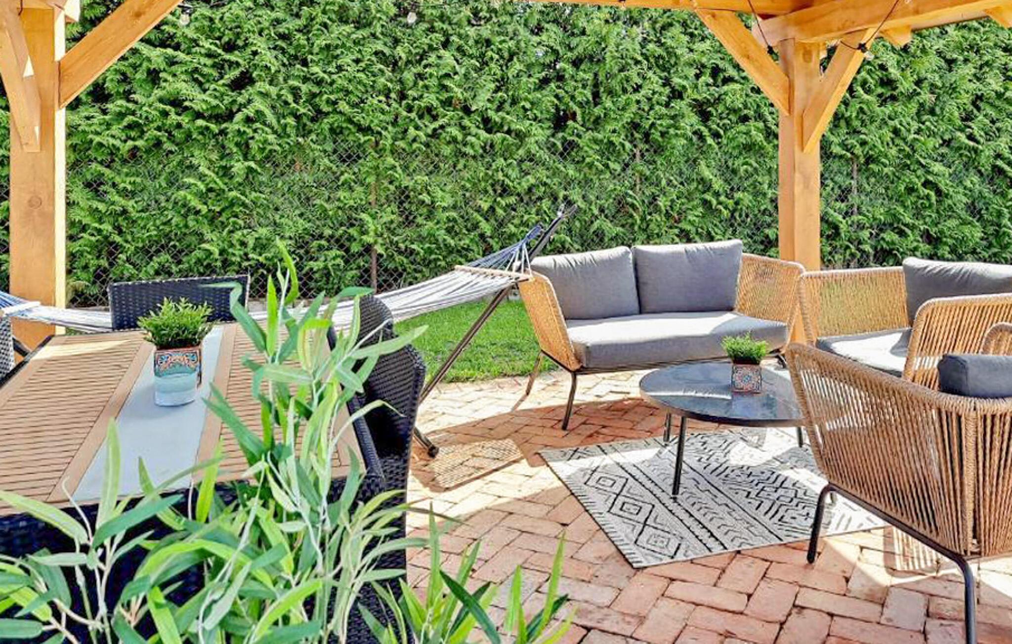 Im idyllischen Garten können Sie auf der überdachten Terrasse entspannen, ein Buch in der Hängematte genießen oder direkt auf Ihrem kleinen Privatstrand im Garten die Sonne auf der Haut spüren.