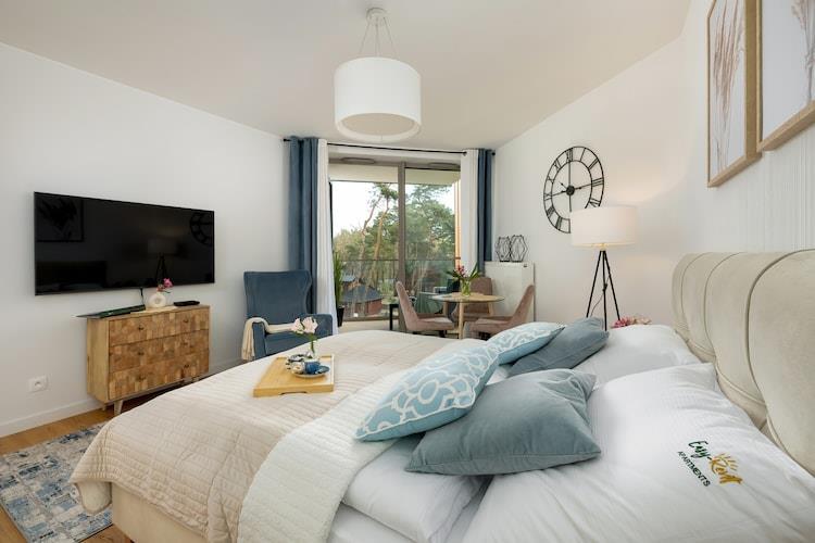 Perfekte Lage, 80 m vom Strand entfernt, im Zentrum des Resorts. Neben komfortablen Unterkünften bietet die Ferienanlage einen ganzjährig geöffneten SPA-Bereich (im Aufenthaltspreis inbegriffen): Indoor-Freizeitpool, Kinderbecken, Whirlpool, Sauna, Salzgradierwerk. Luxuriöses Ferienstudio im 3. Stock (Aufzug vorhanden). Die Wohnung besteht aus 1 großen Zimmer, das sowohl als Wohnzimmer als auch als Schlafzimmer dient. Neben dem Zimmer befindet sich eine gut ausgestattete Küche (inkl. Waschmaschine und Geschirrspüler). Badezimmer mit Dusche. Es gibt einen Balkon mit Loungemöbeln. Das Studio ist mit einer Klimaanlage mit Heiz- und Kühlfunktion ausgestattet. WLAN ist verfügbar. Den Gästen steht 1 Parkplatz in der Tiefgarage zur Verfügung. Im Preis Ihres Aufenthalts sind enthalten: Strom- und Wasserverbrauch, Internet, SPA-Bereich (Schwimmbäder, Saunen), Klimaanlage, Tiefgaragenstellplatz, Hochstuhl (nach vorheriger Anmeldung). Pobierowo ist ein Ferienort in der Woiwodschaft Westpommern. Es liegt an der Küste der Ostsee, im Zentrum der malerischen Rewal-Küste. Es bietet Touristen einen sauberen Strand und einen bewachten Badebereich. Hier befindet sich auch eine Fischerbasis, perfekt als Hintergrund für Erinnerungsfotos. Kinder werden von einem Besuch im Walpark im nahegelegenen Rewal (ca. 7 km) begeistert sein. Bei schlechtem Wetter bietet sich ein Ausflug in eines der zahlreichen öffentlichen Hallenbäder an. Auch ein Seilpark bietet tolle Unterhaltung für die ganze Familie oder eine Gruppe von Freunden. Der Stolz der Stadt und der gesamten Region ist die renovierte Schmalspurbahn, mit der man reizvolle Ausflüge in die benachbarten Ferienorte unternehmen kann.