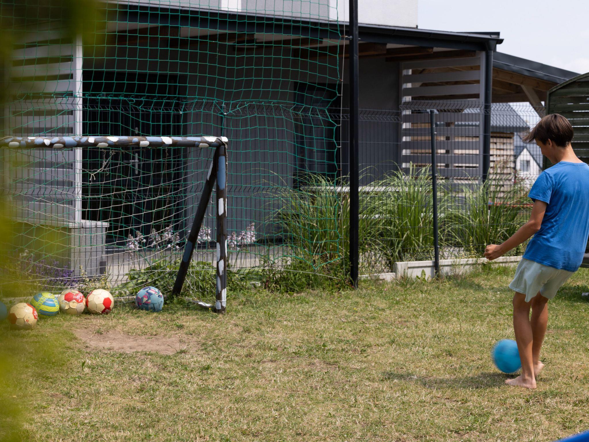 ein Spielplatz für Kinder (Schaukel, Rutsche, Sandkasten, Tor, Bälle)