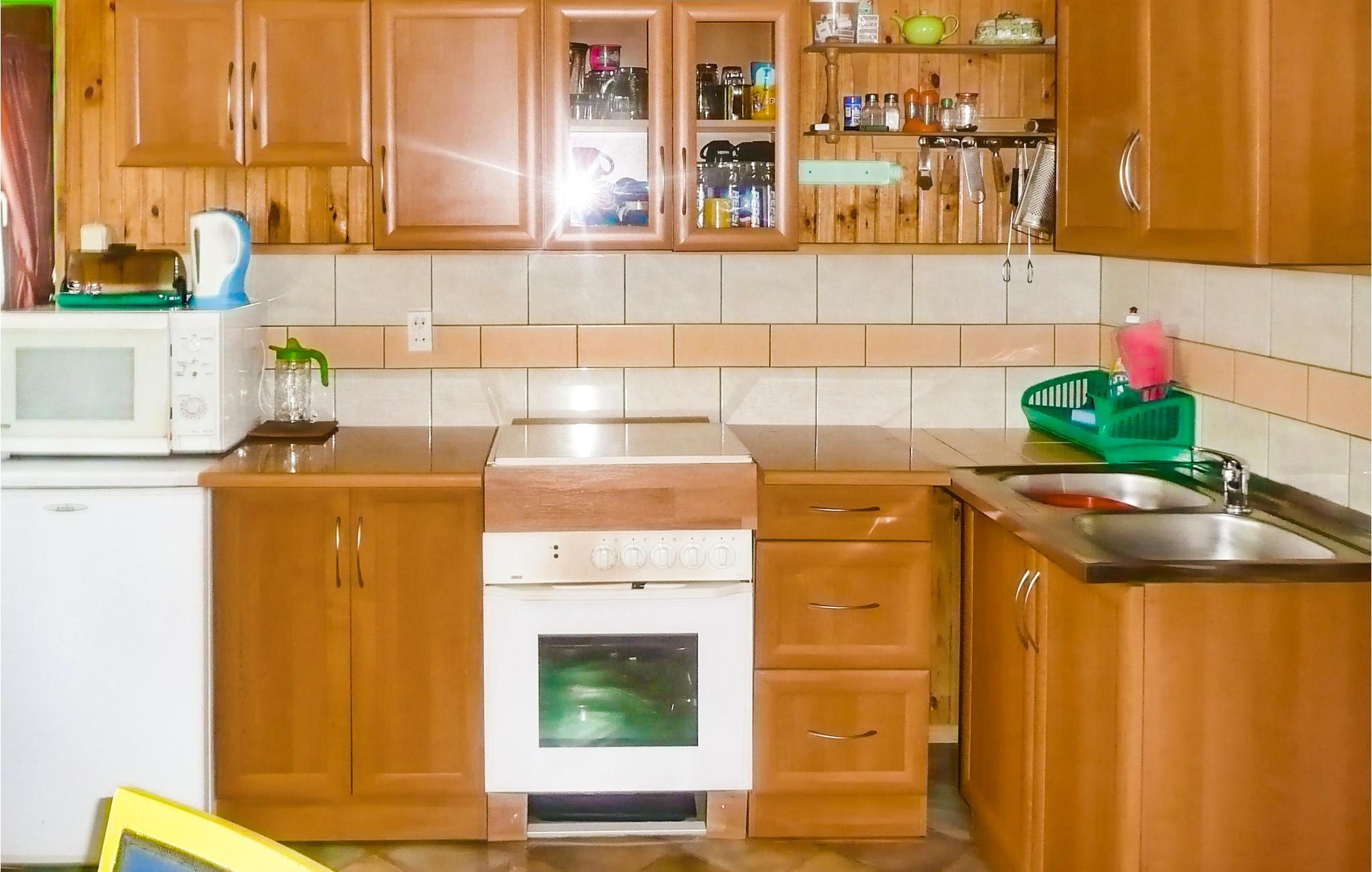 Ihr einfaches Ferienhaus liegt direkt am See Jezioro Pauzenskie und bietet Ihnen eine naturnahe Unterkunft. Sie wohnen in der Ferienhaussiedlung Arizona, wo mehrere Häuser auf einem gemeinsamen Grundstück stehen. Machen Sie es sich im Innenbereich bequem, der mit Möbeln unterschiedlichen Alters ausgestattet ist. Nutzen Sie die bequemen Sessel zum Entspannen oder speisen Sie am kleinen Tisch mit Blick auf den Kaminofen. Bereiten Sie in der funktionalen Küche Ihre Mahlzeiten zu und gestalten Sie den Aufenthalt nach Ihren Wünschen.