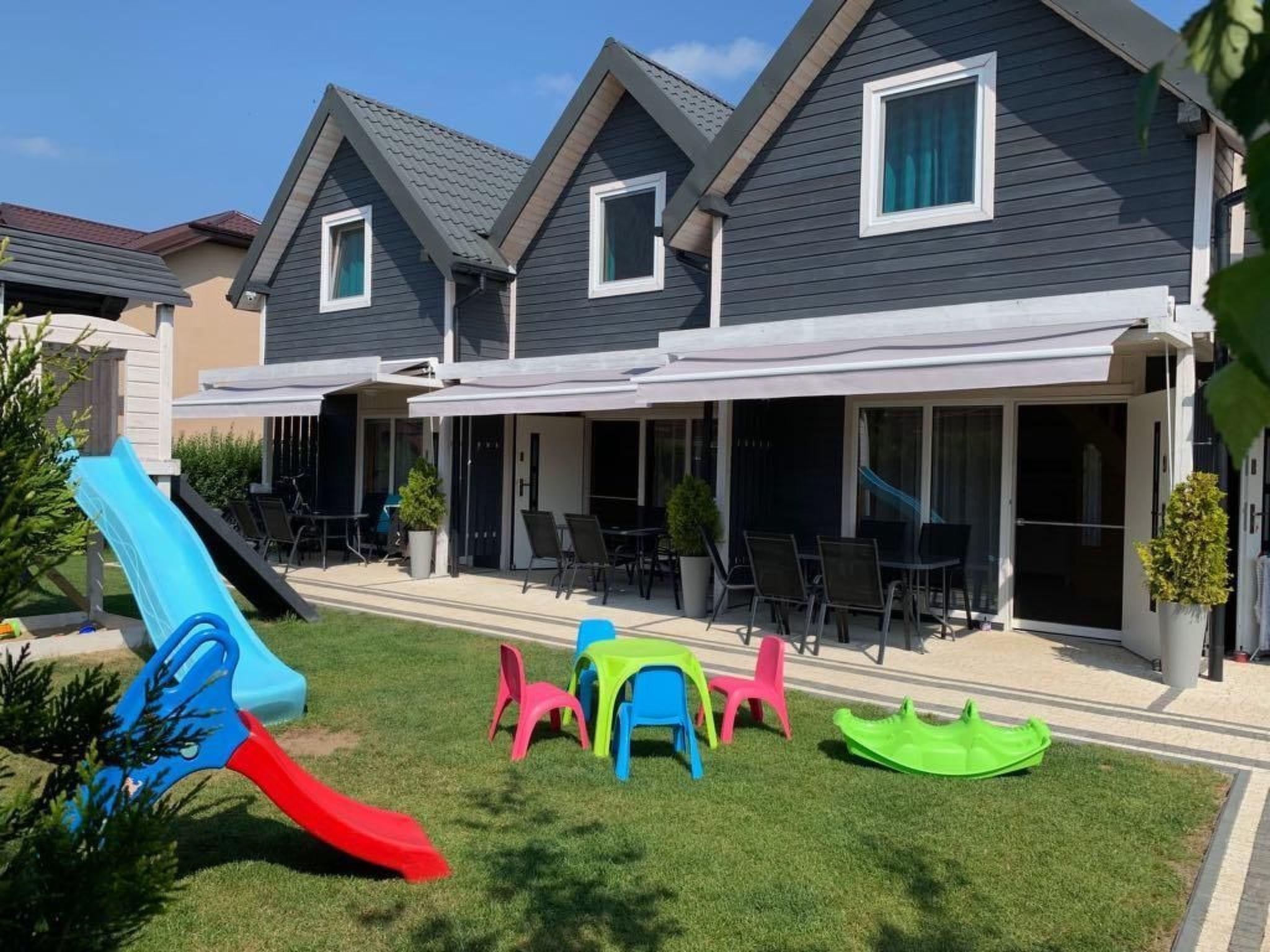 Die Eigenschaft wird überwacht.Wir bieten 1 Parkplatz für jedes Haus auf dem Grundstück.Im Gemeinschaftsbereich: ein Spielplatz für Kinder, ein Sandkasten mit Spielzeug, Fahrrädern und ein Grillplatz.Individuelle Terrassenausstattung: Gartenmöbel (Tisch + 6 Stühle), Markise.