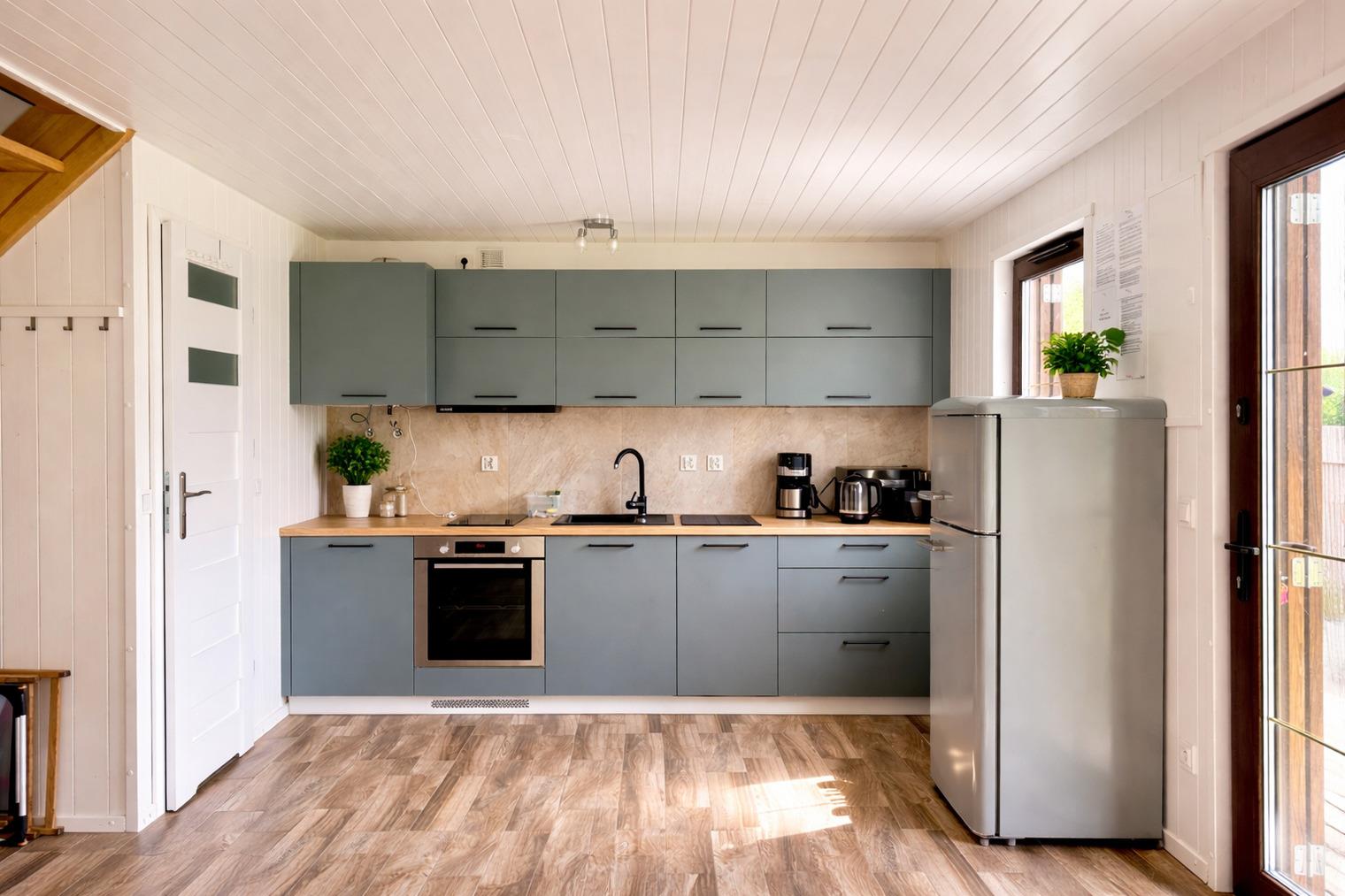 Der helle Wohnbereich im Erdgeschoss mit offener, voll ausgestatteter Küche bildet das Herz des Hauses. Hier wird gemeinsam gekocht, gegessen und Zeit miteinander verbracht. Der Kamin sorgt besonders in der kühleren Jahreszeit für eine warme, gemütliche Atmosphäre – das Holz ist bereits inklusive.