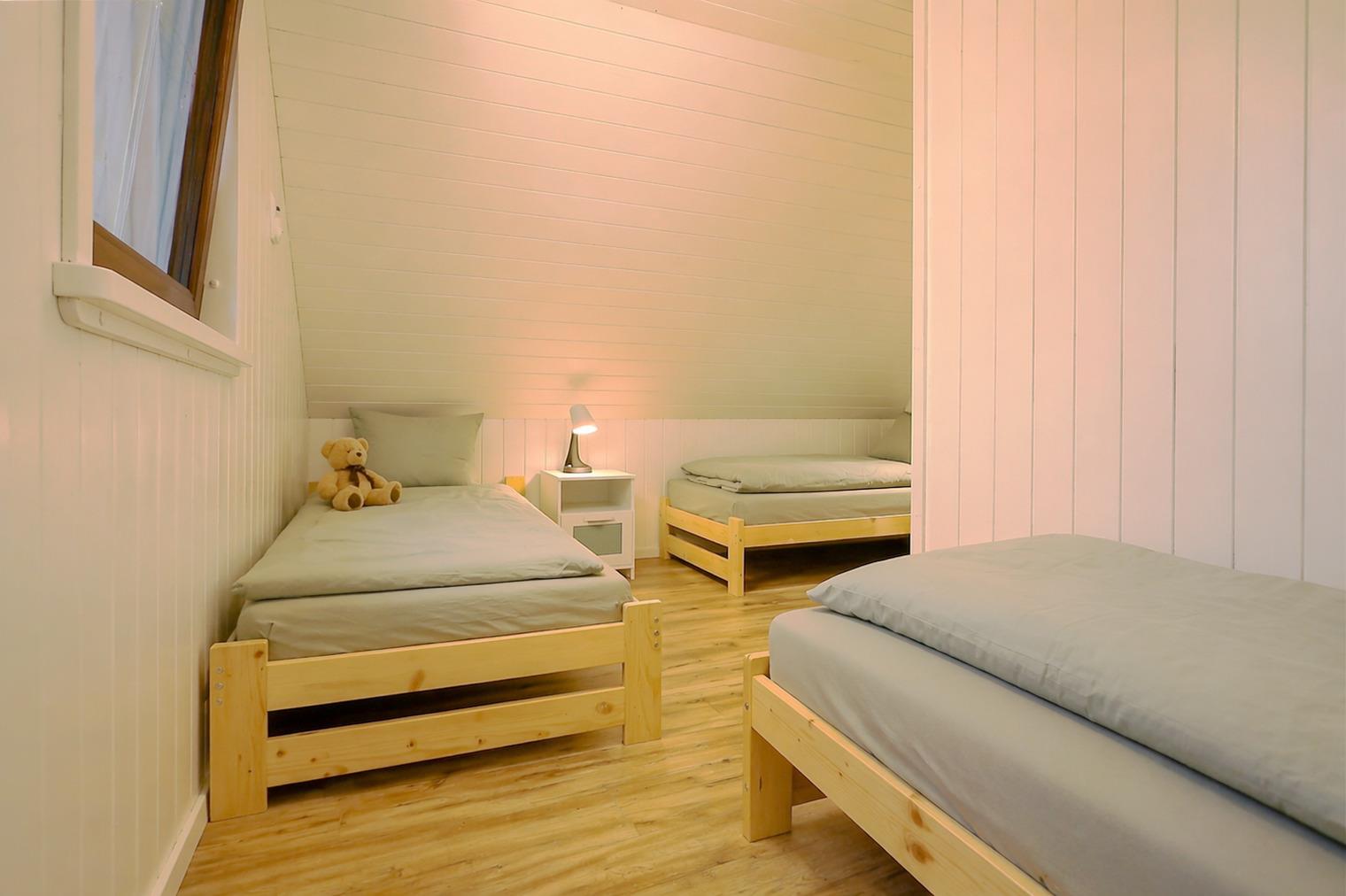 Im 1. Obergeschoss befinden sich zwei Schlafzimmer: eines mit Doppelbett und Balkon mit Blick ins Grüne sowie ein weiteres mit drei Einzelbetten – perfekt für Familien oder kleine Gruppen. Für die 6. Person lässt sich das Sofa im Wohnbereich bequem in eine zusätzliche Schlafgelegenheit verwandeln. Ein Babyreisebett (für Kinder bis ca. 3 Jahre) stellen wir euch gern kostenfrei zur Verfügung – und das Wichtigste: Es passt problemlos in beide Schlafzimmer, sodass ihr auch mit den Kleinsten ganz entspannt ankommen könnt. Damit ihr euren Urlaub direkt genießen könnt, sind die Betten bei Anreise bereits bezogen.