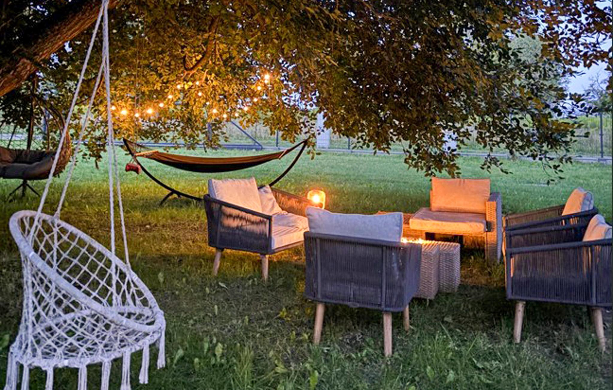 Gehen Sie hinaus auf die Sonnenterrasse und lassen Sie die Seele baumeln. Setzen Sie sich in die Loungemöbel unter schattigen Bäumen oder verweilen Sie am kleinen Steg mit gemütlicher Sitzbank direkt am Wasser. Abends schafft die Feuerstelle im Garten eine besonders stimmungsvolle Atmosphäre.