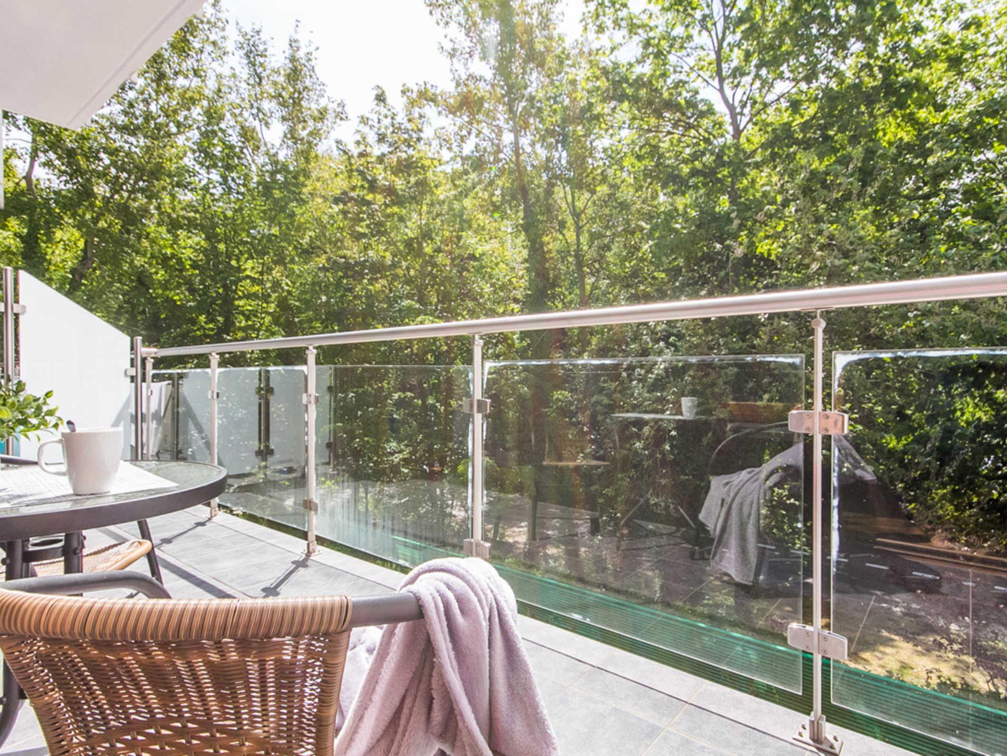 Die Fenster des Wohnzimmers und des Balkons sind nach Süden ausgerichtet, direkt auf den Wald.