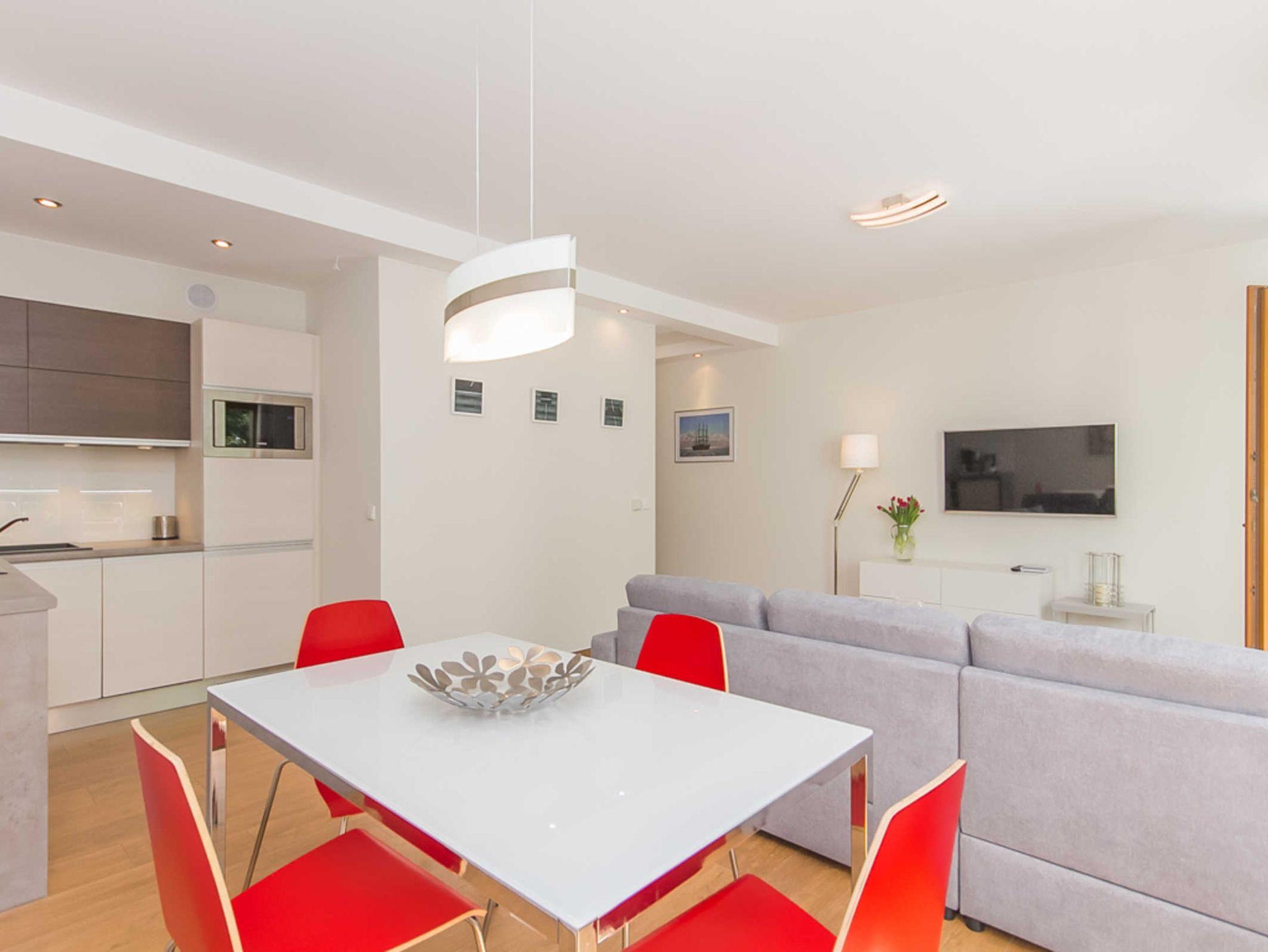Im Wohnzimmer befindet sich eine Sitzecke mit einem bequemen Ecksofa (nach dem Ausklappen 140x200cm), einem Couchtisch, einer Kommode und einem Fernseher.