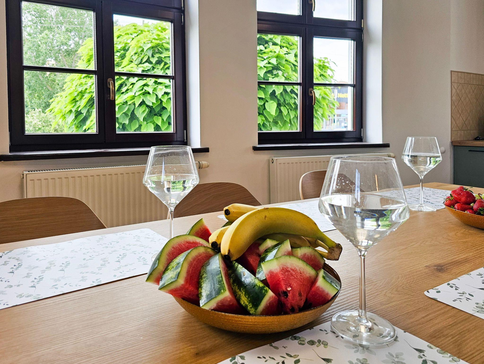 Großem Essbereich mit Küchenzeile ? ein heller Raum mit nach Süden ausgerichteten Fenstern. Den Gästen stehen zur Verfügung: ein ausziehbares, bequemes Doppelschlafsofa, ein Esstisch mit 8 Stühlen, eine voll ausgestattete Küchenzeile mit Dunstabzugshaube, Geschirrspüler, Backofen, Induktionskochfeld mit 4 Platten, Einzelspülbecken, Geschirr, Töpfe, Besteck sowie eine Speisekammer mit großem Kühlschrank mit Gefrierfach und Waschmaschine.