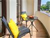 Schlafzimmer 1: ausziehbares Doppelbett (2x 80x200 cm), Einzelschlafsofa, Tisch mit 2 Stühlen, Kleiderschrank, Zugang zum Balkon gemeinsam mit Schlafzimmer 2.