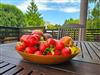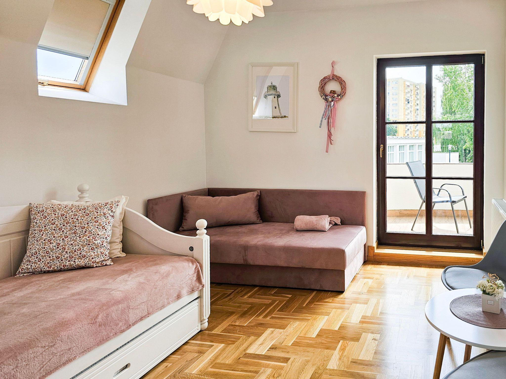 Großzügiges Wohnzimmer mit Zugang zur Terrasse. Für die Gäste: große Schlafcouch, zusätzliche 2-Sitzer-Couch, Tisch mit 6 Stühlen, Fernseher, Kommode. Auf der Terrasse befinden sich Gartenmöbel und eine Treppe zum Garten. Grillmöglichkeit vorhanden.