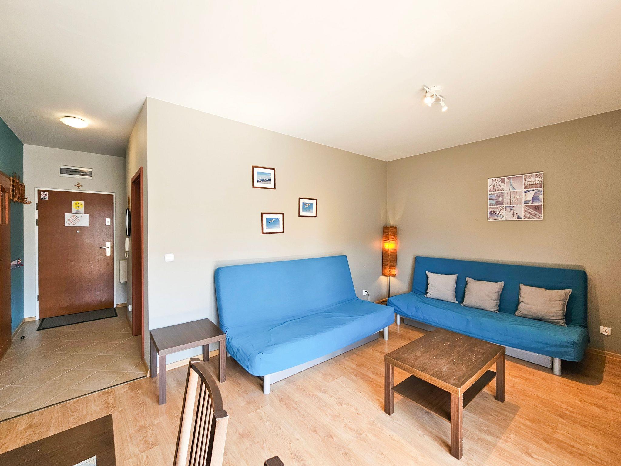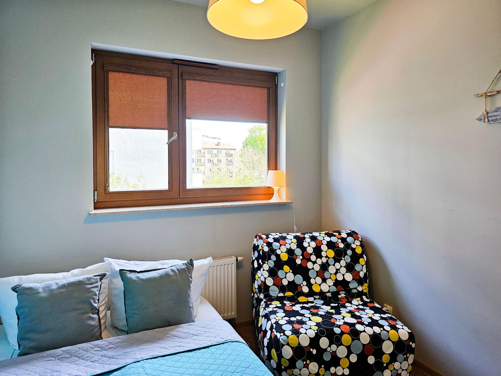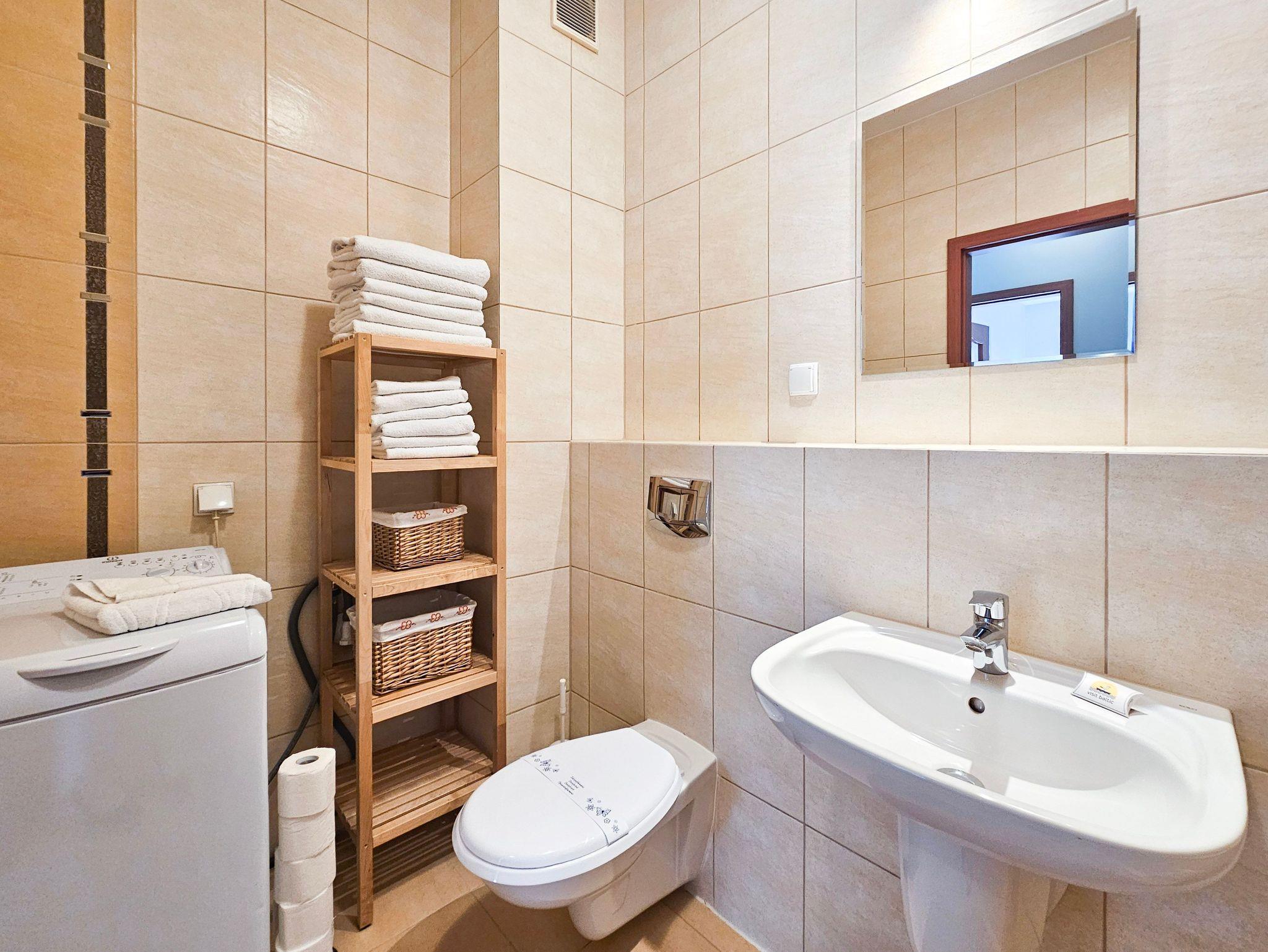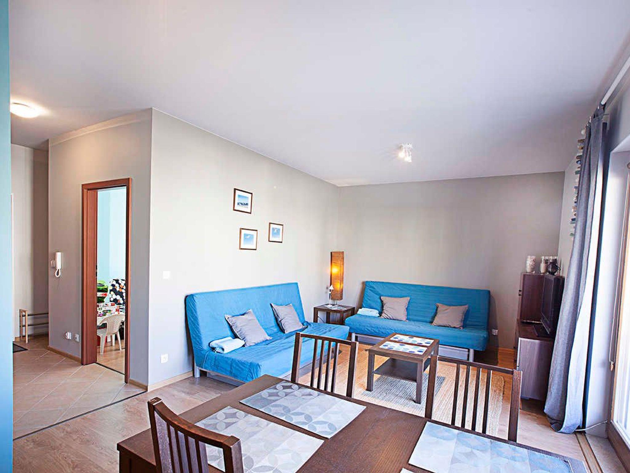 Das Wohnzimmer verfügt über zwei ausklappbare Sofas (Liegefläche 140x200cm), einen Couchtisch, einen Tisch und 4 Stühle. Die Küchenzeile ist mit der notwendigen Ausstattung ausgestattet: Töpfe, Geschirr, Besteck, Wasserkocher, Toaster, Kaffeemaschine, Backofen, Kühlschrank. Im kleineren Zimmer gibt es ein ausklappbares Sofa mit einer Liegefläche von 140 x 200 cm, einen ausklappbaren Sessel (80 x 195 cm) und eine kleine Kommode. Das Badezimmer verfügt über eine Badewanne und eine Waschmaschine. Die Wohnzimmer- und Balkonfenster sind nach Süden ausgerichtet, das Schlafzimmerfenster nach Osten. Gäste können kostenloses WLAN nutzen. In der Wohnung sind lokale Kabel-TV-Programme verfügbar.