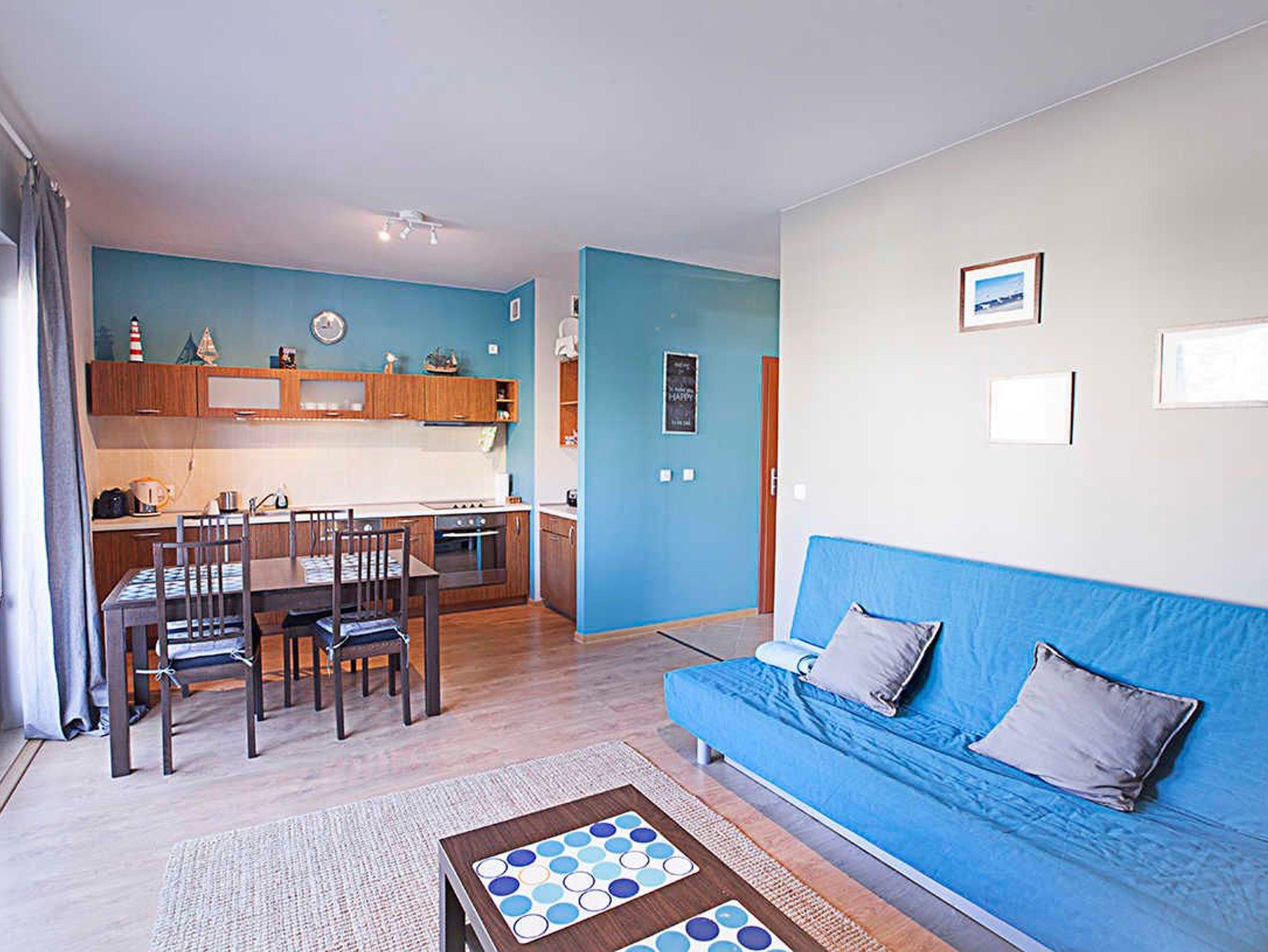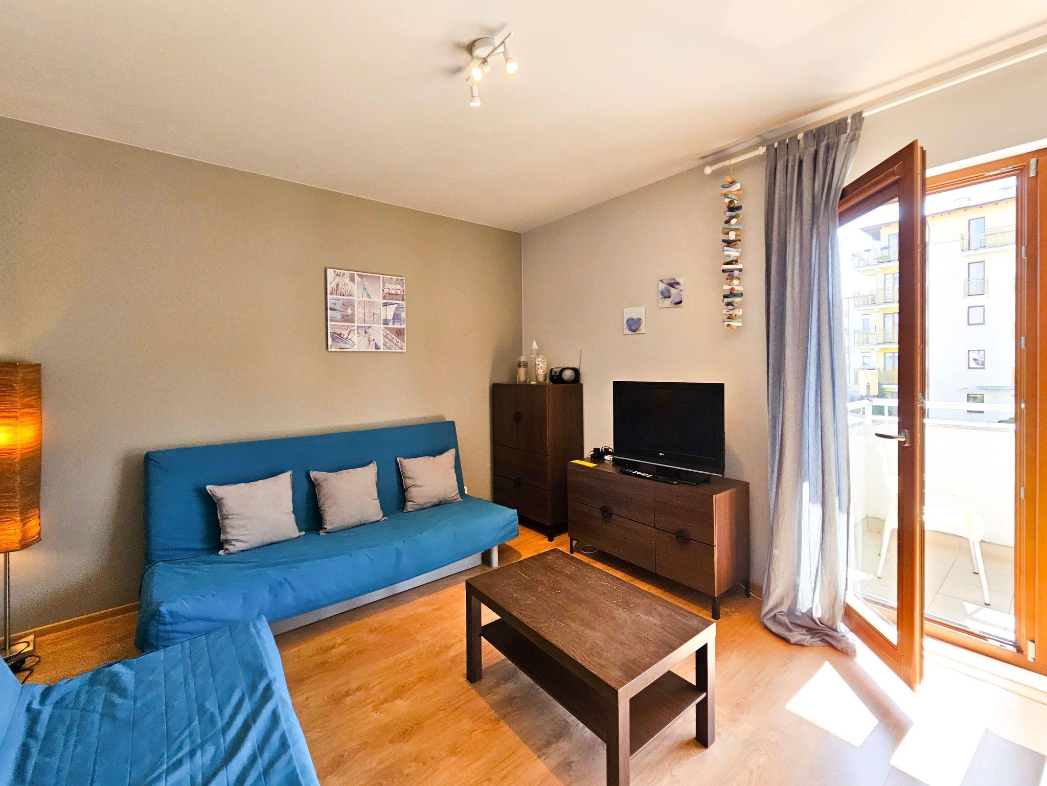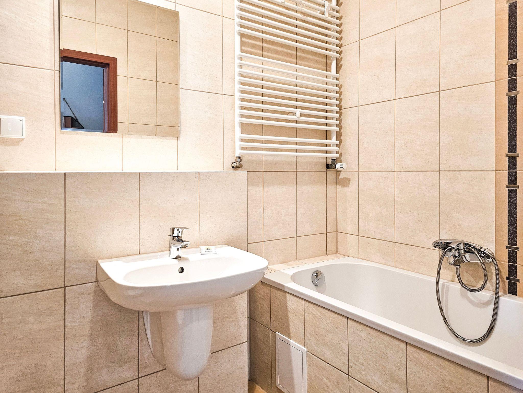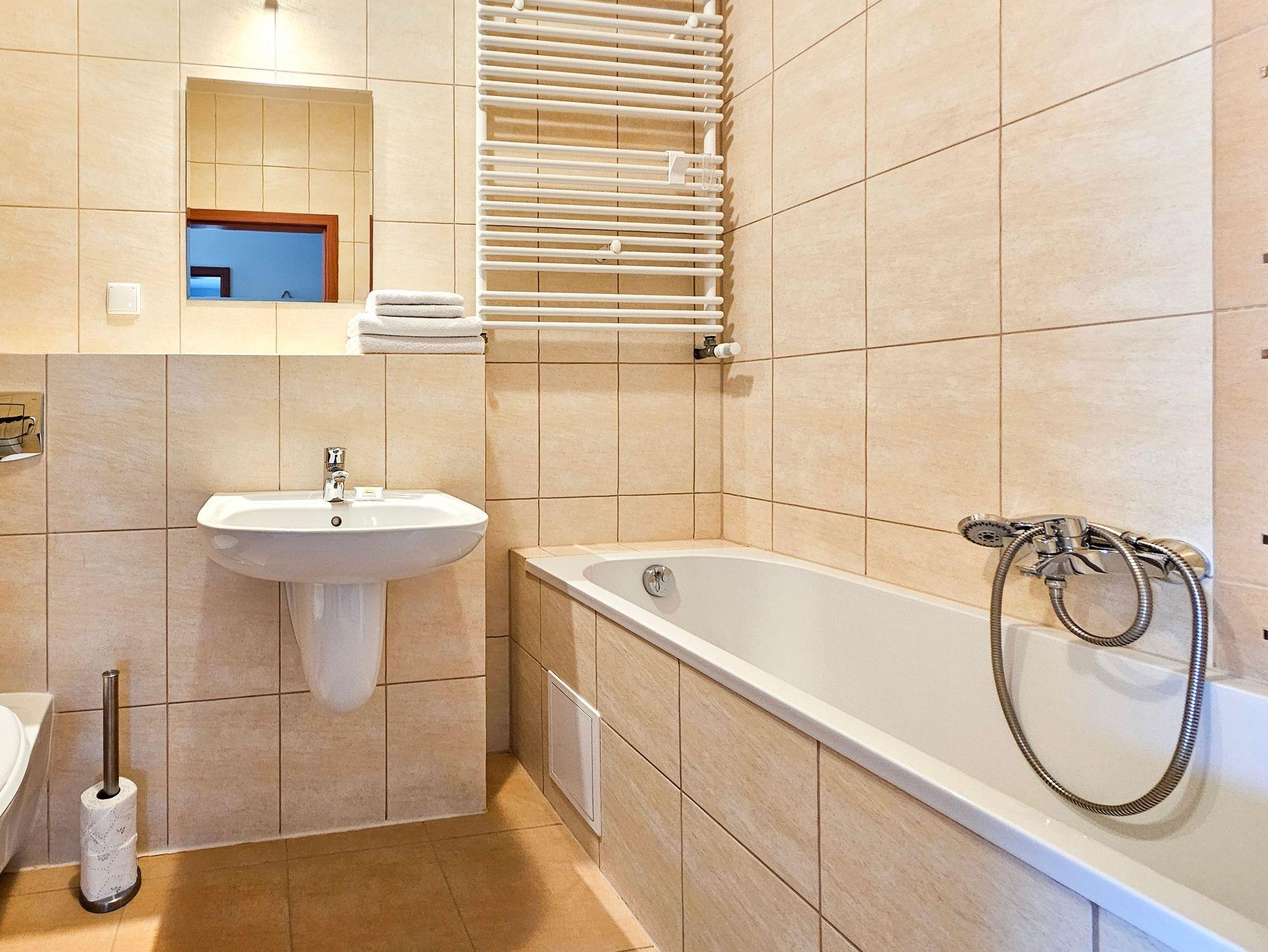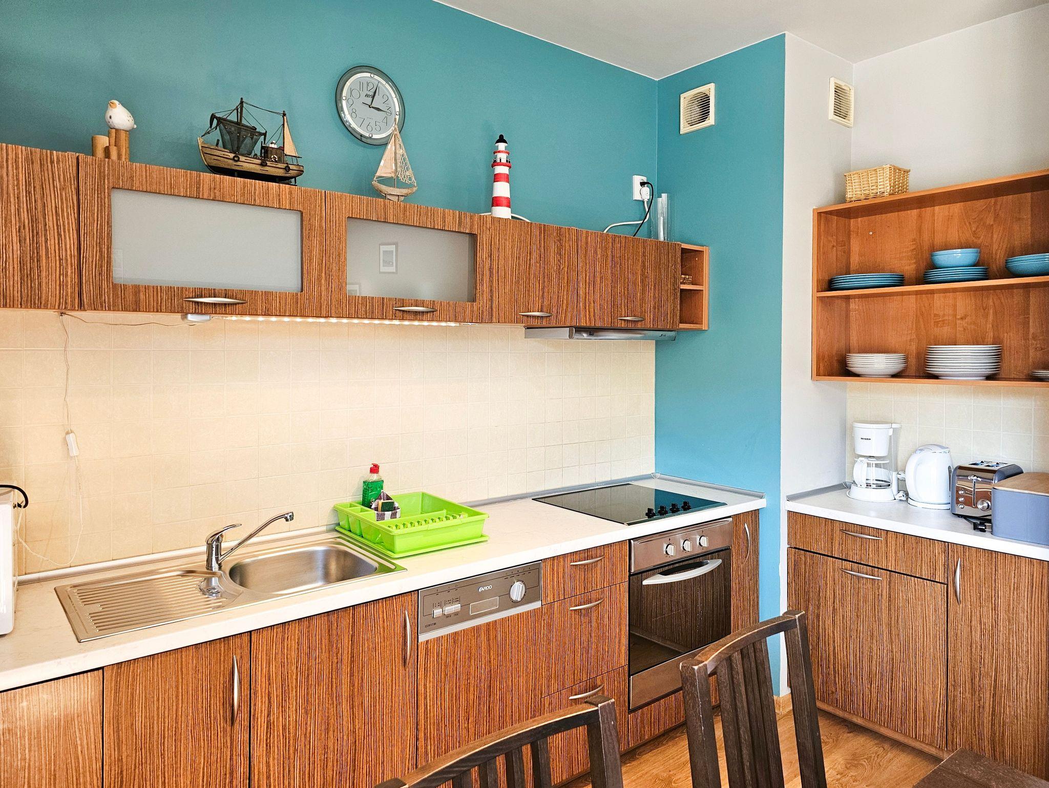 Das Wohnzimmer verfügt über zwei ausklappbare Sofas (Liegefläche 140x200cm), einen Couchtisch, einen Tisch und 4 Stühle. Die Küchenzeile ist mit der notwendigen Ausstattung ausgestattet: Töpfe, Geschirr, Besteck, Wasserkocher, Toaster, Kaffeemaschine, Backofen, Kühlschrank. Im kleineren Zimmer gibt es ein ausklappbares Sofa mit einer Liegefläche von 140 x 200 cm, einen ausklappbaren Sessel (80 x 195 cm) und eine kleine Kommode. Das Badezimmer verfügt über eine Badewanne und eine Waschmaschine. Die Wohnzimmer- und Balkonfenster sind nach Süden ausgerichtet, das Schlafzimmerfenster nach Osten. Gäste können kostenloses WLAN nutzen. In der Wohnung sind lokale Kabel-TV-Programme verfügbar.