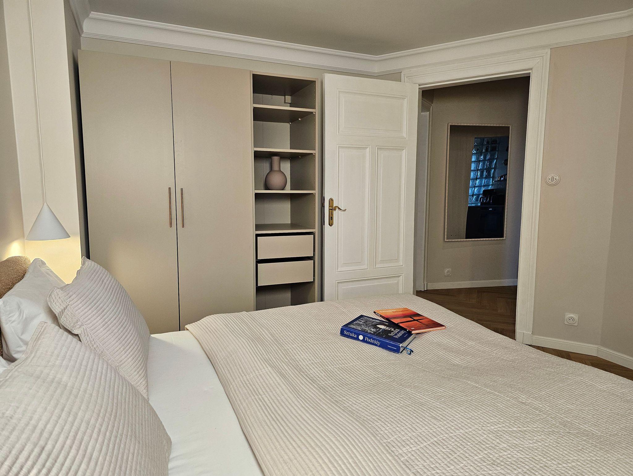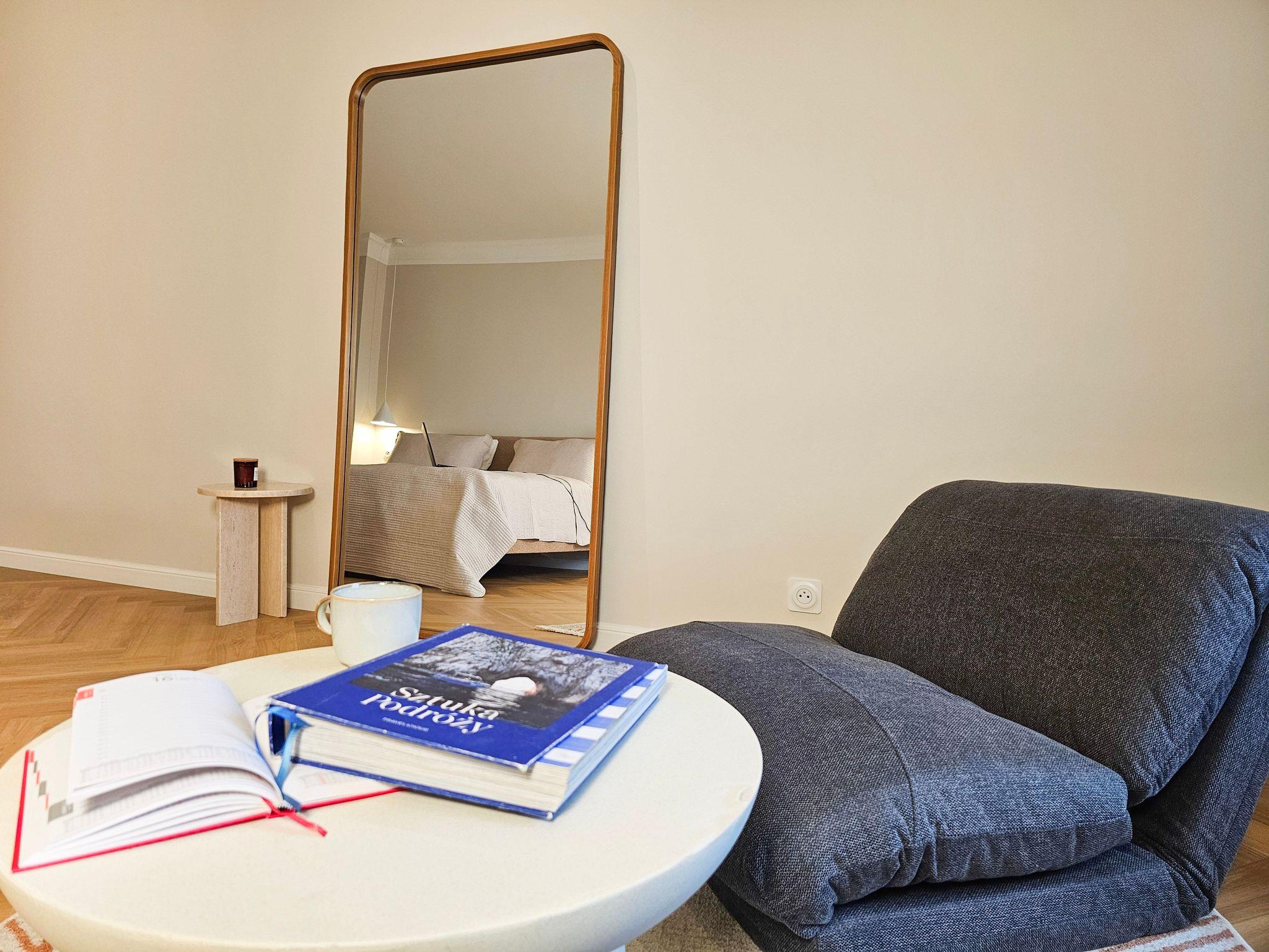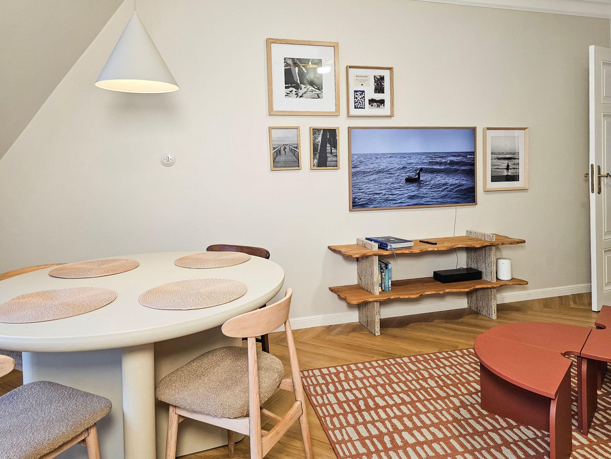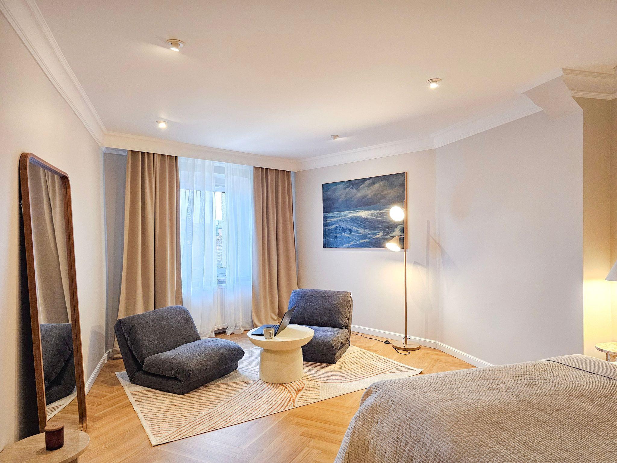 Eine geräumige und stilvolle Ferienwohnung mit einem Schlafzimmer, einem Wohnzimmer, einer Küche und einem Badezimmer, gelegen in einem historischen Mietshaus aus der Wende vom 19. zum 20. Jahrhundert. Sie befindet sich im 4. Stock und ist nur über Treppen erreichbar. Die Wohnung zeichnet sich durch einen hellen, minimalistischen, durchdachten und funktionalen Raum aus.