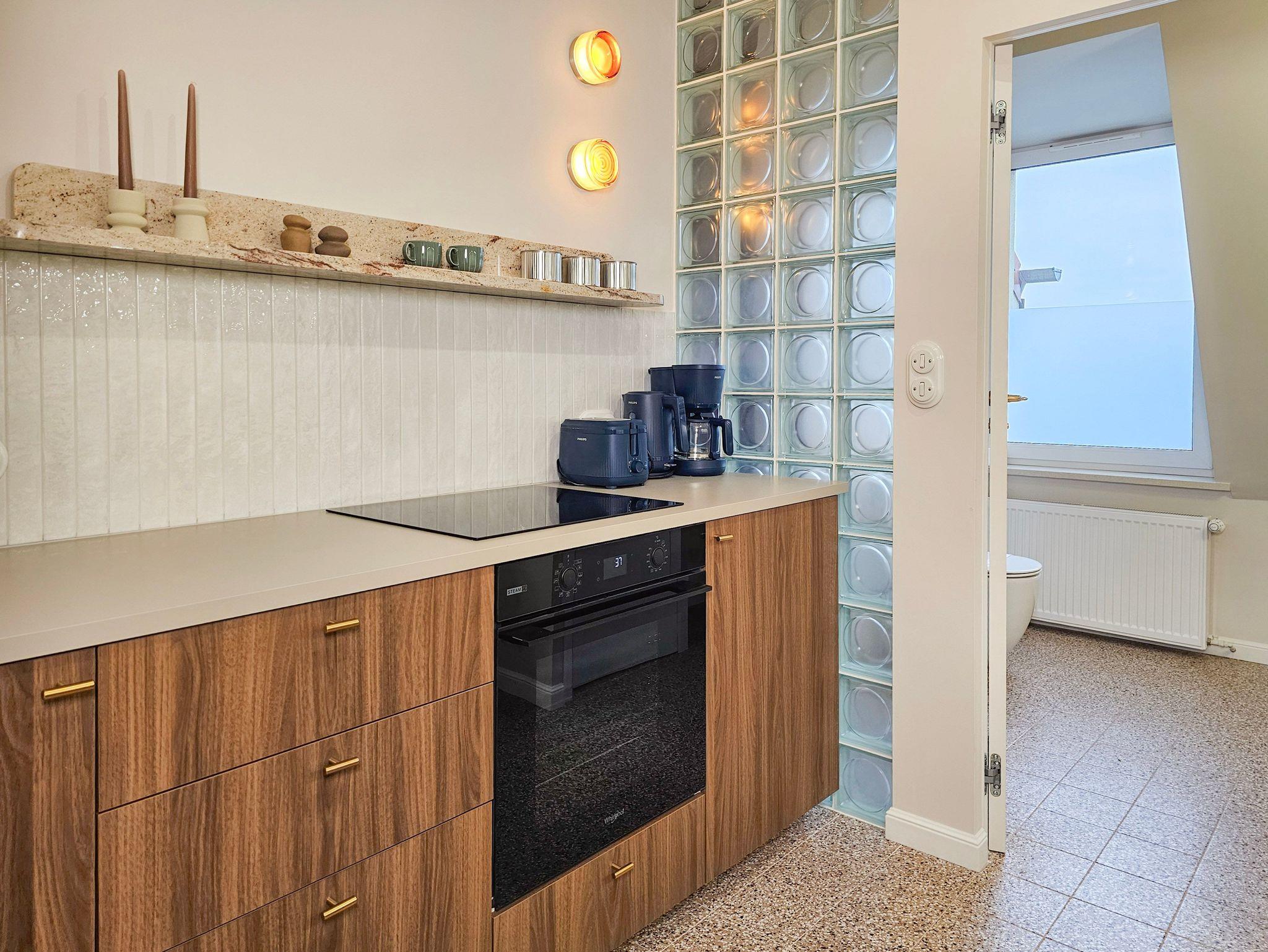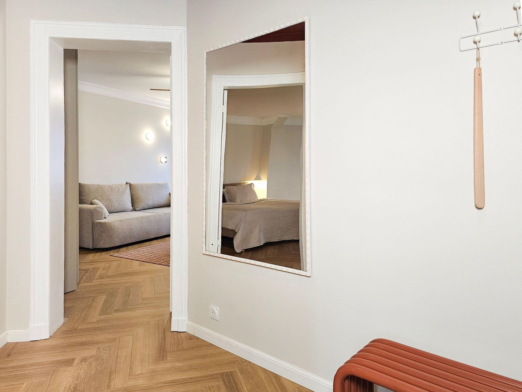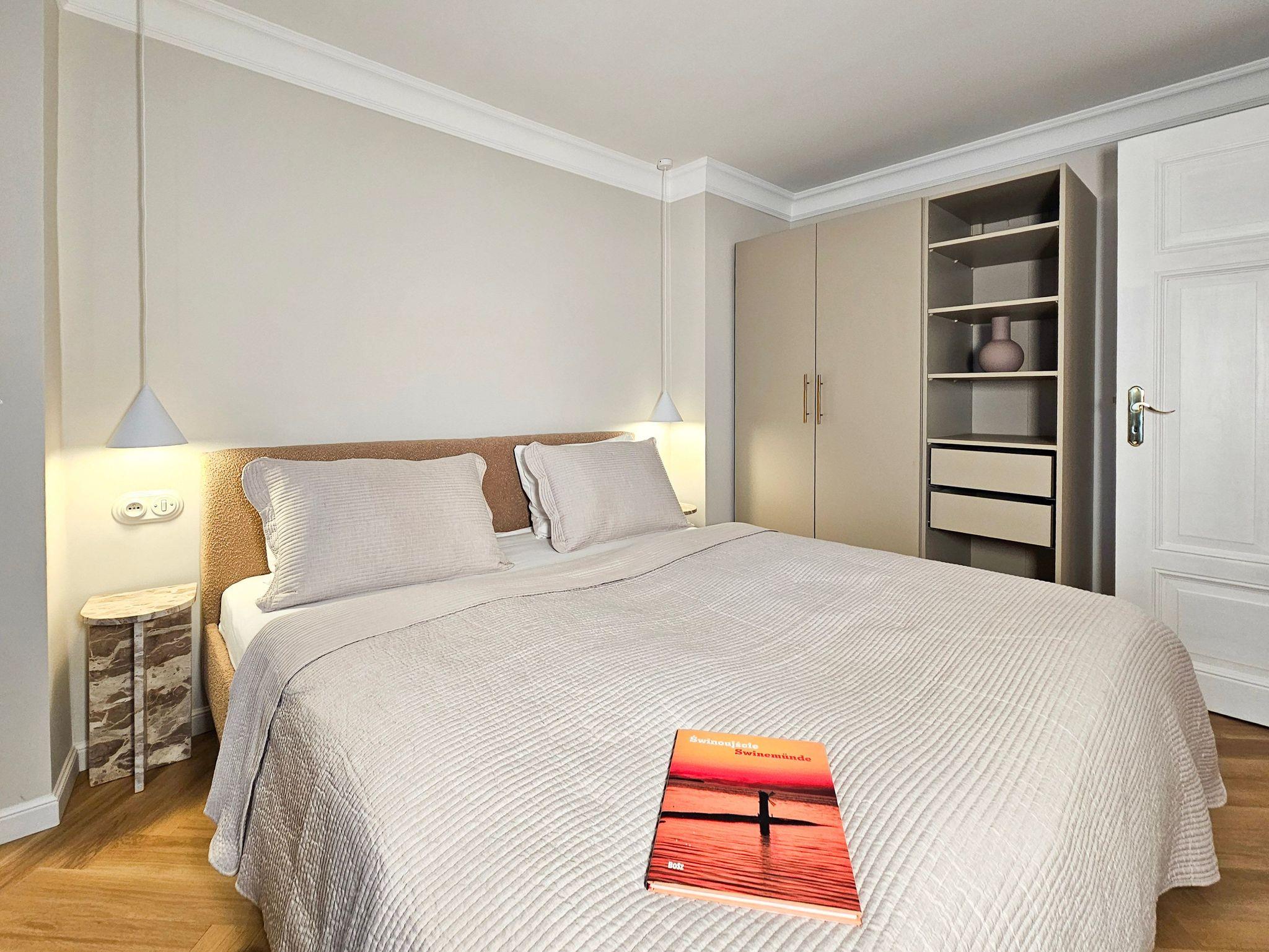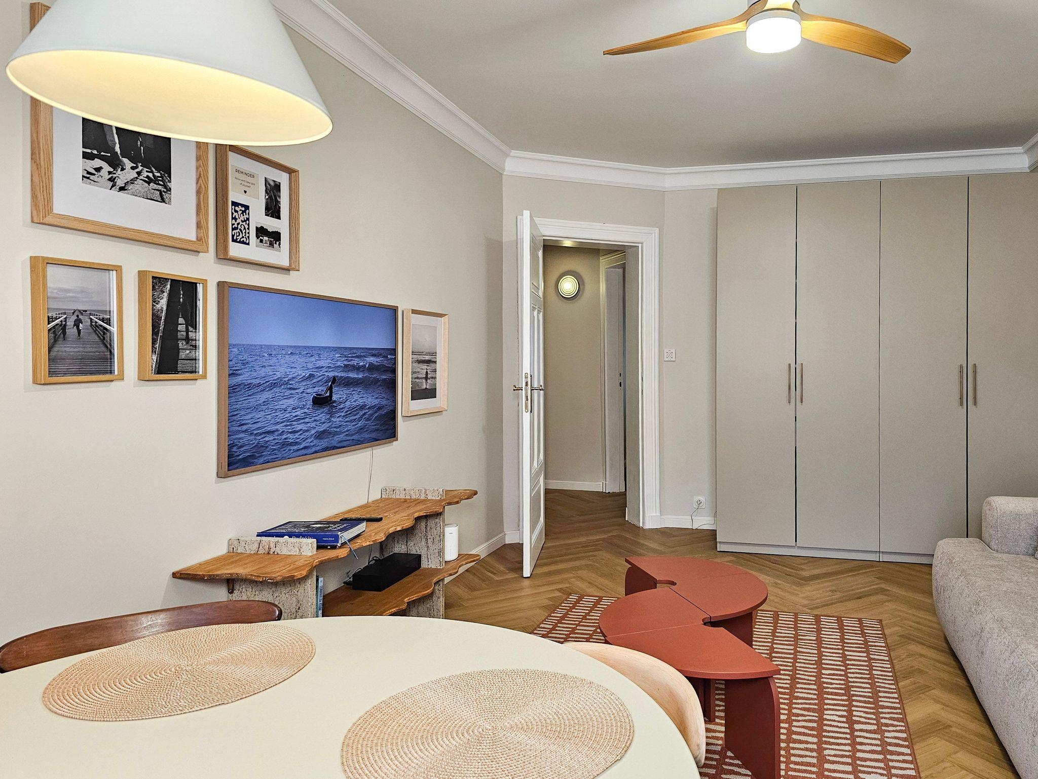 Eine geräumige und stilvolle Ferienwohnung mit einem Schlafzimmer, einem Wohnzimmer, einer Küche und einem Badezimmer, gelegen in einem historischen Mietshaus aus der Wende vom 19. zum 20. Jahrhundert. Sie befindet sich im 4. Stock und ist nur über Treppen erreichbar. Die Wohnung zeichnet sich durch einen hellen, minimalistischen, durchdachten und funktionalen Raum aus.