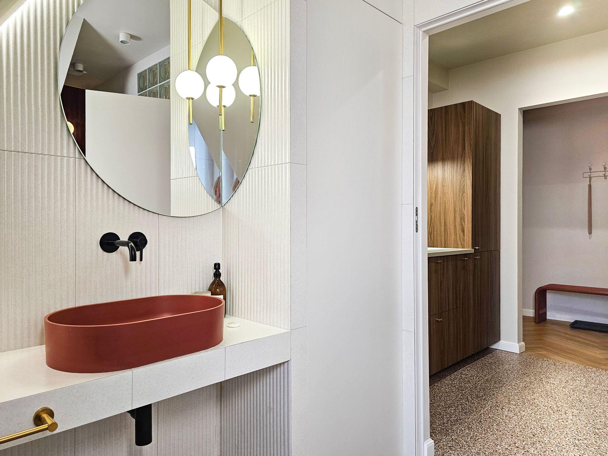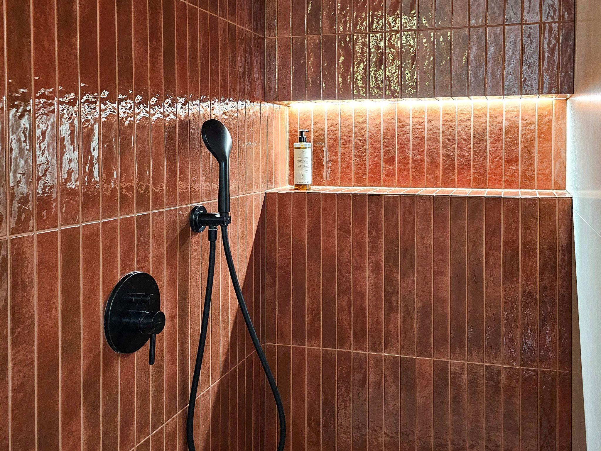 Das Badezimmer, das über die Küche betreten wird, bietet ein Waschbecken, eine Waschmaschine und eine geräumige Duschkabine.