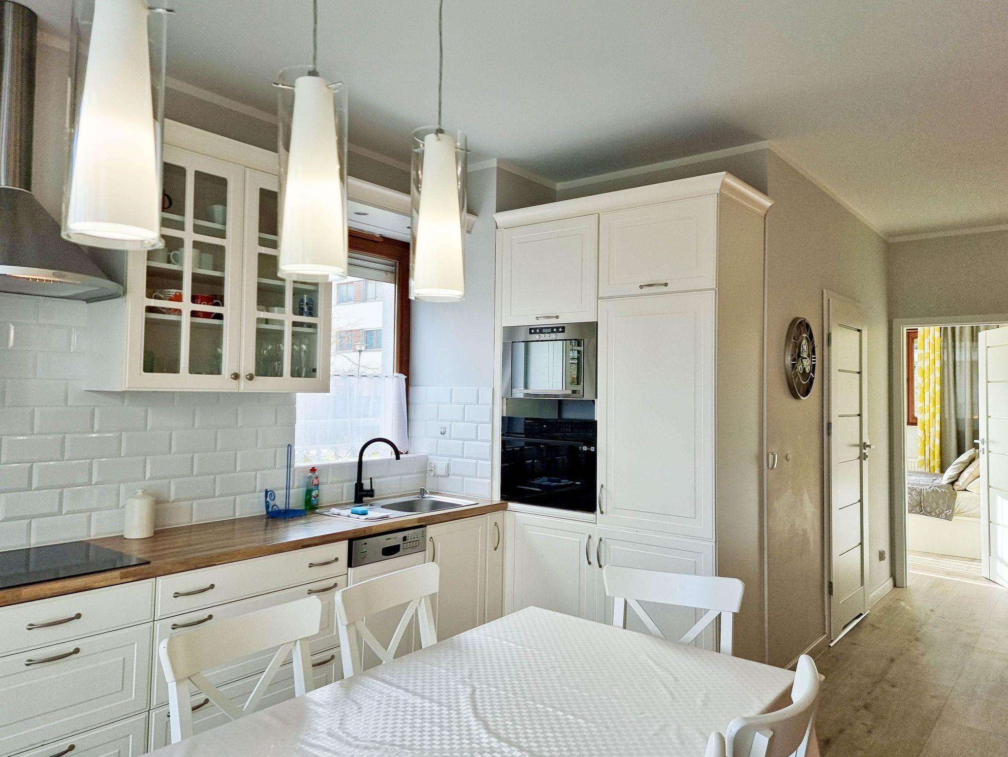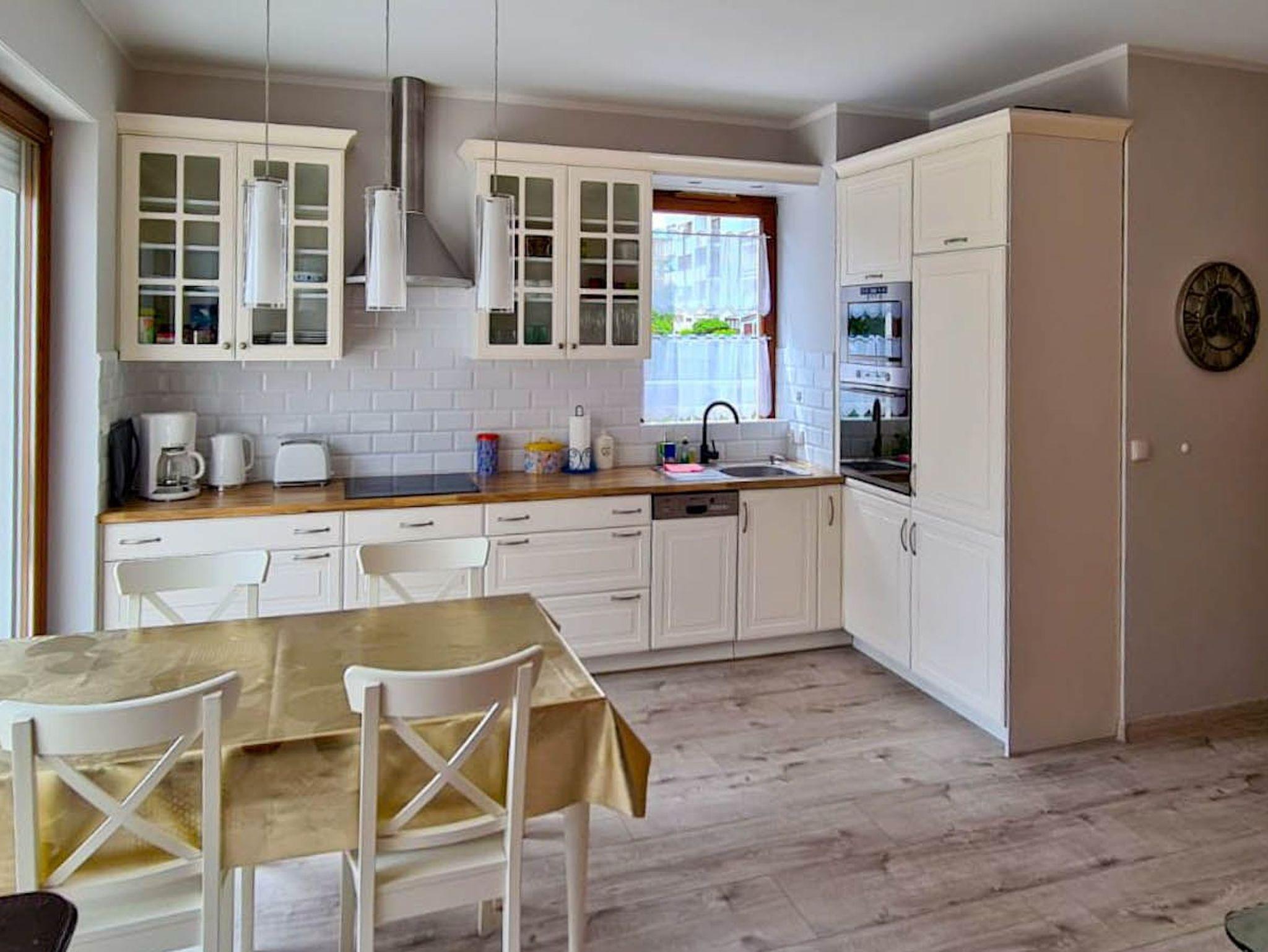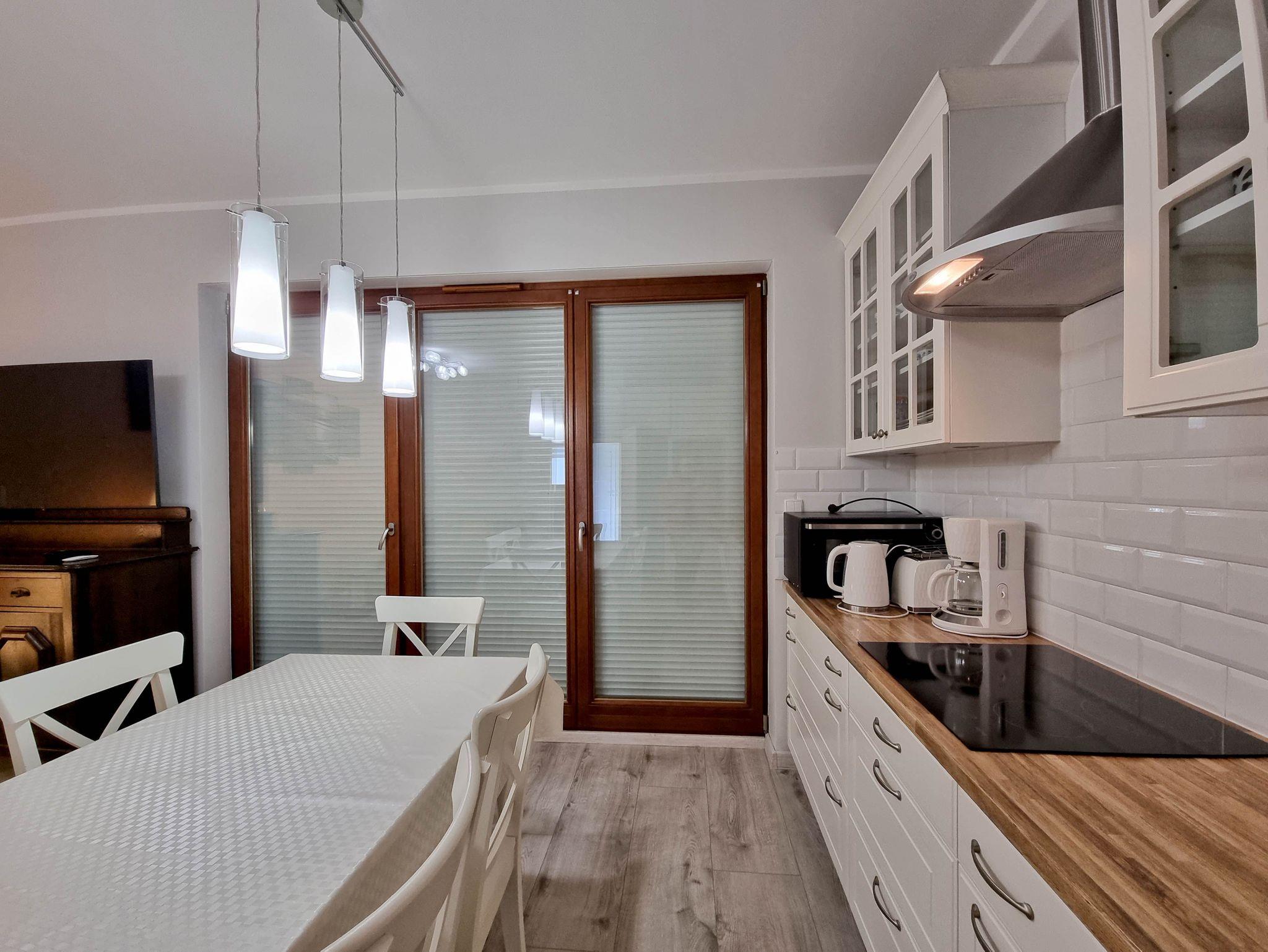 Die Küche ist ein offener Raum, der vom Wohnzimmer aus betreten werden kann. Sie ist mit allen notwendigen Geräten für die Zubereitung und den Verzehr von Mahlzeiten ausgestattet und verfügt über einen großen Kühlschrank mit Gefrierfach, Backofen, Mikrowelle, Geschirrspüler, Induktionsherd mit 4 Kochstellen, Wasserkocher, Toaster und Filterkaffeemaschine.