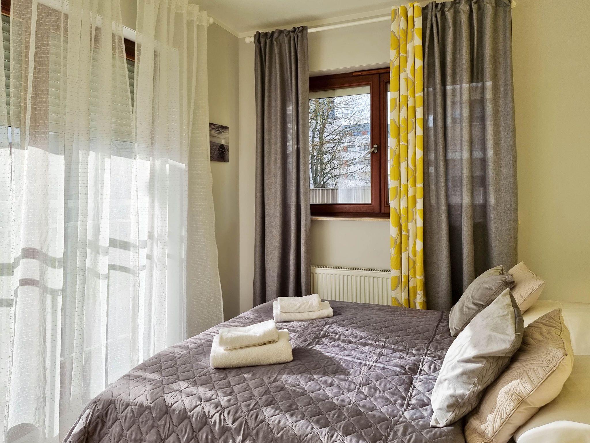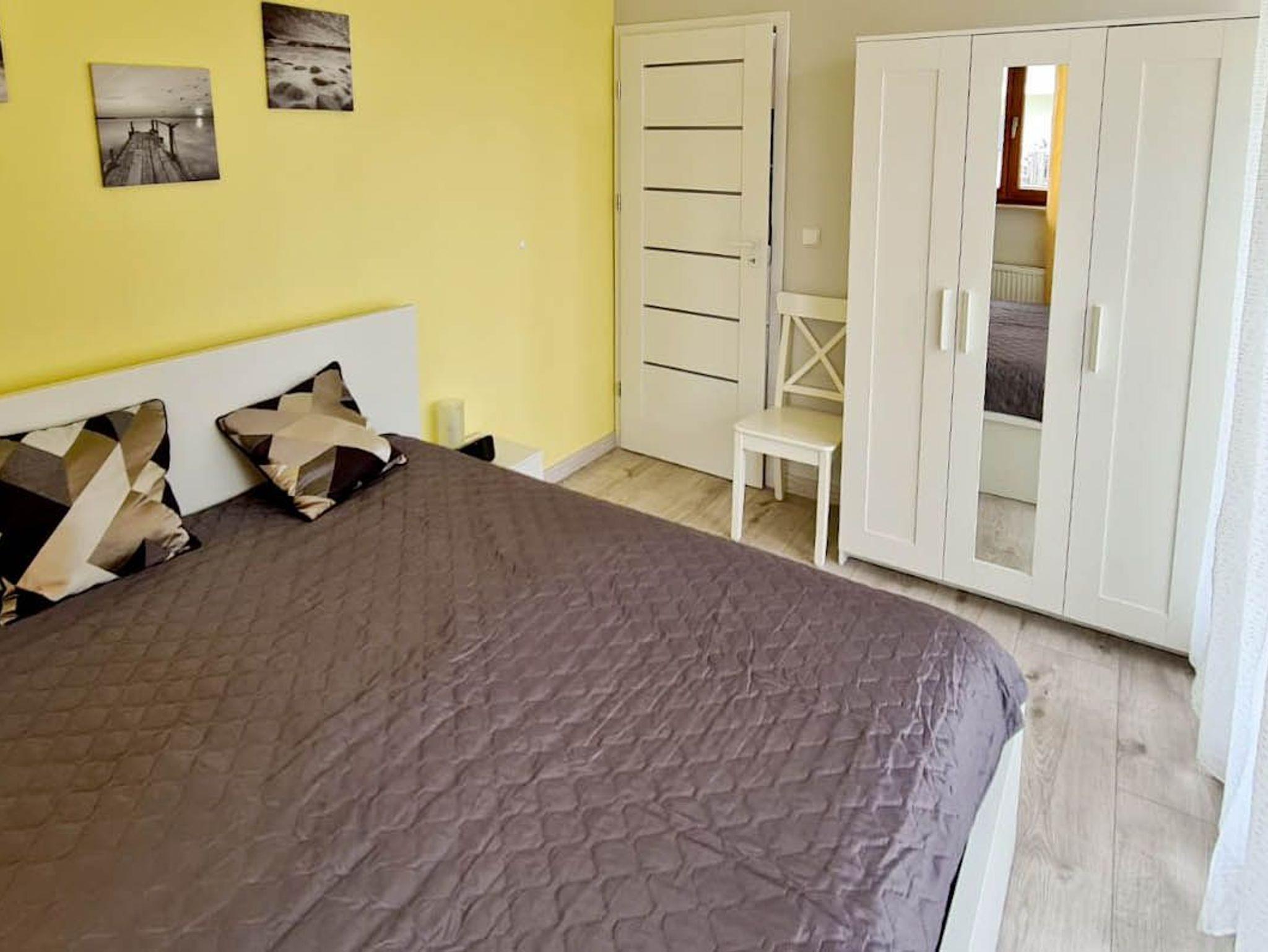 Ein Schlafzimmer hat ein Doppelbett 160x200cm, Nachttische, Lampen, Kleiderschrank. Das zweite Schlafzimmer hat ein 80cmx200cm großes Bett (ausklappbar auf 160x200cm).