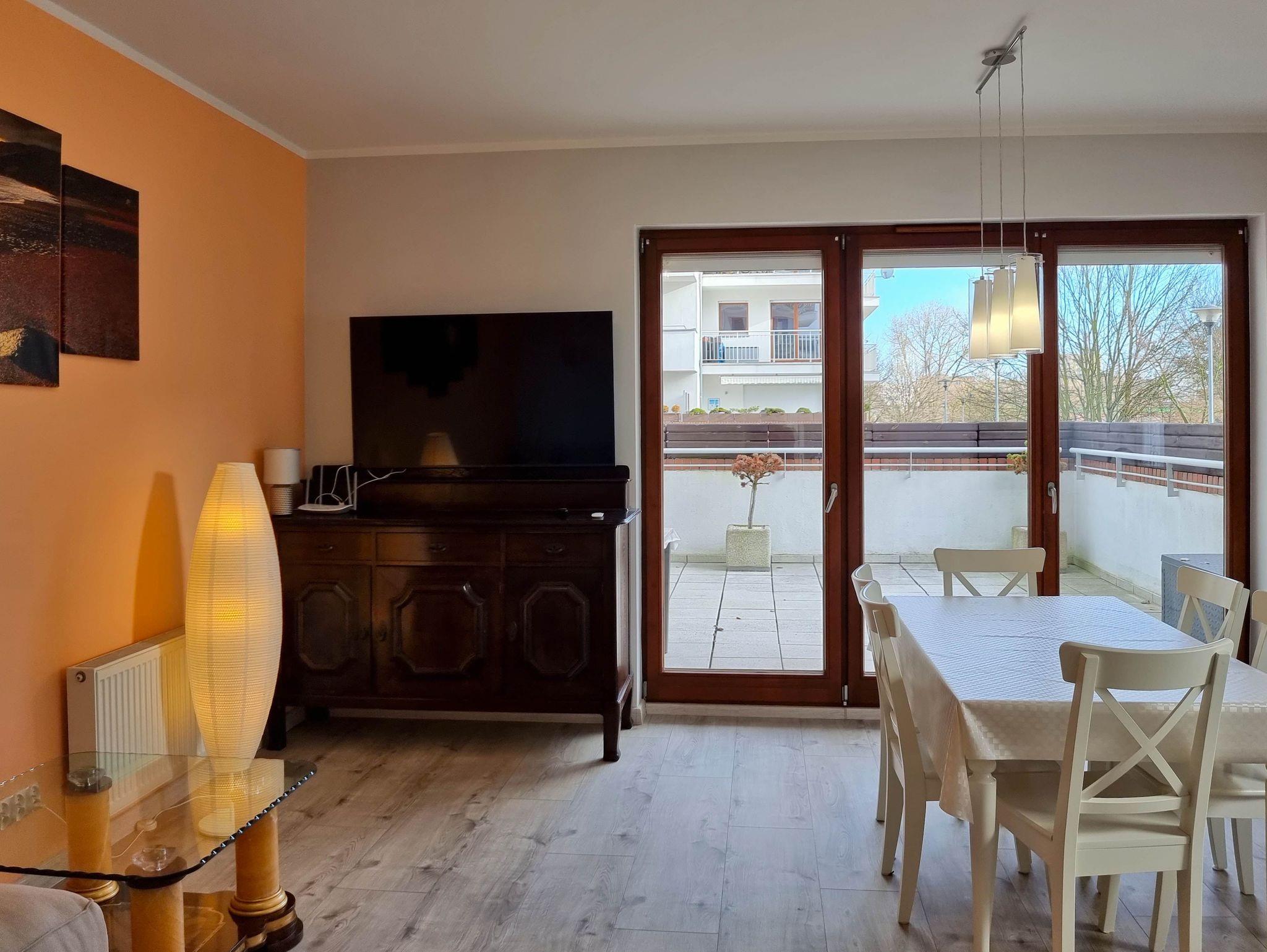 Die Wohnung besteht aus einem Wohnzimmer mit einem Schlafsofa (160x200cm), einer Kommode mit einem Flachbildfernseher und terrestrischem TV, einem Ausgang zu einem großen Platz, wo es Gartenmöbel (ein Tisch mit 4 Stühlen) und eine Küchenzeile gibt.