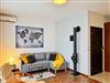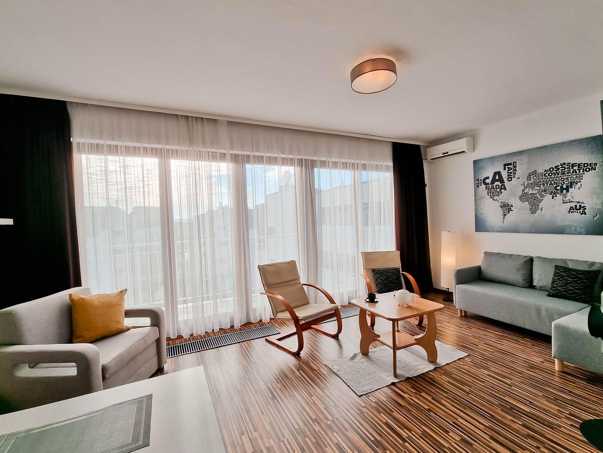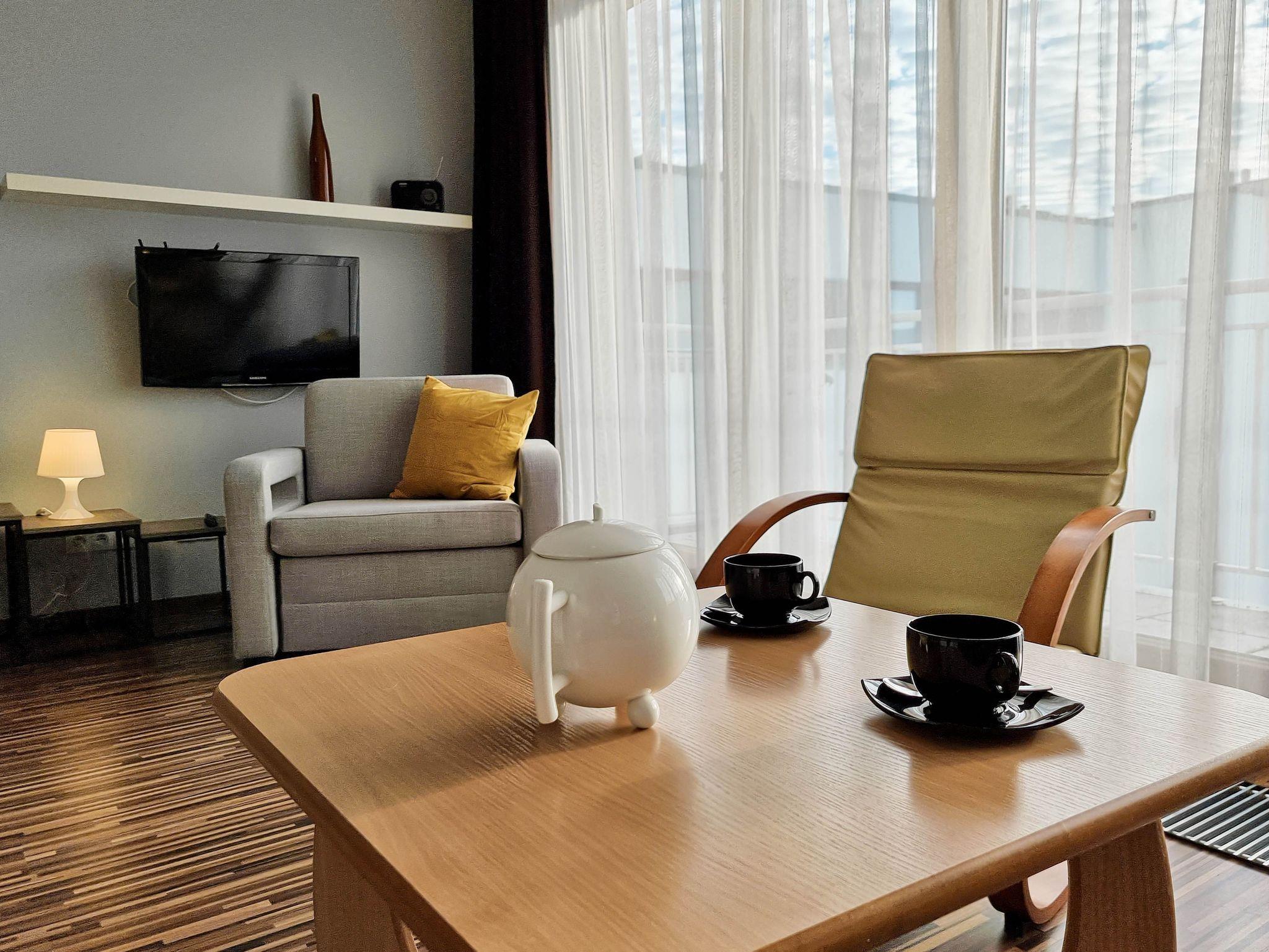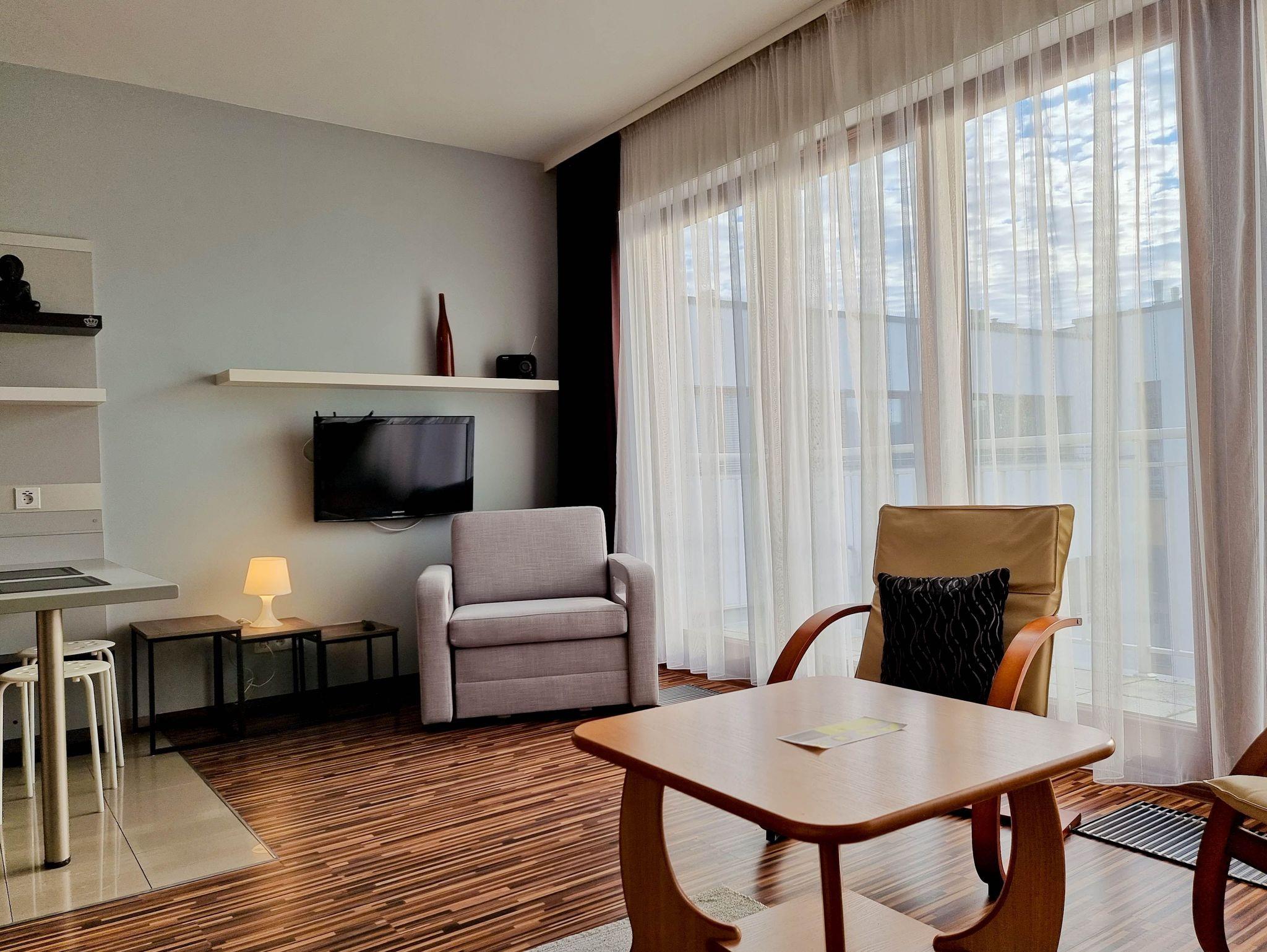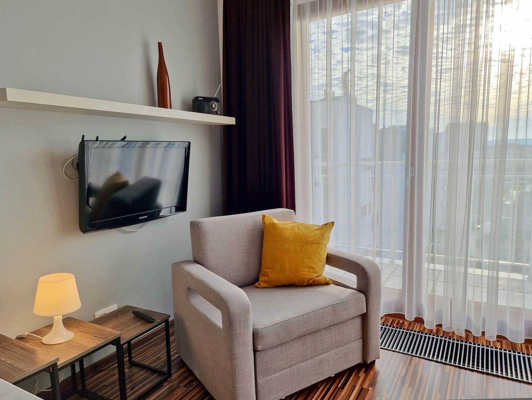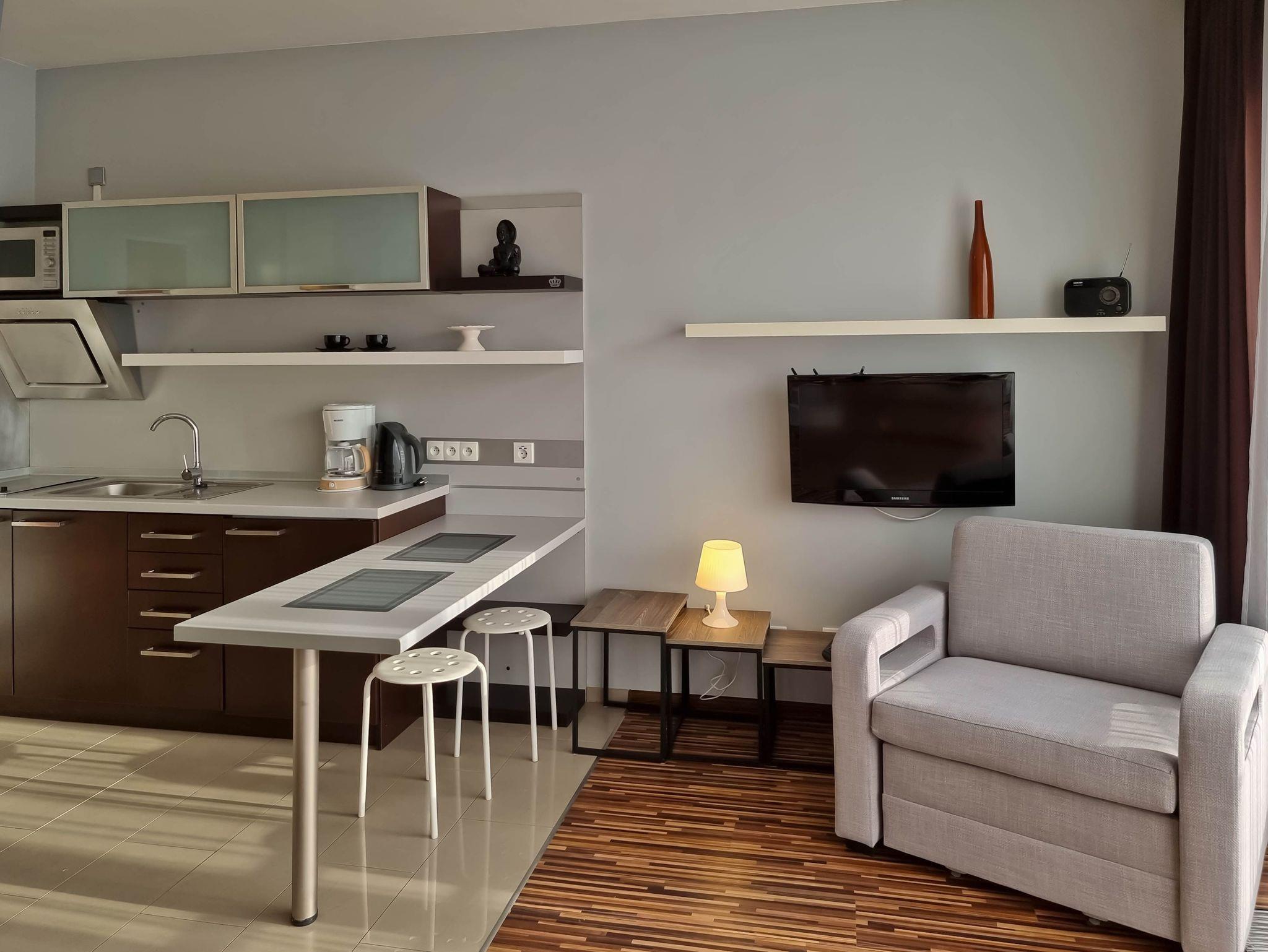 Die 1-Zimmer-Wohnung (31m2) mit Kochnische und Balkon befindet sich im 4. (letzten) Stock eines Gebäudes, das mit einem Aufzug ausgestattet ist. Große, nach Süden ausgerichtete Panoramafenster machen die Wohnung sehr hell, sonnig und warm. Die Wohnung zeichnet sich durch einen großen Balkon mit Blick auf den grünen Innenhof aus. An den Fenstern hängen Vorhänge und dunkle Gardinen. Das geräumige Zimmer ist mit einem Ecksofa mit Schlaffunktion (Fläche nach dem Ausklappen 140x200cm), einem ausklappbaren Sessel mit einer Liegefläche von 70x180cm, 2 Sesseln, einem Couchtisch, einem Fernseher mit Zugang zum lokalen Kabelfernsehen ausgestattet.