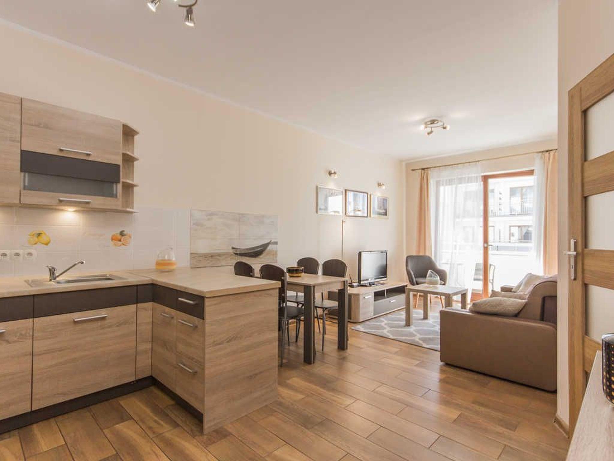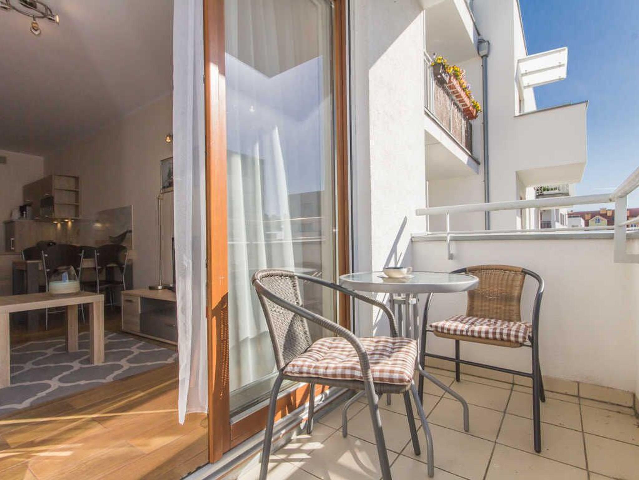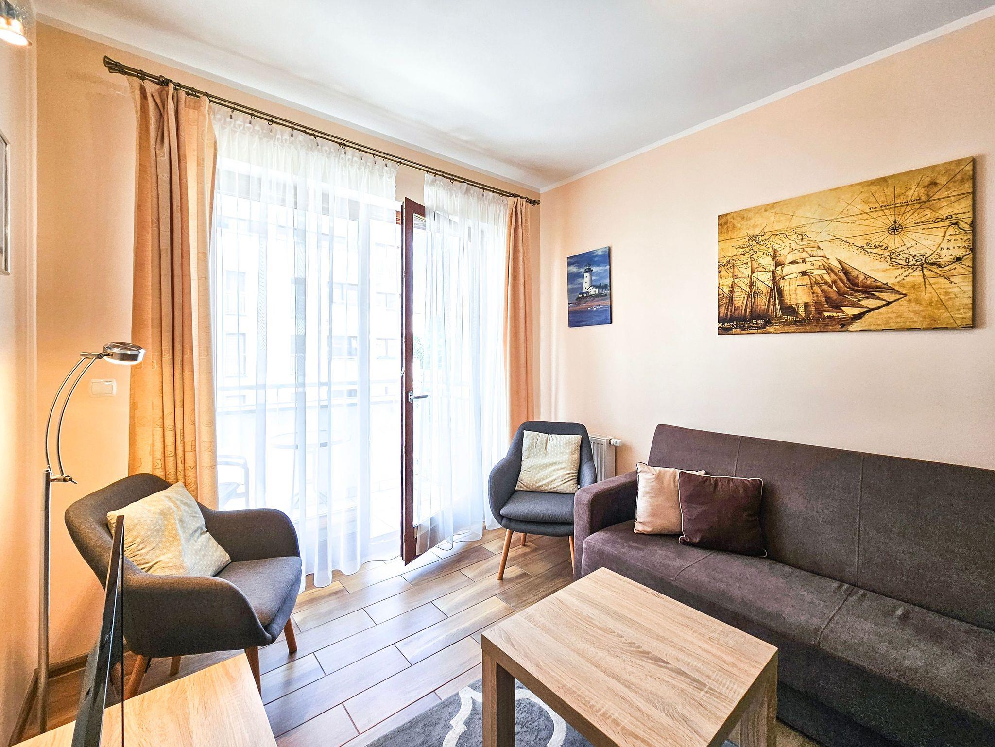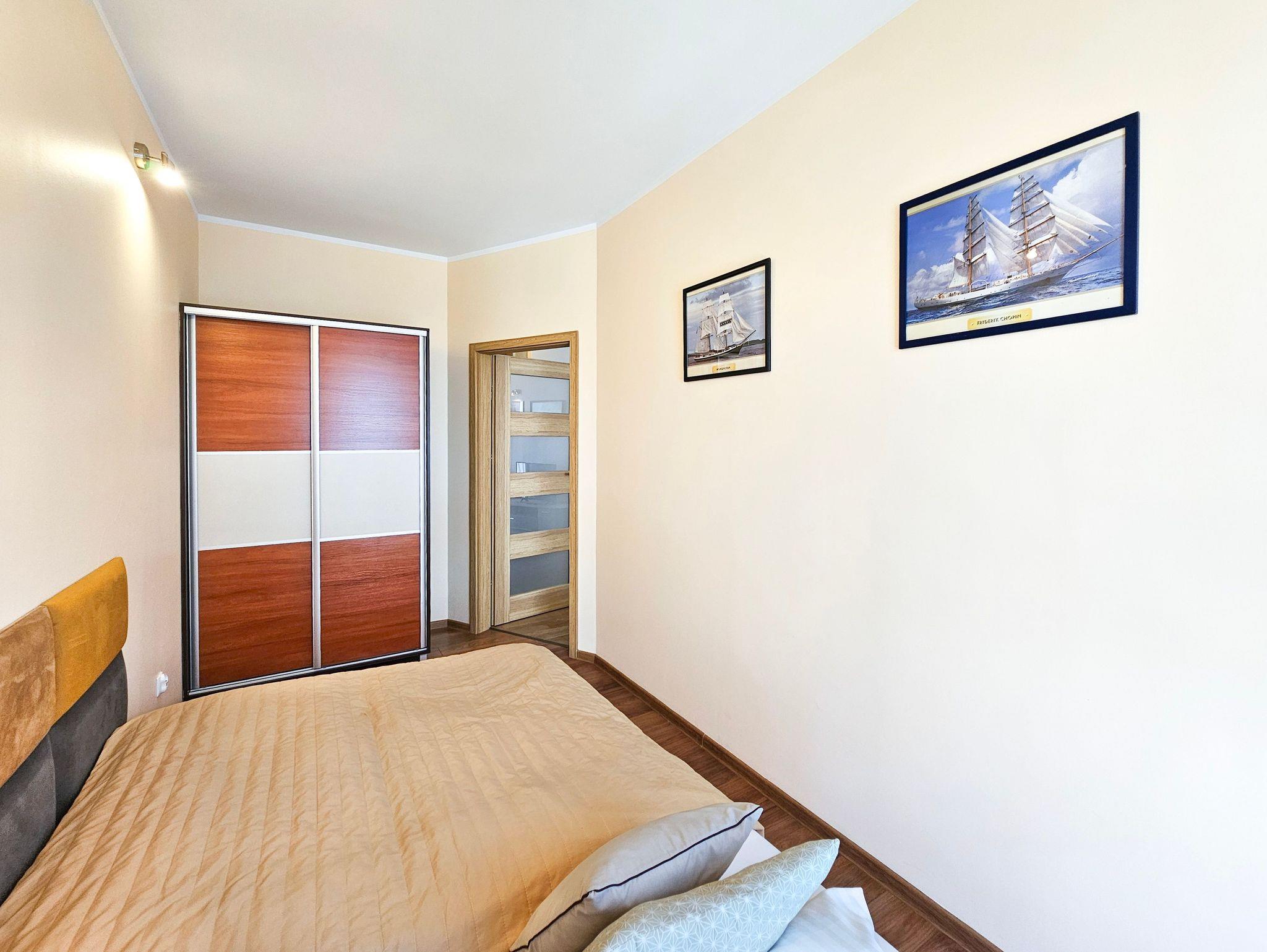 Es besteht aus einem Wohnzimmer mit Küchenzeile, Schlafzimmer, Balkon und Bad mit Dusche und Waschingmaschine. Im Wohnzimmer steht ein gemütliches Schlafsofa für zwei Personen, ein Couchtisch, ein Esstisch mit vier Stühlen und ein Schrank. Im Schlafzimmer befindet sich ein Ehebett. Zwei geräumige Kleiderschränke, eins im Schlafzimmer und der andere im Flur bieten viel Stauraum für die Sachen der Gäste. Die funktionelle, voll ausgestattete Küchenzeile verfügt über einen Kühlschrank mit Gefrierfach, Herd mit Ceranfeld, Backofen, Geschirrspüler, Wasserkocher, Toaster, Kaffeemaschine, Töpfe, Geschirr und Besteck. In der Wohnung ist Kabel-TV. Die Wohnungsfenster und der Balkon sind nach Westen gerichtet. Tiere sing erlaubt.