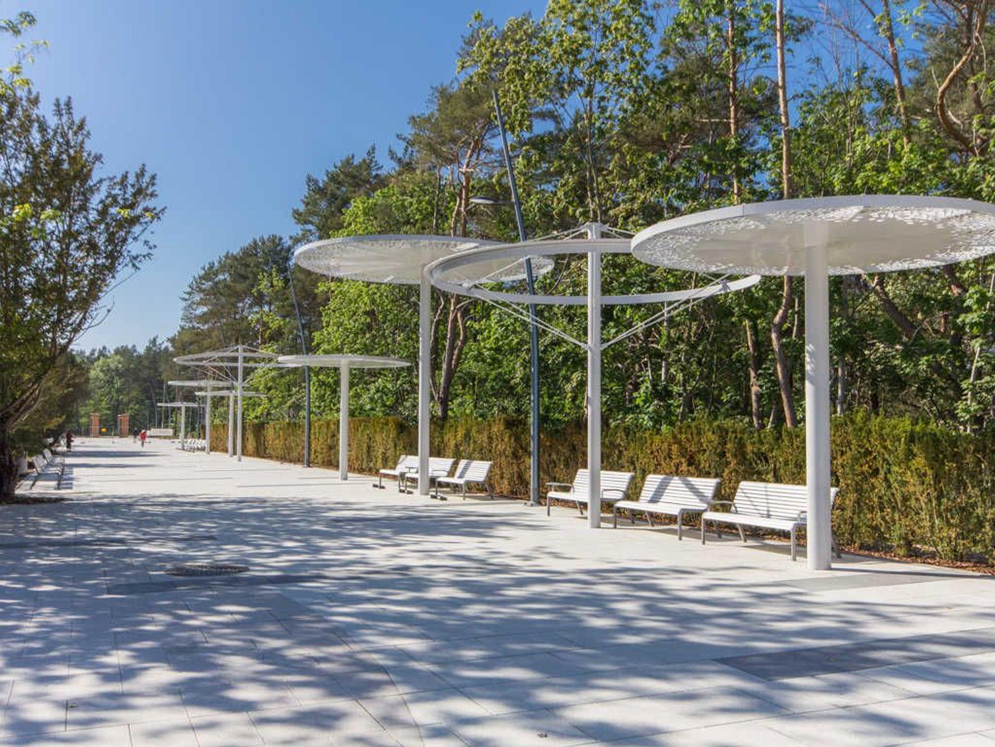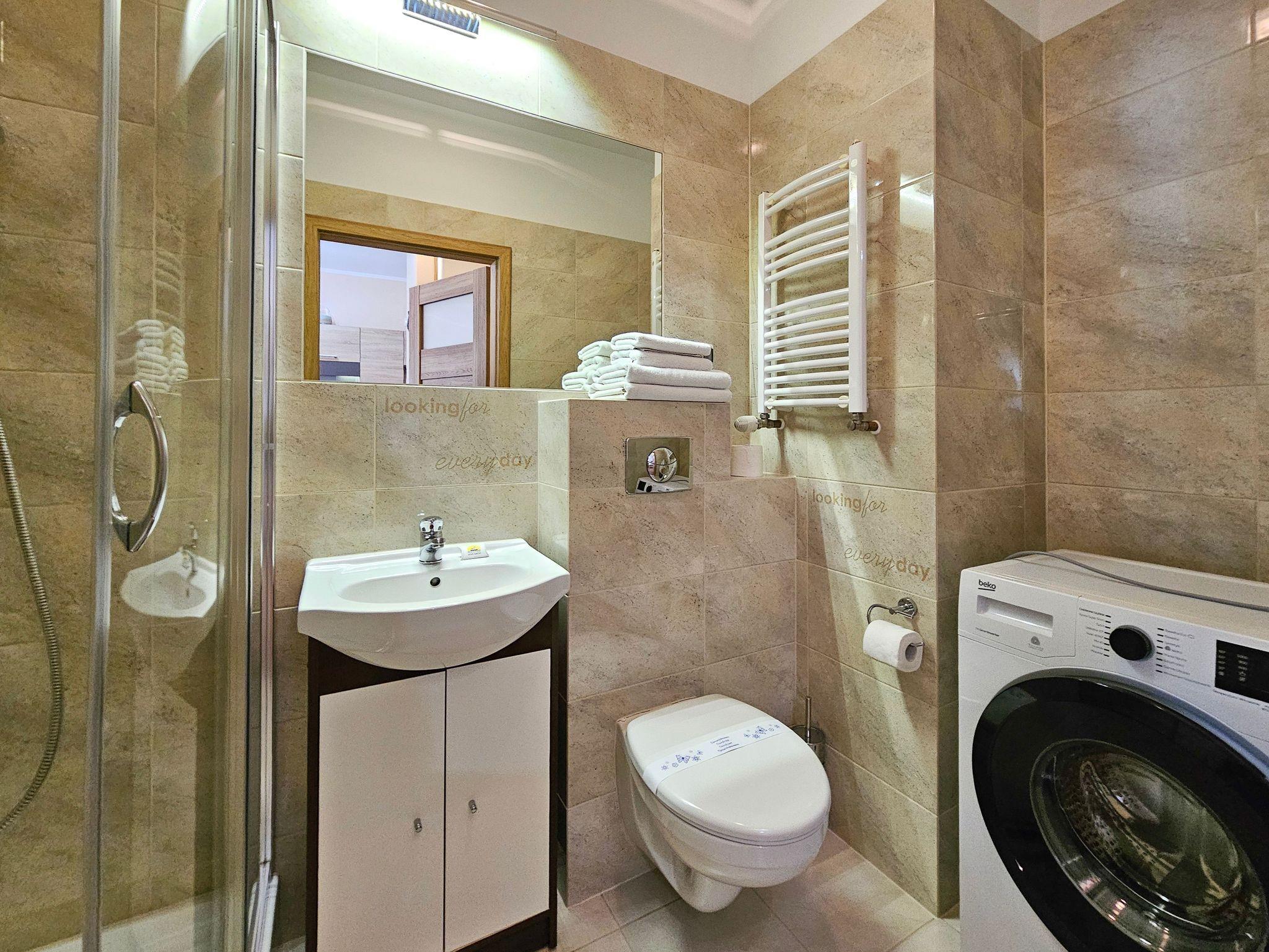 Das Gebäude, in dem sich die Ferienwohnung befindet, liegt in der Wohnsiedlung PLATAN, welche ein modernes und ästhetisches Wohnkomplex ist. Das Gebäude verfügt über einen Aufzug. Auf dem Grundstücksgelände sind viele Grünflächen und Kinderspielplätze, die von Gästen genutzt werden können.