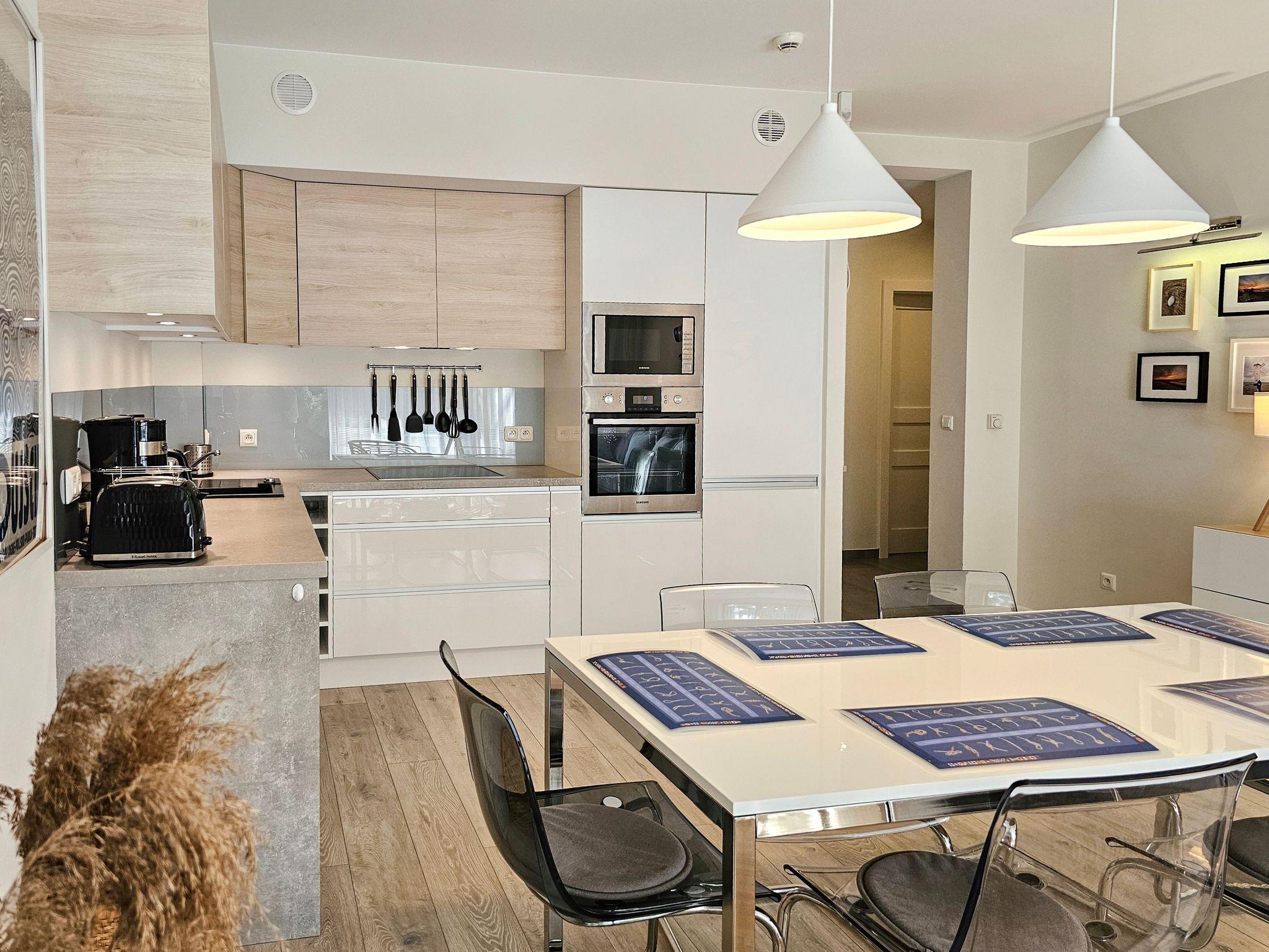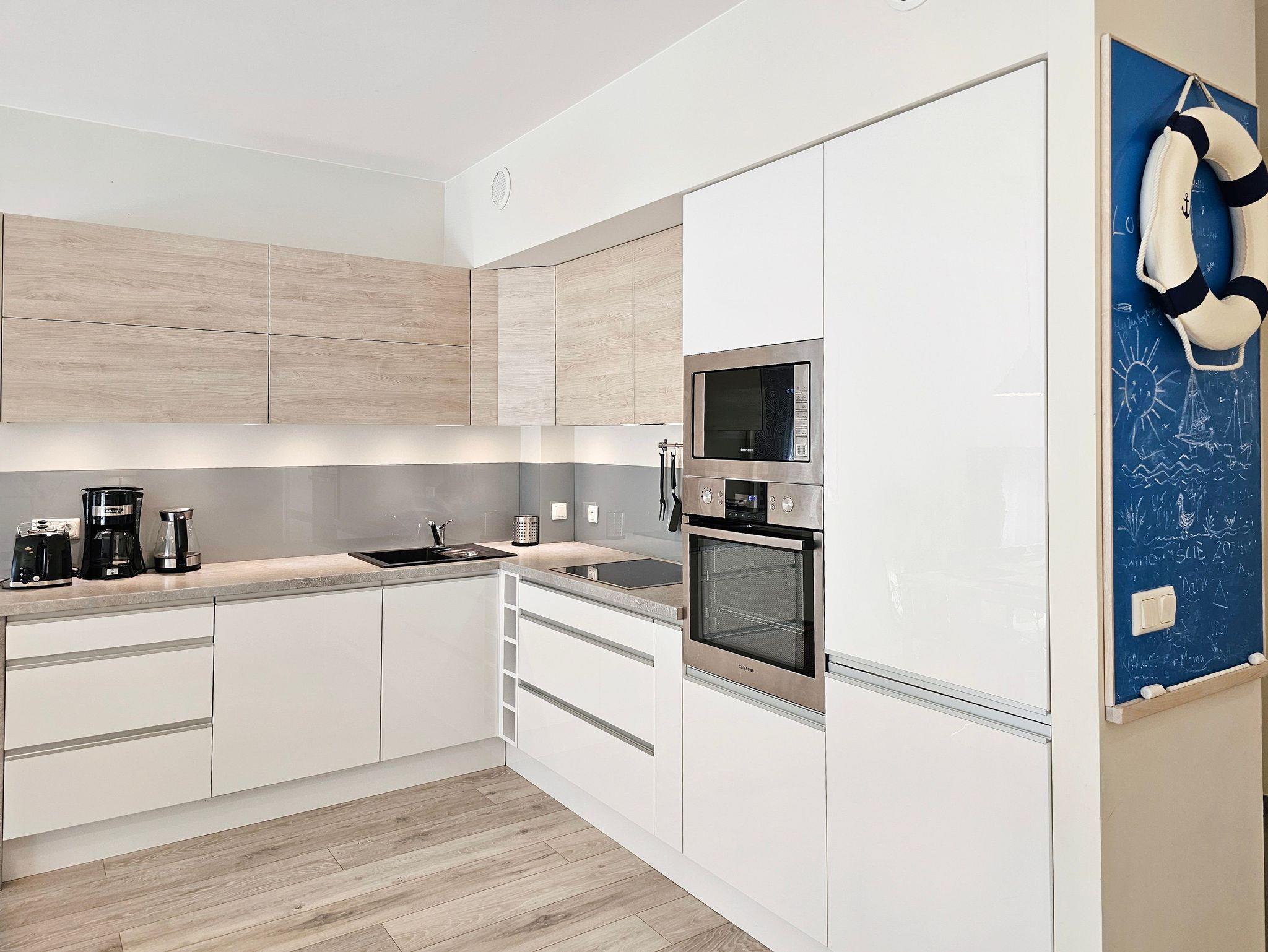 Die Küchenausstattung umfasst notwendige Küchenutensilien, Wasserkocher, Backofen, Geschirrspüler, Toaster, Mikrowelle und eine Dunstabzugshaube.