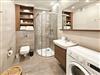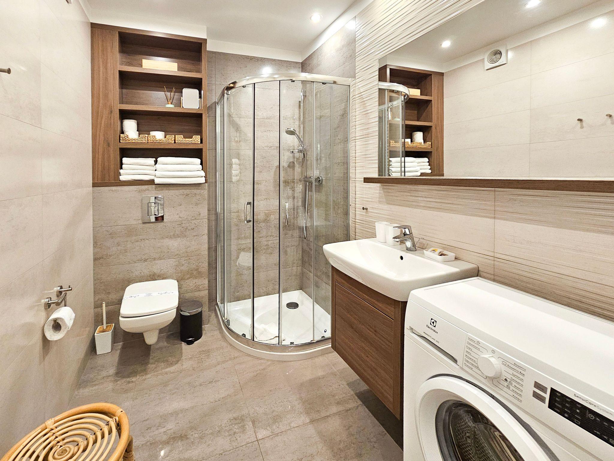 Im Badezimmer befindet sich eine Dusche, ein Waschbecken, eine Toilette und Waschmaschine.