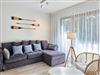 Das Wohnzimmer besteht aus einem ausklappbaren Ecksofa (Fläche nach dem Ausklappen 140x200cm), welches man ebenfalls zum Schlafen nutzen kann, einem Couchtisch, einem Esstisch mit 6 Stühlen und einem Fernseher, der den Empfang polnischer und deutscher Sender ermöglicht.