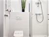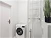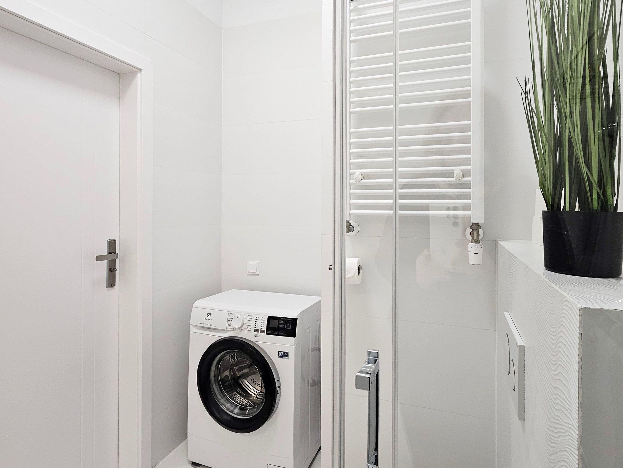 Badezimmer mit Duschkabine, Toilette, Waschbecken und Waschmaschine.