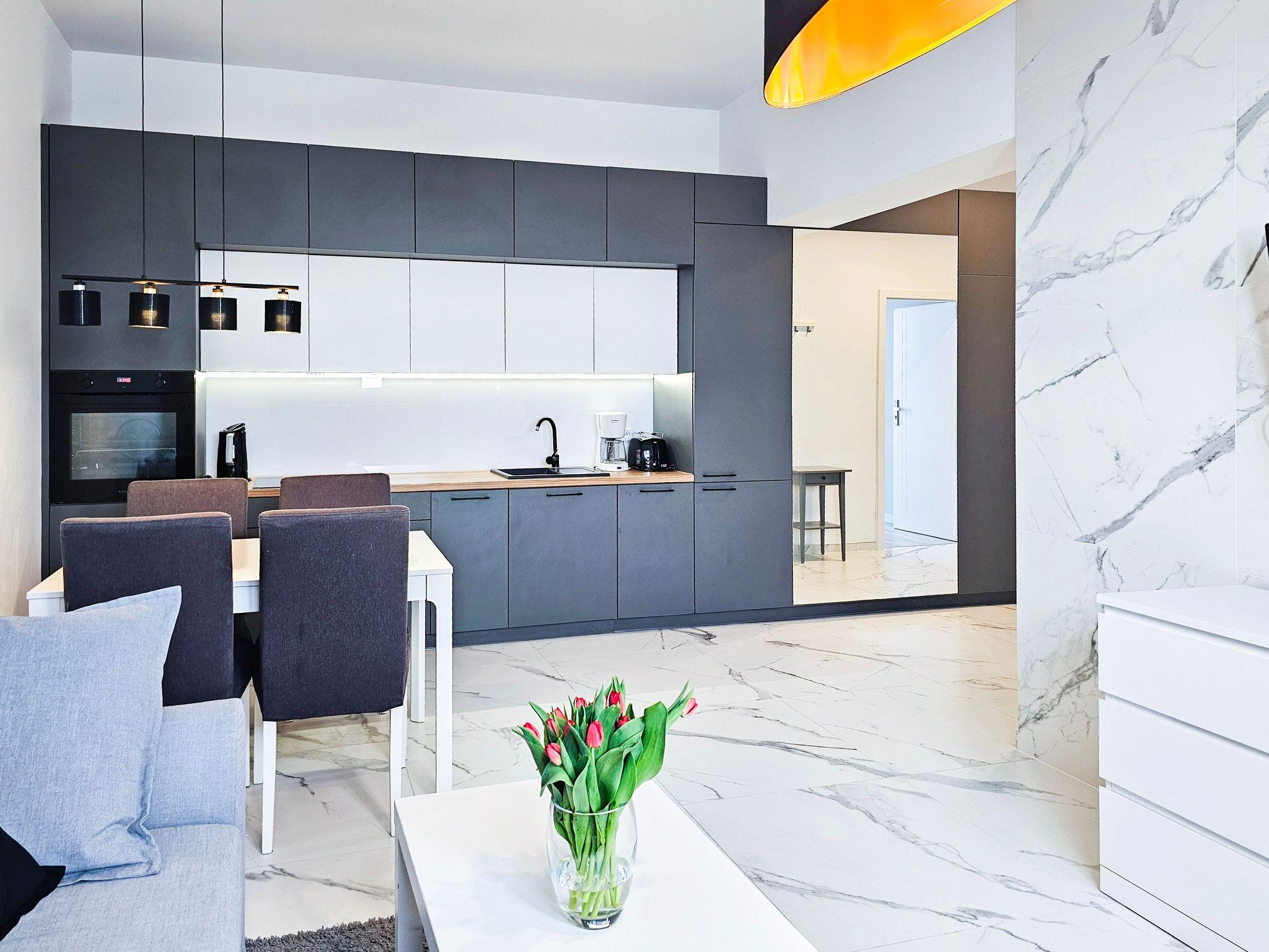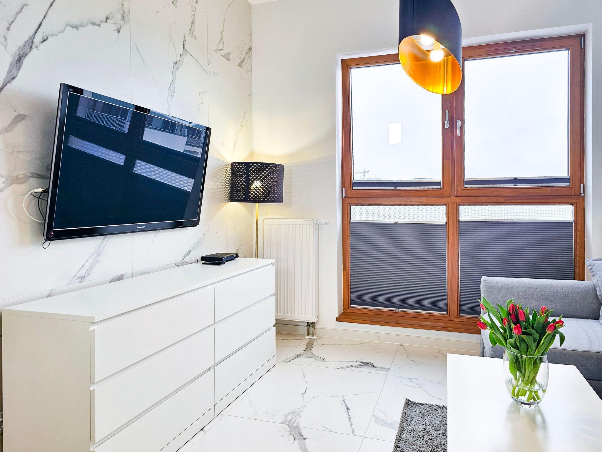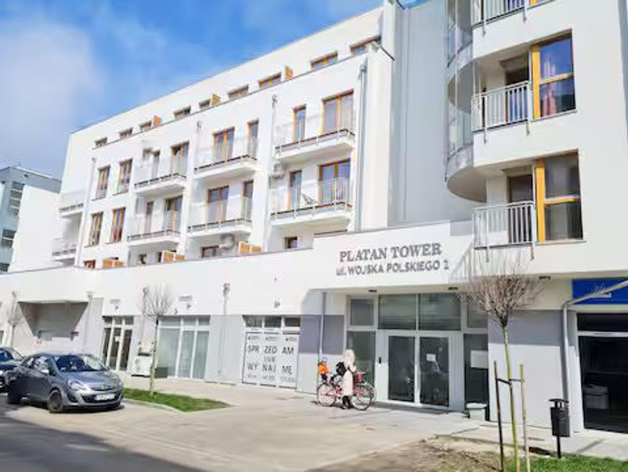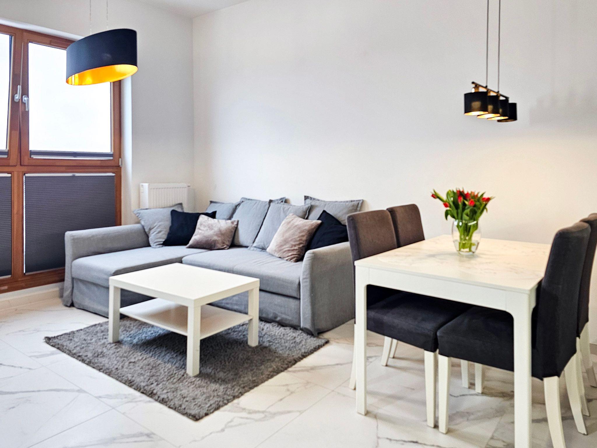 Eine moderne, geräumige, sonnige Zwei-Zimmer-Wohnung mit Balkon in einem Gebäude innerhalb des Platan Tower Komplexes.