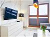 Im Wohnzimmer gibt es ein Ecksofa mit Schlaffunktion, eine RTV-Kommode, einen LCD-Fernseher mit terrestrischem TV, einen Tisch mit 4 Stühlen. Die Küchenzeile ist mit den notwendigen Kochutensilien und Geschirr, Elektroherd mit 4 Kochstellen, Kühlschrank mit Gefrierfach, Backofen, Geschirrspüler, Wasserkocher, Toaster, Kaffeemaschine ausgestattet.