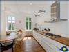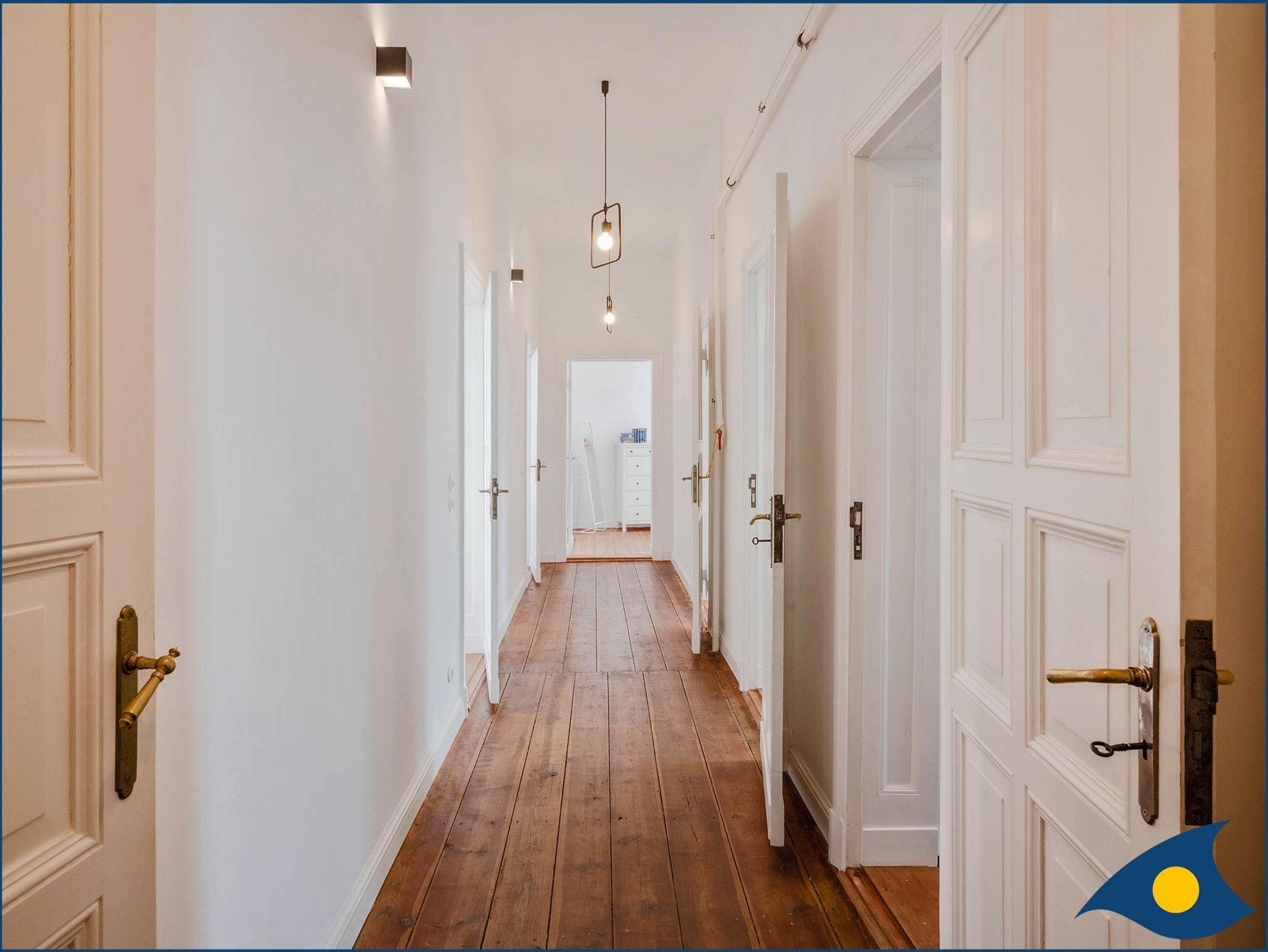 Das Wohnzimmer ist mit zwei bequemen Ledercouchen von Rolf Benz ausgestattet, in allen Zimmern und im Flur sind aufwendig die alten Dielenböden restauriert und erhalten worden. In der Küche ist ebenfalls ein geölter neuer Dielenboden verlegt, die Bäder sind gefliest, die Duschbereiche sind als offene bodengleiche Wohlfühlzonen gestaltet.