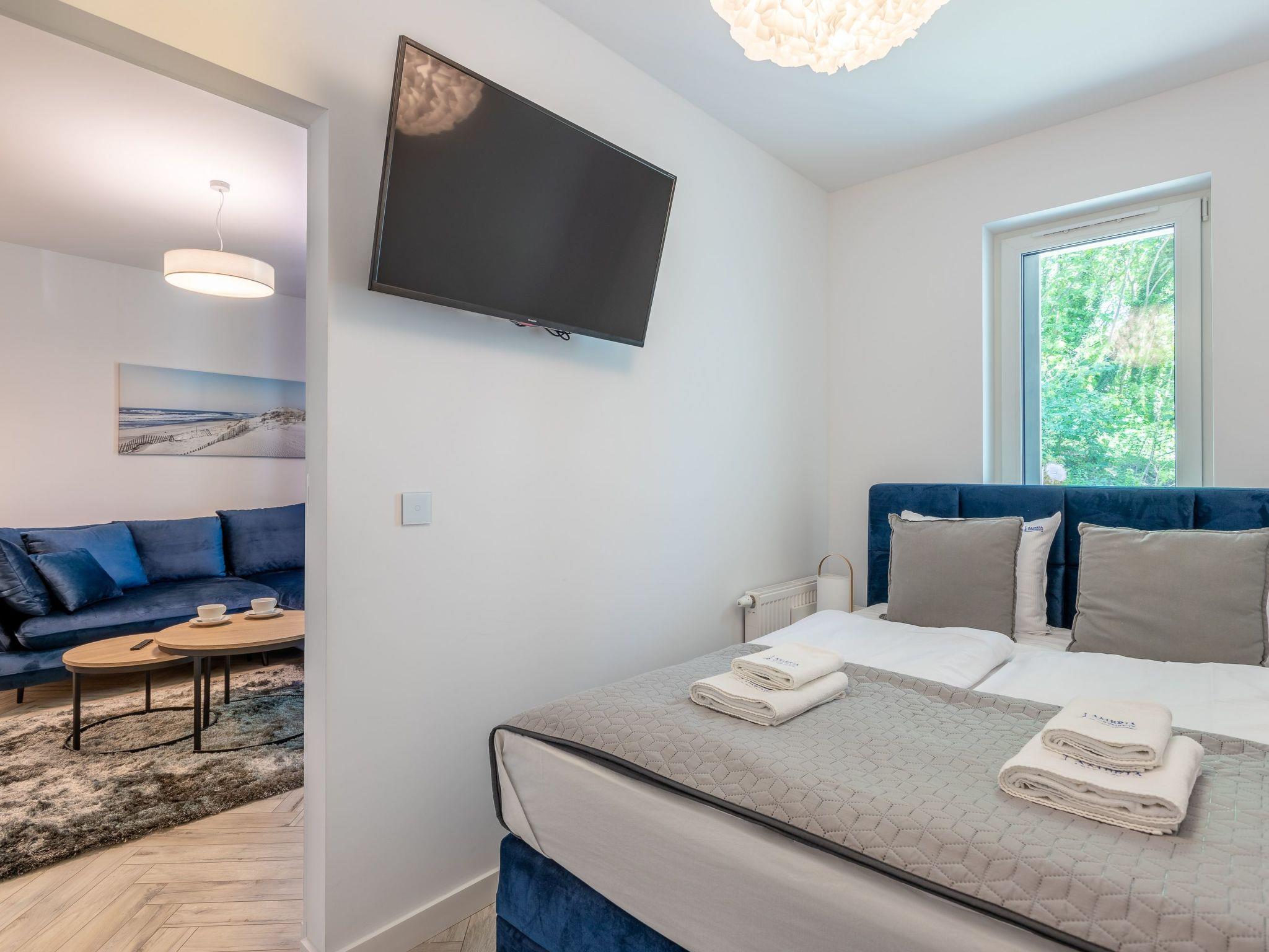 Die Wohnung "Matejki 5" in Swinemünde ist eine elegante Wohnung in einem Apartmenthaus aus dem Jahr 2021. Es handelt sich um eine Wohnung mit einem Schlafzimmer, einem Wohnzimmer mit einer gut ausgestatteten Küchenzeile und einem modernen Badezimmer mit einer Gesamtfläche von 39 m2, sowie einem großen Balkon. Das Interieur ist sehr hell, Weiß, Grau und Beige dominieren, wecken Assoziationen zu Sand, Strand und Sonne, gebrochen mit einem tiefen Blauton und Gold. Zudem ist die Wohnung äußerst gemütlich und zeichnet sich durch schlichte Formen und hohe Qualität aus. Zahlreiche textile und dekorative Accessoires ergänzen den Raum und lassen Sie sich wie zu Hause fühlen. Es ist ein ideales Angebot für Menschen, die während ihres Aufenthalts einige Zeit auf der Couch verbringen möchten, ein Buch lesen oder in einem äußerst bequemen Bett frühstücken möchten.