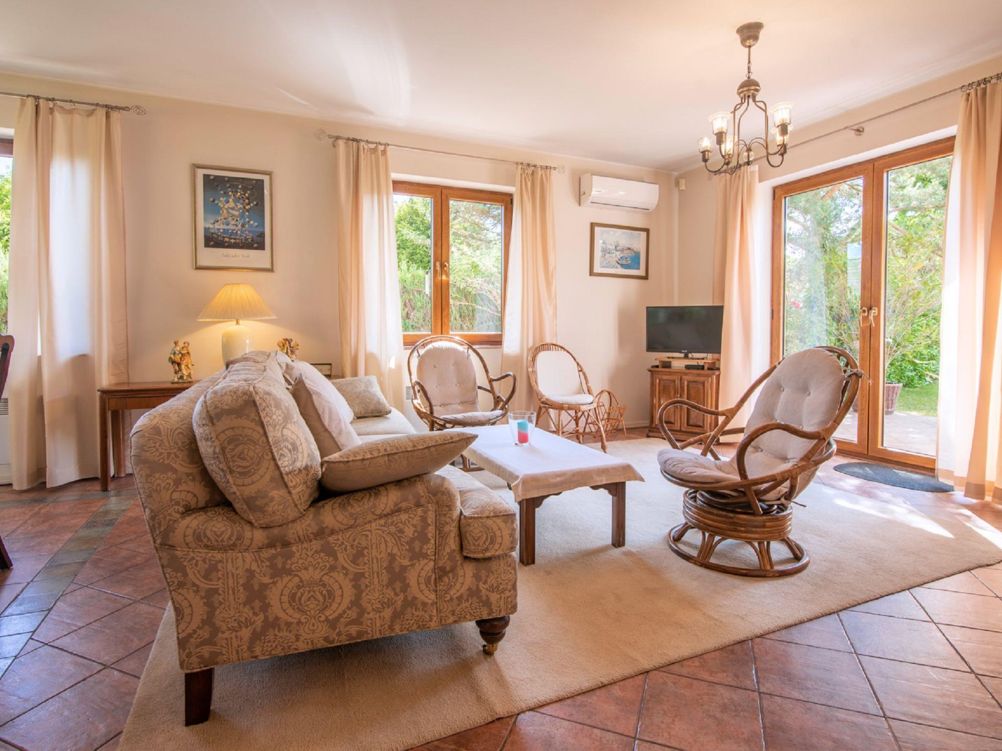 5-Zimmer-Haus 150 m2 auf 2 Stockwerken. Wohn-/Esszimmer mit offenem Kamin, Sat-TV und Radio. Ausgang zum Garten, zur Terrasse. 1 Zimmer mit 1 franz. Bett. Offene Küche (Backofen, Geschirrspüler, 4 Glaskeramikplatten, Mikrowelle, elektrische Kaffeemaschine). Dusche/WC. Obergeschoss: 2 Zimmer, jedes Zimmer mit 1 franz. Bett. Ausgang zum Balkon. 1 Zimmer mit 2 Betten. Bad/Bidet/WC. E-Heizung (extra). Terrassenmöbel, Liegestühle (8). Parkplatz beim Haus. Die Räume im Obergeschoss sind teilweise abgeschrägt.