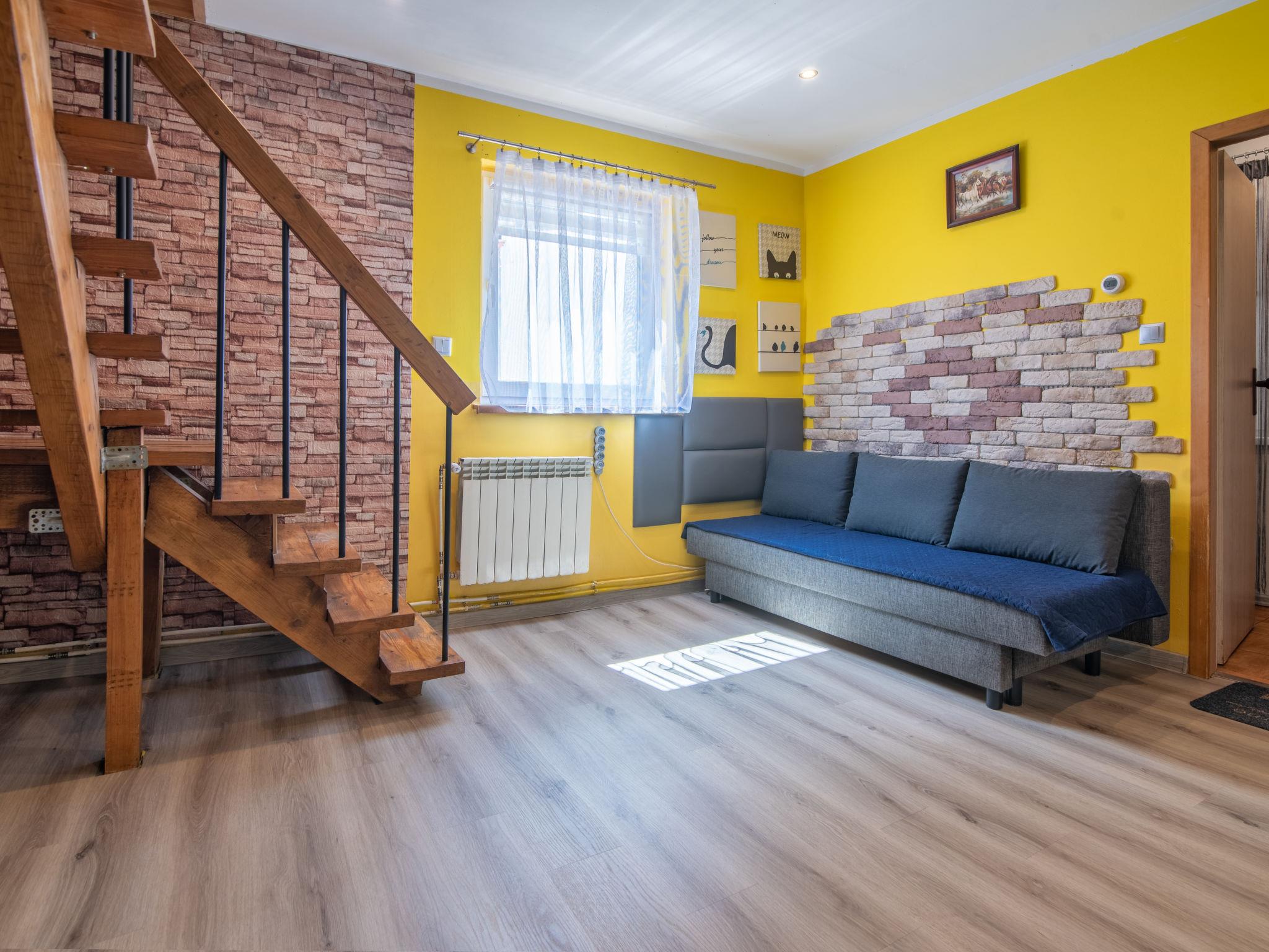 "6 osobowy", 3-Zimmer-Haus 75 m2 auf 2 Stockwerken. Zweckmässig und komfortabel eingerichtet: Wohn-/Esszimmer mit 1 Doppeldiwanbett. Ausgang zur Terrasse. Offene Küche (4 Kochplatten, Backofen) mit Essecke. Dusche/WC. Heizung, G-Heizung. Obergeschoss: 1 Zimmer mit 1 franz. Bett. 1 Zimmer mit 1 franz. Bett. Terrasse 12 m2. Terrassenmöbel, Liegestühle (4). Sicht auf die Ortschaft. Zur Verfügung: Internet (WLAN). Parkplatz beim Haus. Maximal 2 Haustiere/Hunde erlaubt.