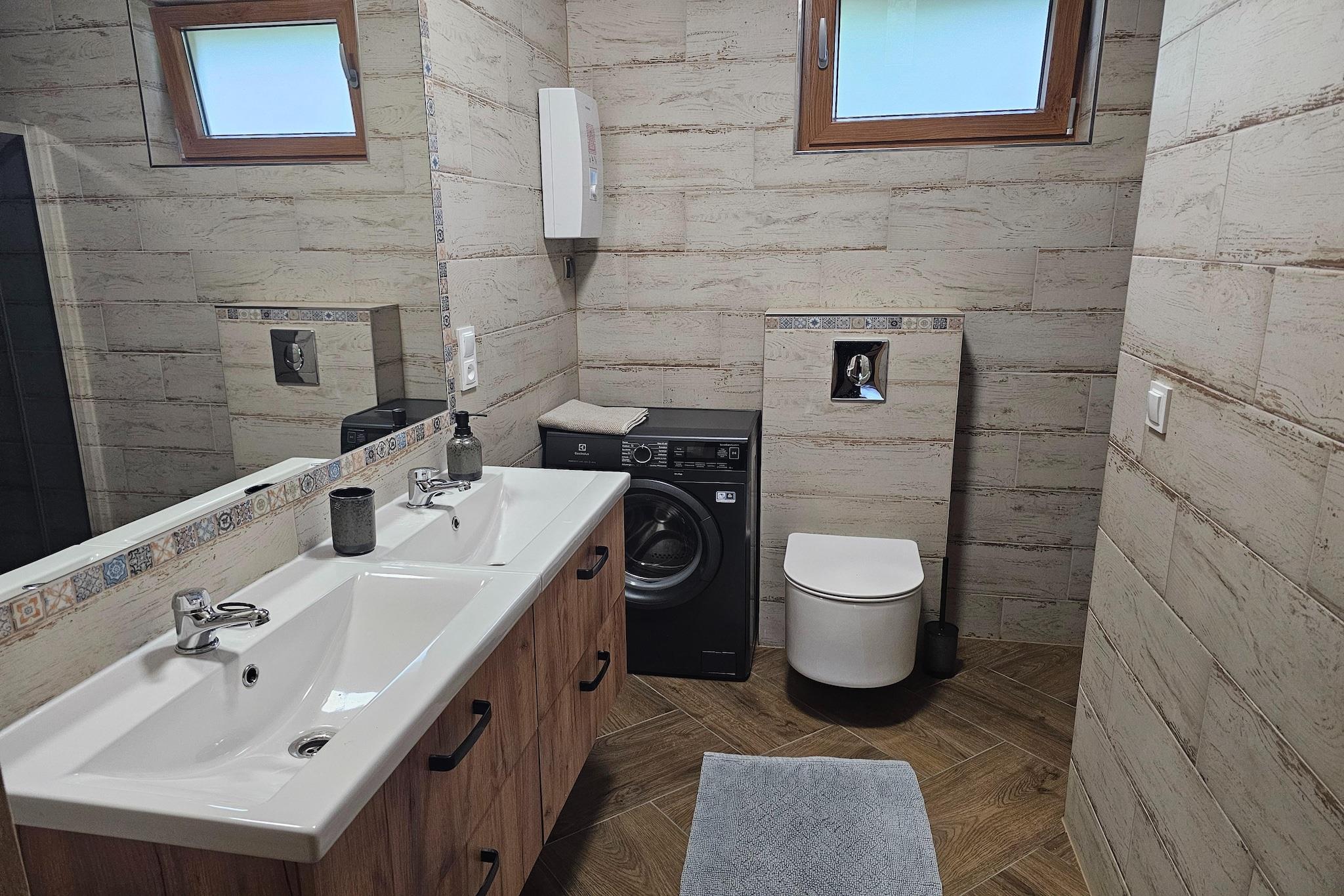 Einstöckiges Ferienhaus direkt am Ufer des Wierzchowo-Sees (Landschaftsschutzgebiet). Auf dem Privatgrundstück befinden sich insgesamt 2 identische Häuser, deren Gästen 1 Hektar eingezäuntes Gelände (inkl. 200 m Privatstrand am See) zur Verfügung steht. Das komfortable Ferienhaus bietet einen großzügigen Wohnraum (Kamin, Sat-TV, Schlafcouch, großer Tisch) mit direktem Blick auf den See. Das Wohnzimmer ist mit einer gut ausgestatteten Küche verbunden. Das Haus verfügt über 3 separate Doppelschlafzimmer und 2 Badezimmer mit Duschen (eines davon hat auch eine Waschmaschine). Das Ferienhaus verfügt über eine überdachte Terrasse mit Gartenmöbeln. Der Blick auf den See von der Terrasse ist ebenso malerisch wie der vom Wohnzimmer. Das Haus wird durch einen Kamin im Wohnzimmer beheizt (dies ist eine effiziente Heizquelle). WLAN ist verfügbar. Am Privatstrand gibt es einen Grillplatz und einen Angelsteg, außerdem liegen dort mehrere Ruderboote vor Anker. Die Nutzung des Bootes ist kostenlos, eine Reservierung beim Eigentümer ist jedoch erforderlich. Gegen eine zusätzliche Gebühr können Sie einen Bootsmotor mieten. Sie können beim Eigentümer der Unterkunft auch Fahrräder mieten. Im Preis Ihres Aufenthalts inbegriffen: Bettwäsche, Handtücher, Strom- und Wasserverbrauch, Brennholz, Endreinigung, Internet, Parkplatz. Im Preis inbegriffen ist auch die Nutzung eines Ruderbootes, hierfür ist jedoch eine vorherige Reservierung erforderlich. Hochstuhl nach vorheriger Reservierung kostenlos erhältlich. Der Wierzchowo-See ist ein Paradies für Angler. Der Stausee hat eine Fläche von 750 Hektar. Das Wasser ist kristallklar, sodass der See auch für Badefreunde äußerst einladend ist. Der Eigentümer des Grundstücks wohnt im Zentrum des Dorfes Grabczyn, ca. 3 km vom See entfernt. Zu den Einrichtungen vor Ort gehören ein Tennisplatz und eine Tischtennisplatte (gegen Gebühr).