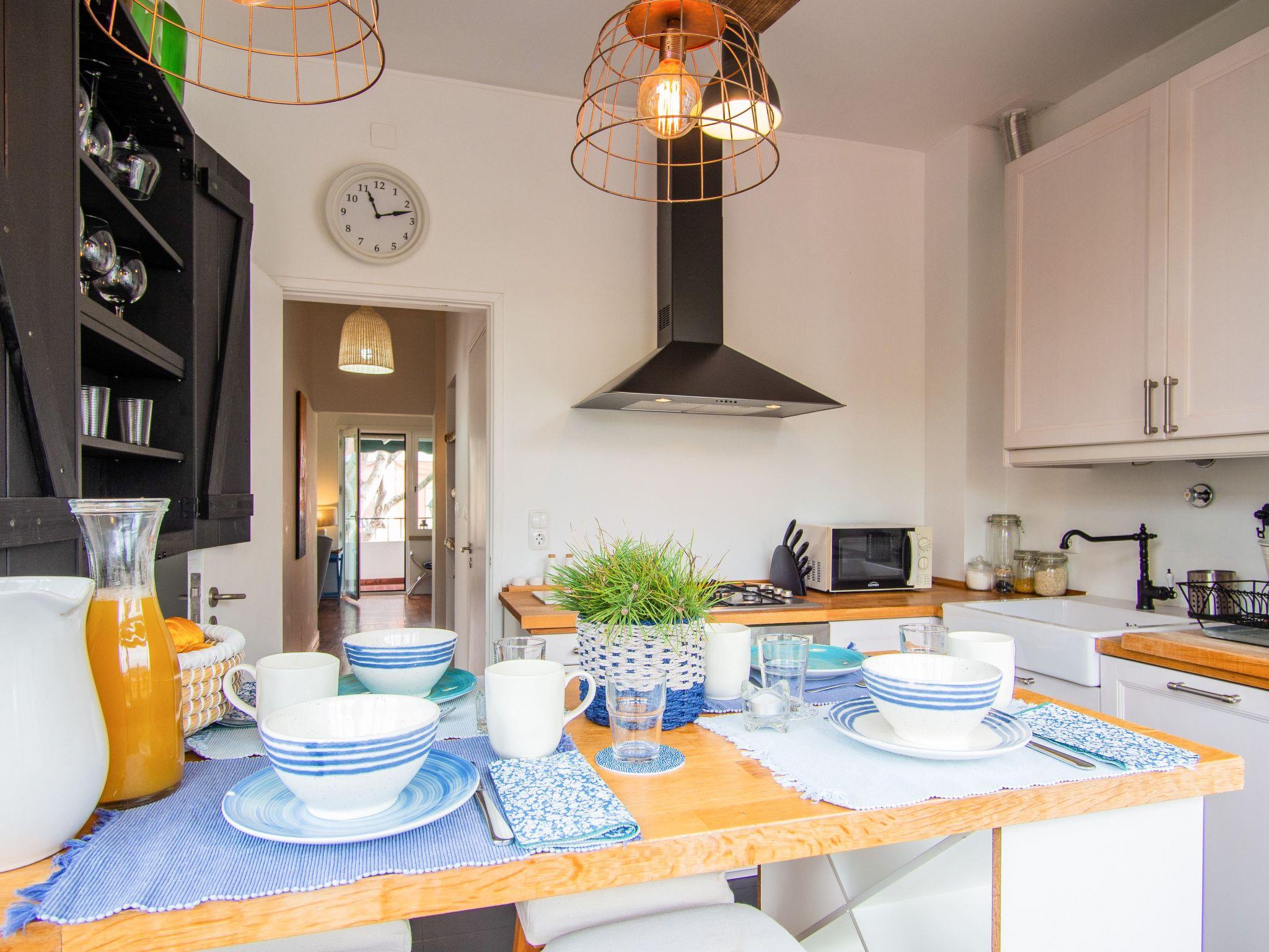 Die helle Ferienwohnung befindet sich im Erdgeschoss und bietet bequem Platz für vier Personen. Sie verfügt über zwei Schlafzimmer mit einem Doppelbett und zwei Einzelbetten. Das geräumige Wohn- und Esszimmer verfügt über einen Kamin, ein Sofa, eine Bank und einen Glas-Esstisch mit vier Stühlen. Die große Küche ist komplett ausgestattet mit Gasherd, Backofen, Kühl- und Gefrierschrank, Mikrowelle, Wasserkocher, Toaster, Kaffeemaschine und Geschirrspüler. Es gibt auch einen hohen Tisch mit Hockern zum Essen. Das Badezimmer hat eine Dusche, ein Waschbecken und eine Toilette. WiFi-Internet ist ebenfalls verfügbar.