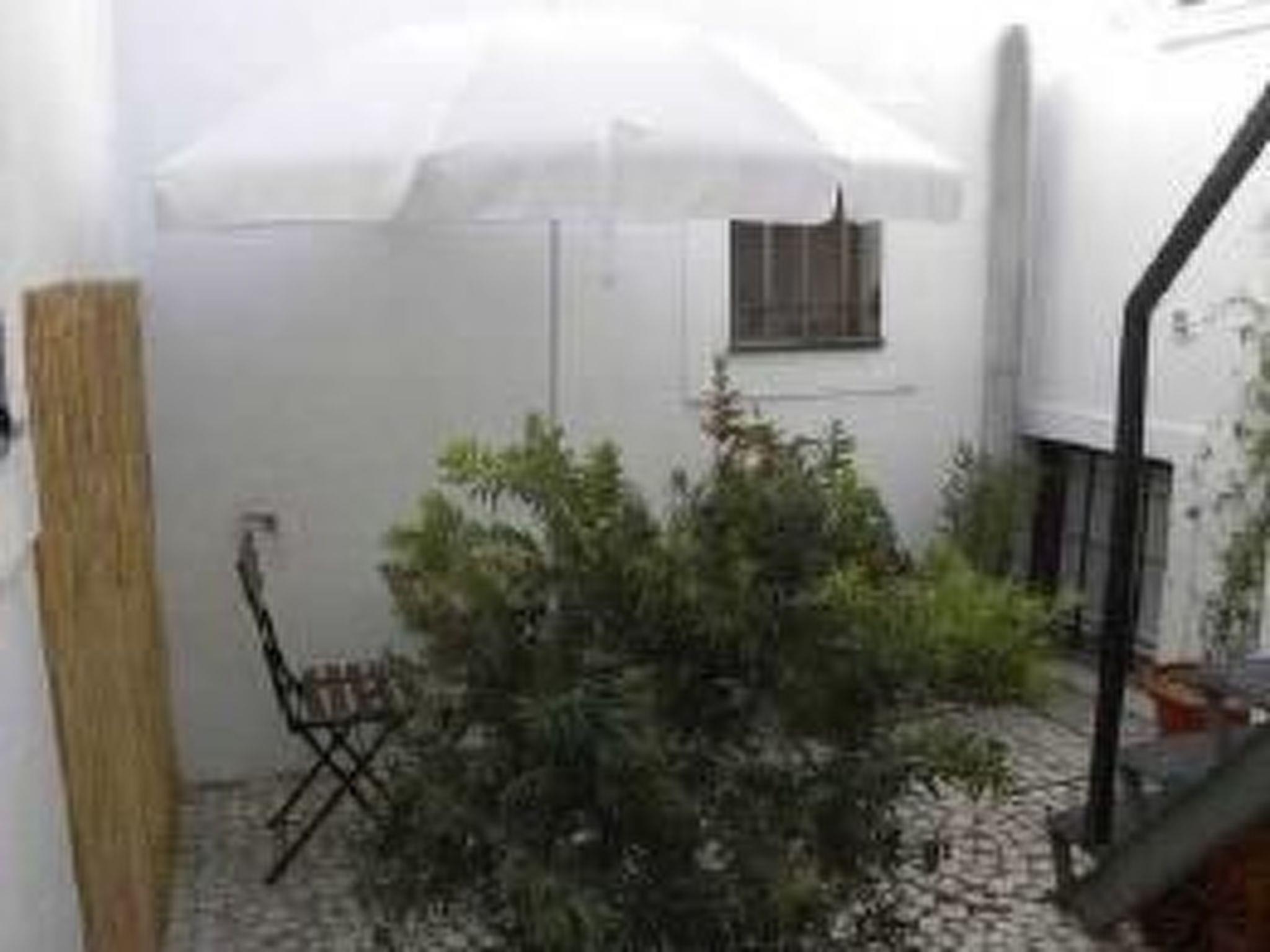 Durch die Glastür des Wohnzimmers führt eine Außentreppe aus Metall in den kleinen privaten Innenhof, der mit einem Tisch und Stühlen sowie einem Sonnenschirm ausgestattet ist.