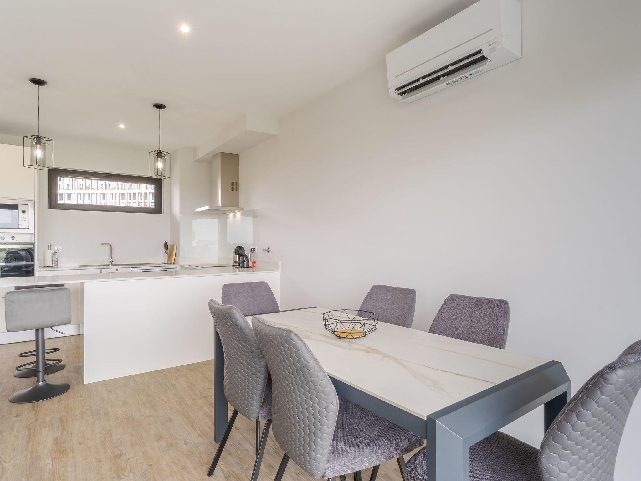 Diese große, moderne Wohnung im ersten Stock verfügt über ein offenes Wohnzimmer, Essbereich und Küche mit Sofa, Flachbild-TV und kostenlosem WLAN. Die Küche ist komplett ausgestattet mit 4-Platten-Herd, Kühlschrank, Gefrierschrank, Geschirrspüler, Mikrowelle, Backofen, Kapsel-Kaffeemaschine und Keetle.Die Wohnung verfügt über eine Waschmaschine, Kleiderbügel, Bügelbrett und Bügeleisen.Schlafzimmer und Bäder:Schlafzimmer 1, Hauptschlafzimmer, Doppelbett, Bad, Einbauschrank, Klimaanlage, Zugang zum BalkonSchlafzimmer 2, Doppelbett, Einbauschrank, Klimaanlage, Zugang zum BalkonBeide Bäder haben begehbare Dusche, Einzelwaschbecken, WC und Haartrockner in einem von ihnen.