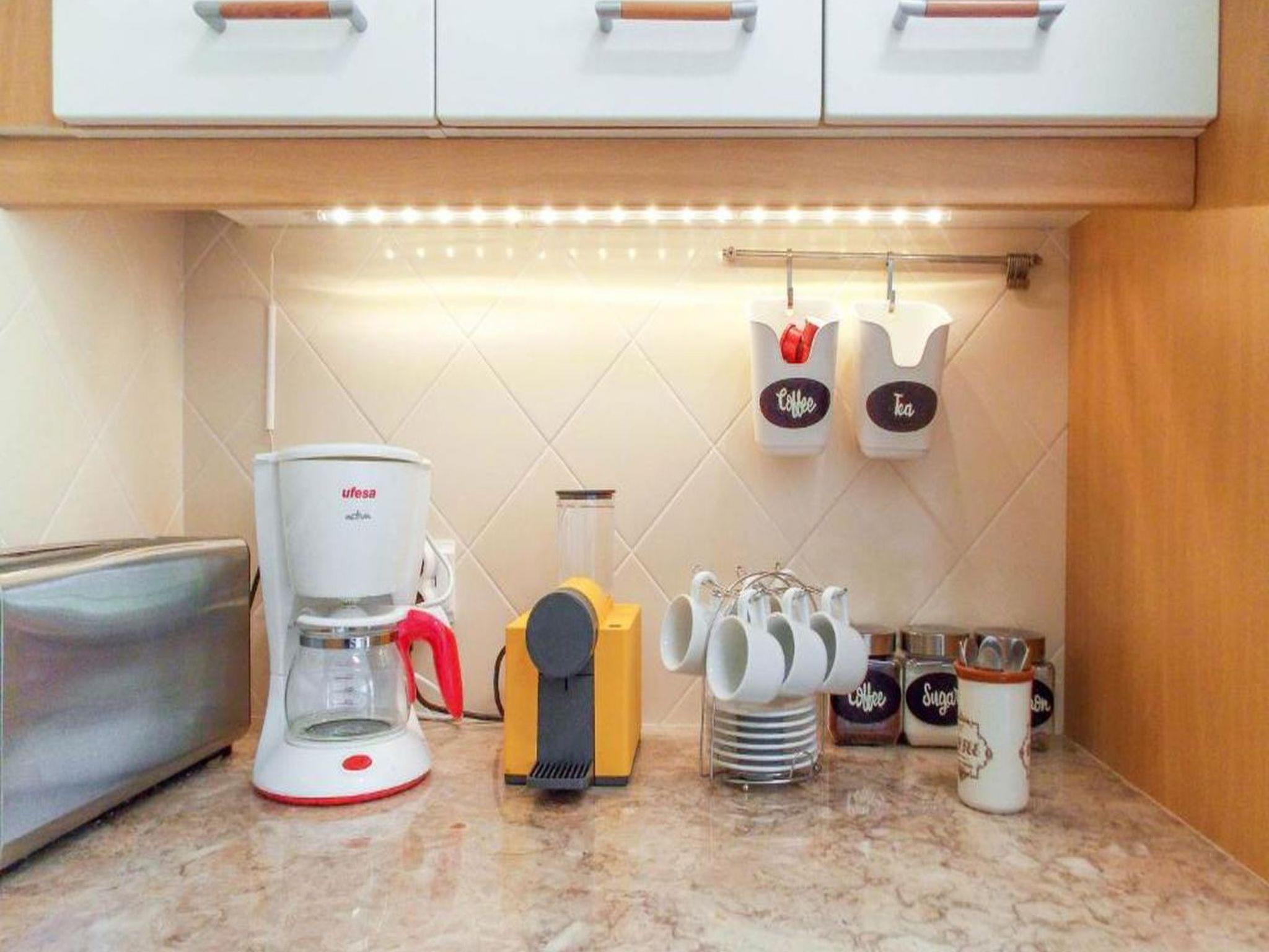 Die Wohnung hat 2 Schlafzimmer: 1 Doppelzimmer mit Balkon und Gartenblick und 1 Zweibettzimmer mit Gartenblick, 1 Wohnzimmer mit Veranda mit Tisch und Stühlen, Küche mit Kühlschrank, Mikrowelle, Waschmaschine und Geschirrspüler, Herd und Backofen, Kaffeemaschine, Toaster und alles wie Töpfe, Besteck, Schüsseln und Tassen, so dass Sie allen Komfort genießen können, als ob Sie zu Hause wären. Badezimmer mit Dusche und Bidet. Bettwäsche und Handtücher sind inklusive.