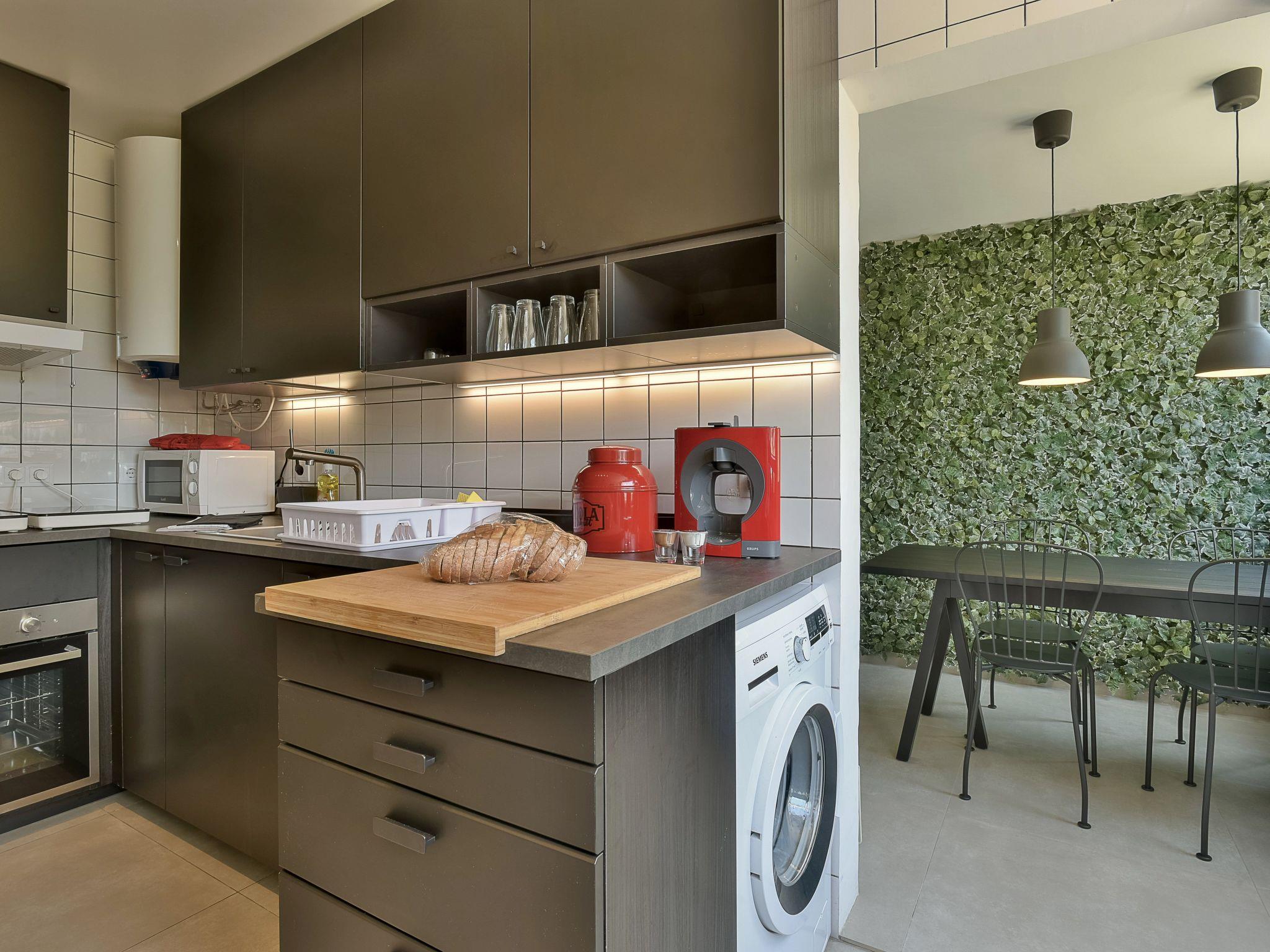 Im Inneren der Wohnung erwartet die Gäste ein komfortables Wohnambiente, das durch eine praktische Ausstattung ergänzt wird. Für die Selbstversorgung bietet die Küche neben einem 2-Platten-Herd auch eine Filter-Kaffeemaschine sowie eine Kapsel-Kaffeemaschine, ideal für den morgendlichen Kaffeegenuss. Mit Verfügbarkeit einer Waschmaschine und eines Wäschetrockners direkt in der Unterkunft können sich Gäste auch bei längeren Aufenthalten wie zu Hause fühlen. An heißen Tagen sorgen insgesamt 4 Ventilatoren in der Wohnung für kühlende Luftzüge und ein angenehmes Raumklima.