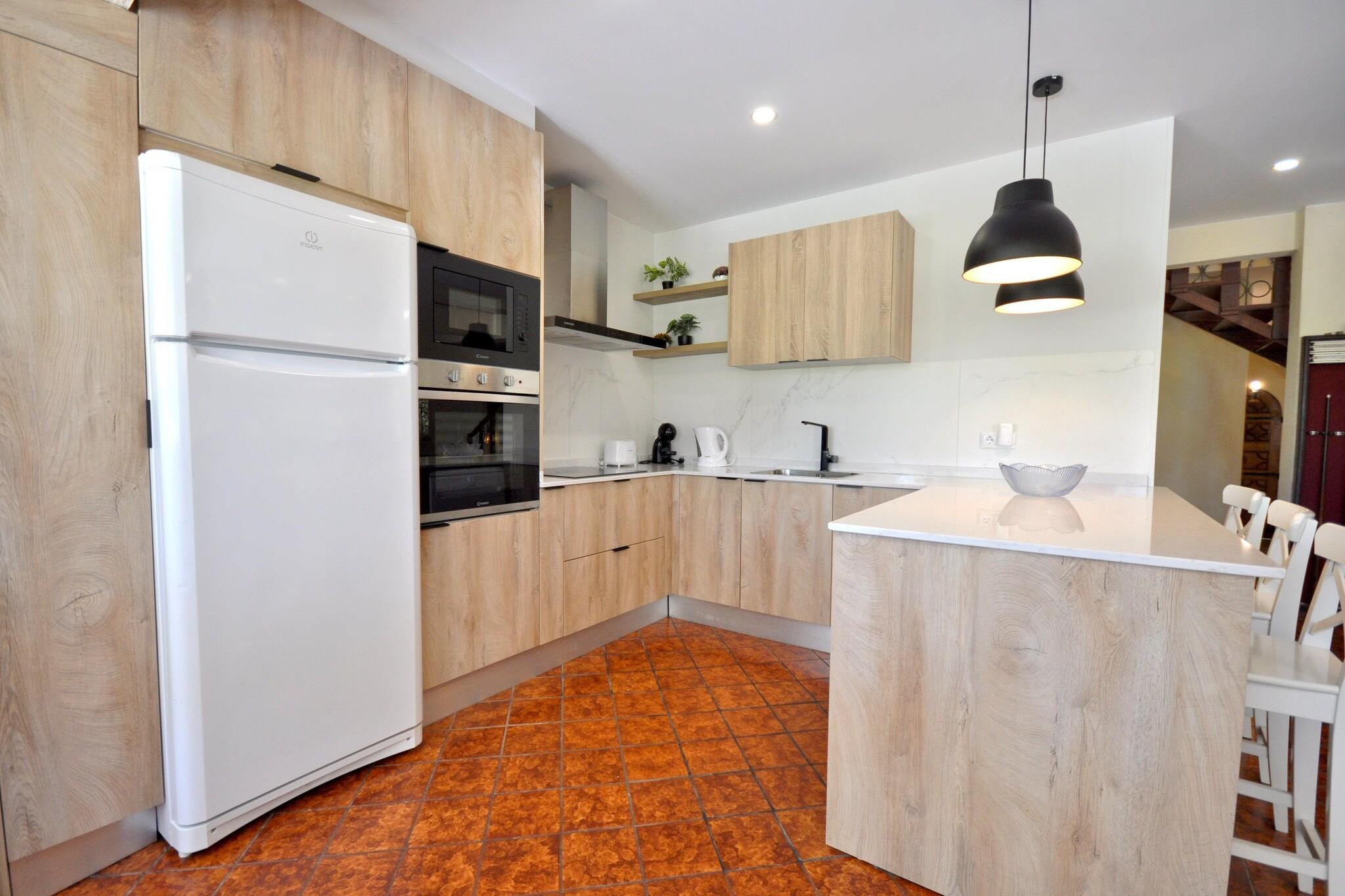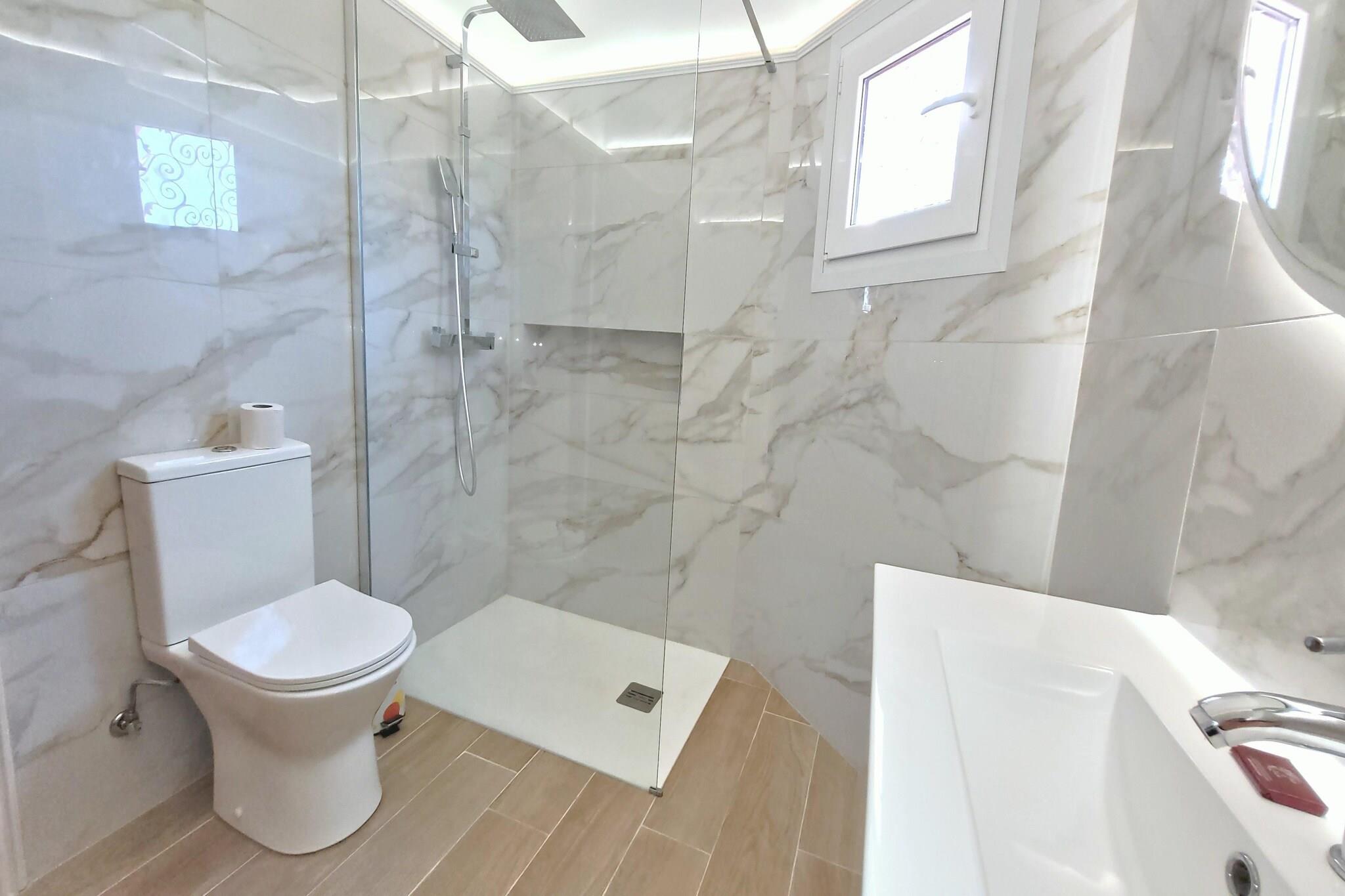 Parterre: (Küche(Esstisch, Mikrowelle, Spülmaschine, Waschmaschine), Wohn/Esszimmer(TV, Esstisch, Sitzecke, DVD-Spieler), Schlafzimmer(2x Einzelbett), Schlafzimmer(2x Einzelbett), Schlafzimmer(2x Einzelbett), Badezimmer(Badewanne)) In der 1. Etage: (Schlafzimmer(2x Einzelbett), Schlafzimmer mit Badezimmer(2x Einzelbett)) Herd, Kaffeemaschine, Badewanne oder Dusche, Dusche, Patio, Klimaanlage, Terrasse, Garten, Gartenmöbel, Grill, Parkplatz, Liegestühle, Sonnenschirm, Pool(alleinige Nutzung, 9 x 4 m.), Billard, Bügelbrett