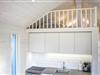 Im Inneren ist alles clever und kompakt gestaltet. Eine Leiter führt zum gemütlichen Schlafboden unterm Dach herauf. Beim Gemeinschaftsbereich eröffnen große Fenster den Blick ins Grüne.
