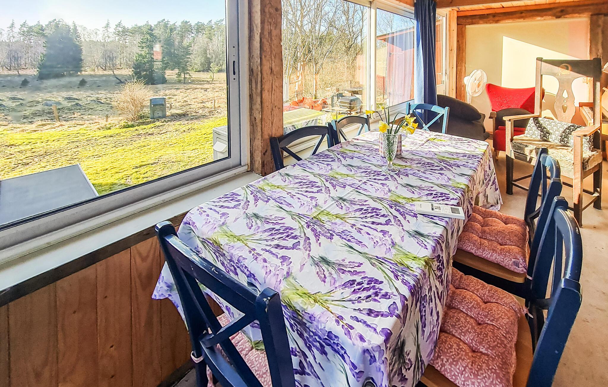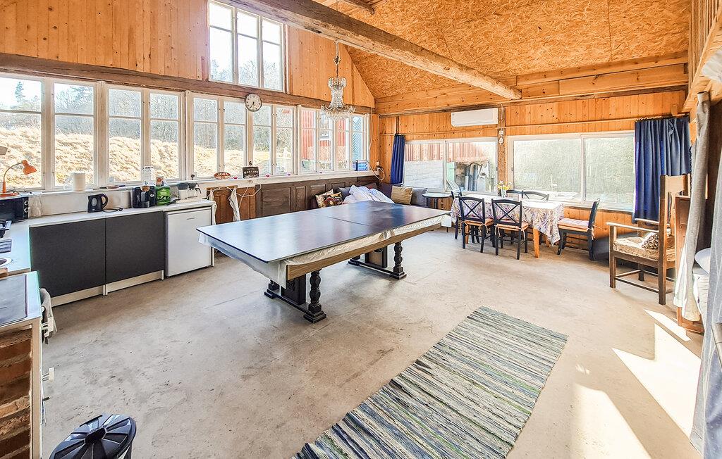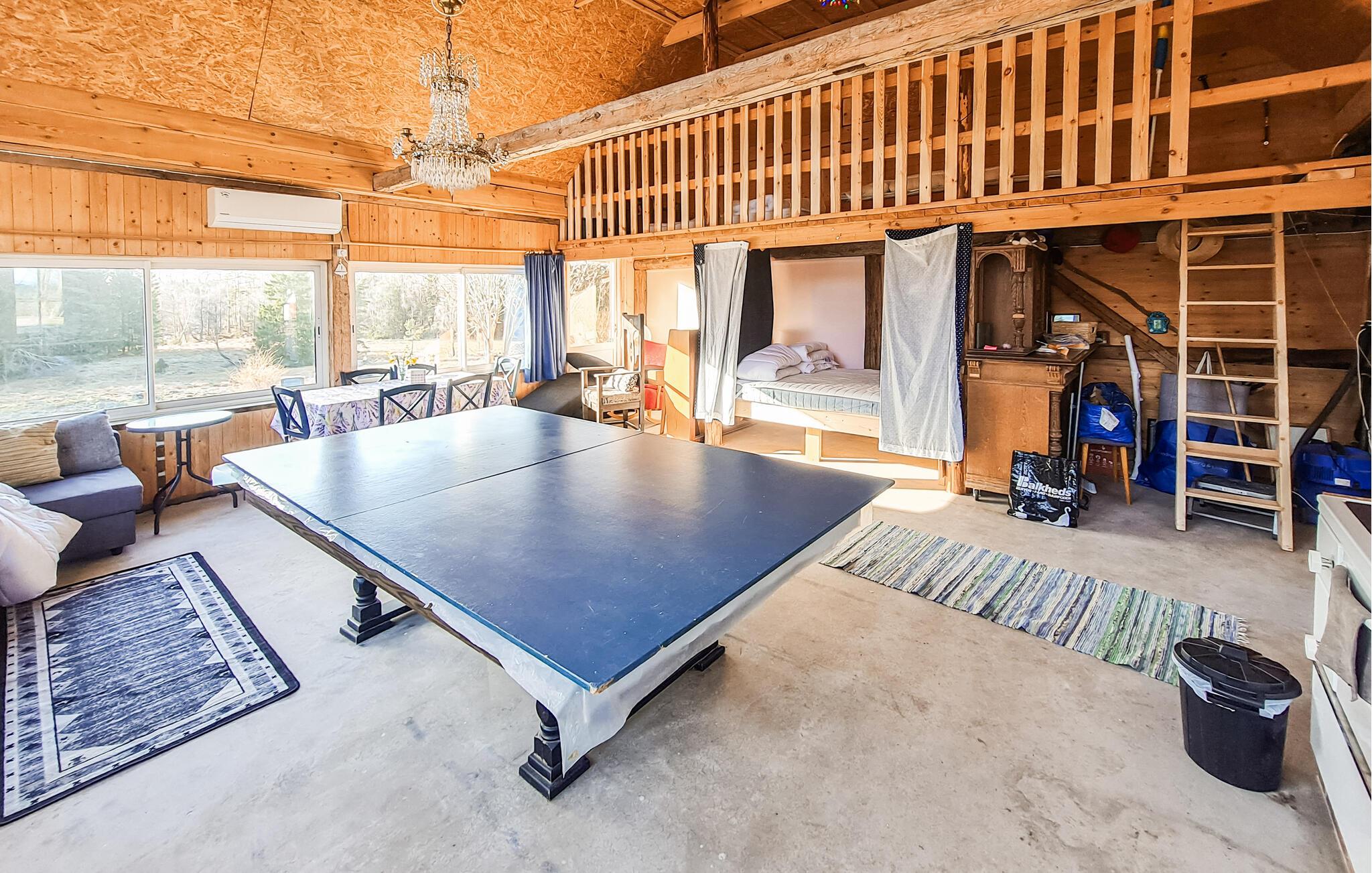 In diesem Haus wohnen Sie in einem großzügigen Raum mit hohen Decken, dessen Mittelpunkt ein Billardtisch bildet und der dadurch eine entspannte, gesellige Atmosphäre ausstrahlt. Die Einrichtung ist bewusst einfach gehalten, ergänzt durch liebevolle Details wie alte Bahnhoffenster und historische Türen, die dem Raum einen besonderen Charakter verleihen. Große Fensterfronten lassen viel Licht herein und geben den Blick auf die umliegende Natur frei – ideal für alle, die Ruhe schätzen und einen unkomplizierten Rückzugsort suchen.