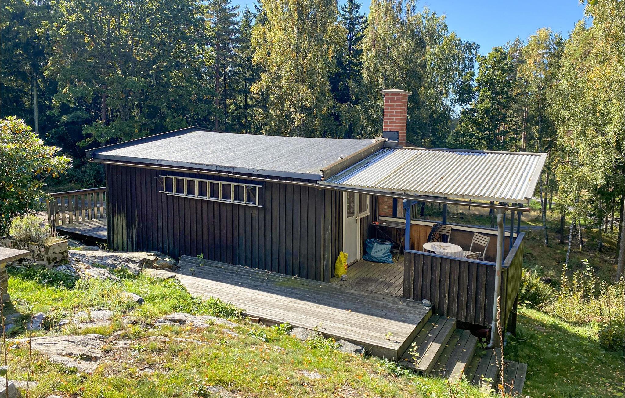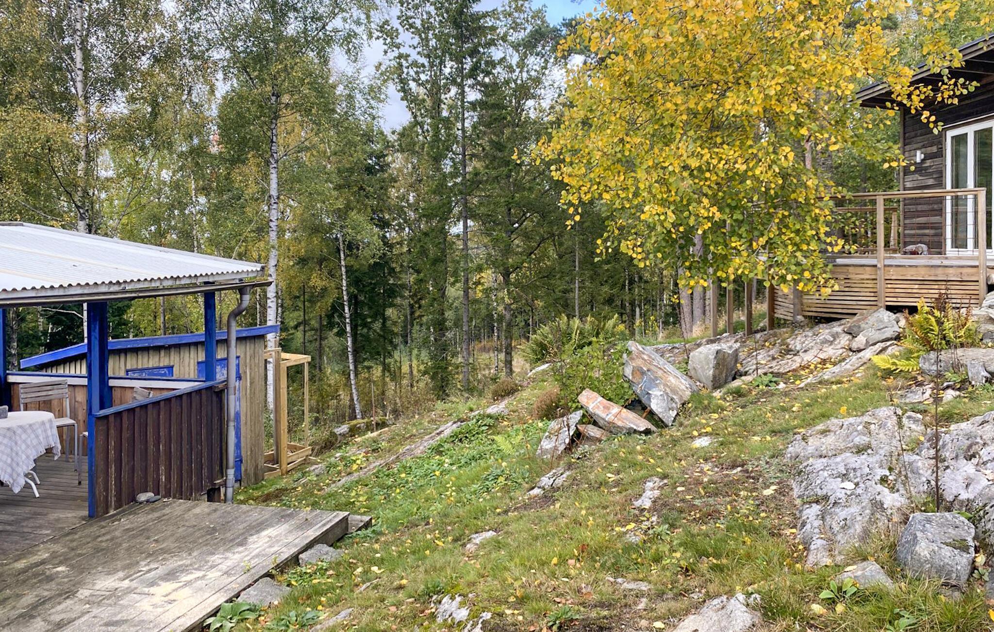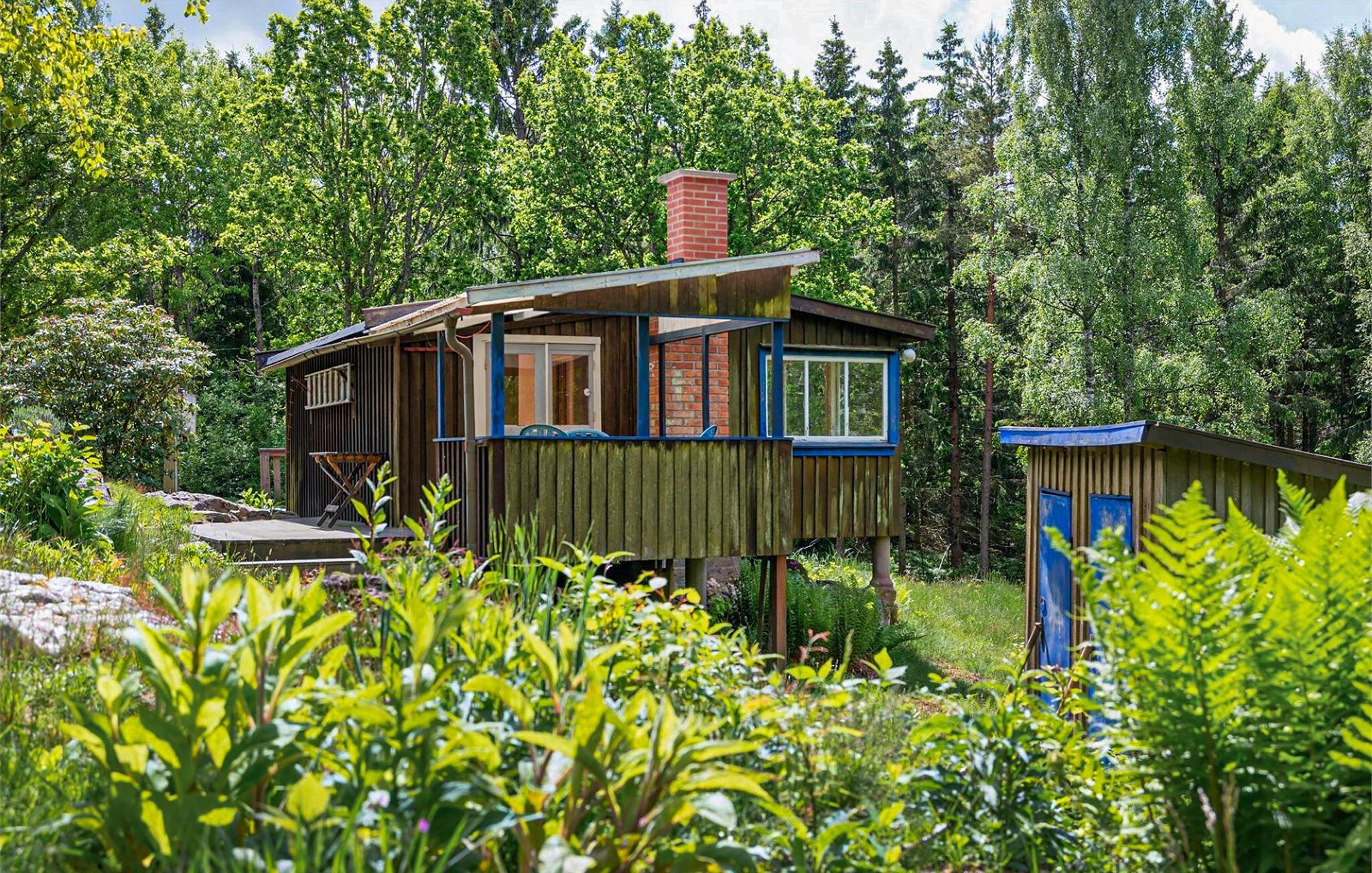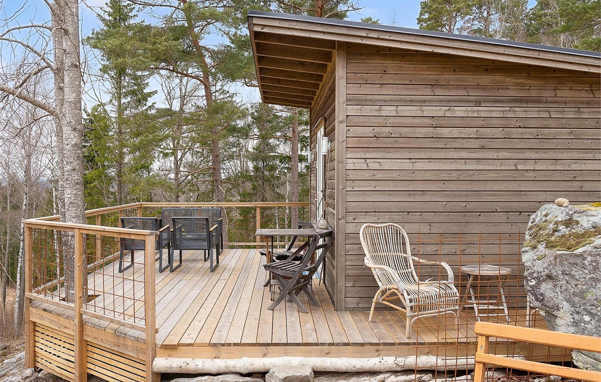 Erleben Sie diese gemütliche Hütte inmitten von Bäumen – Ihr Rückzugsort an der Westküste Schwedens.