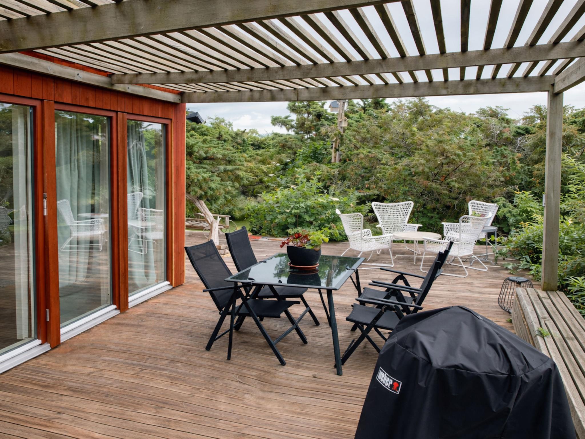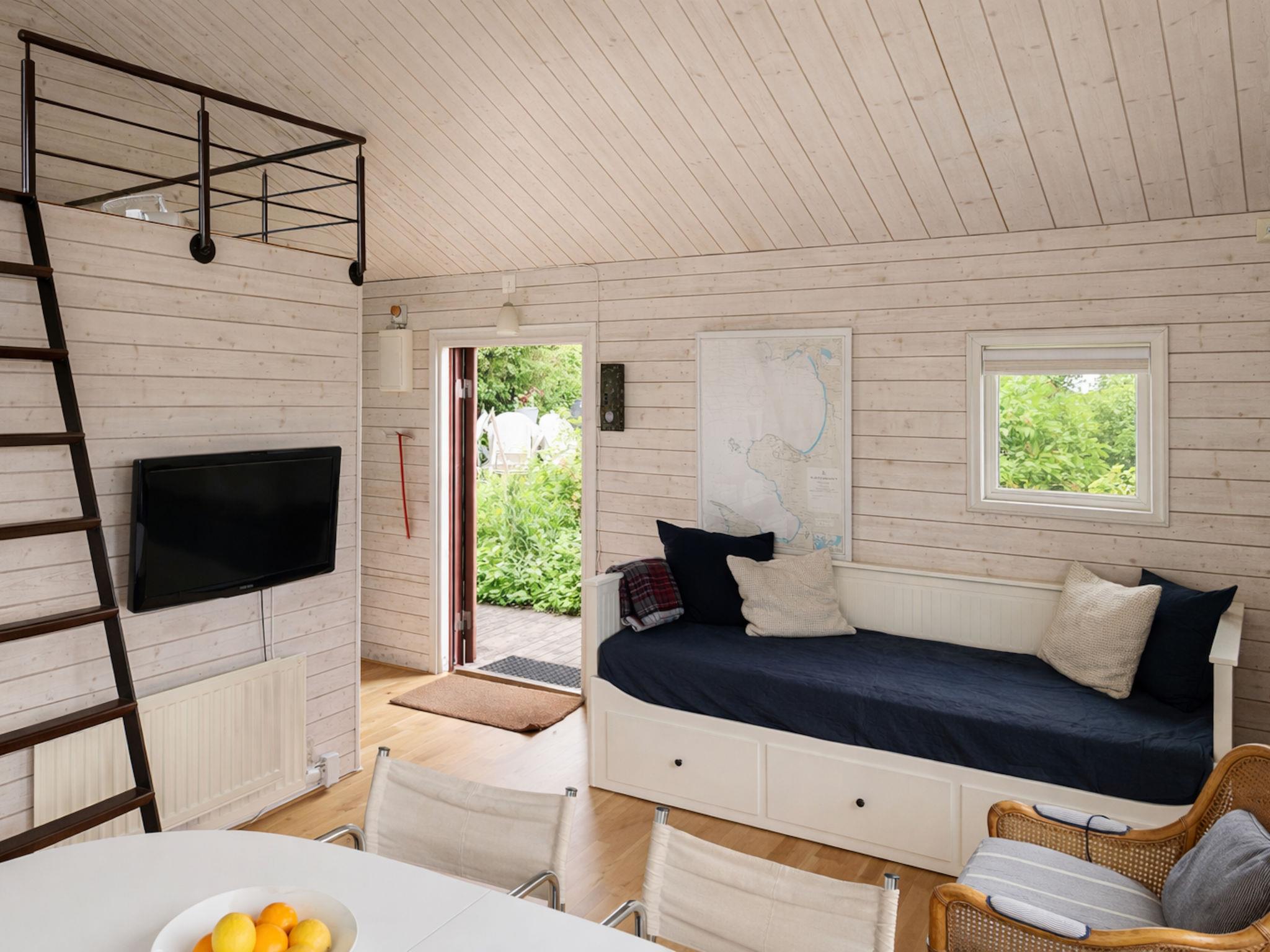 "Ringenäs", 1-Zimmer-Haus 50 m2. Offenes Wohn-/Schlafzimmer mit 1 Diwanbett (140 cm), Esstisch und TV. Ausgang zum Garten, zur Terrasse. Abgeschrägte Kabine mit 1 Bett (160 cm). Holzdielenboden. Terrassenmöbel. Sehr schöne Sicht auf das Meer und den Garten. Zur Verfügung: Internet (WLAN). Bitte beachten: Nichtraucher-Haus.