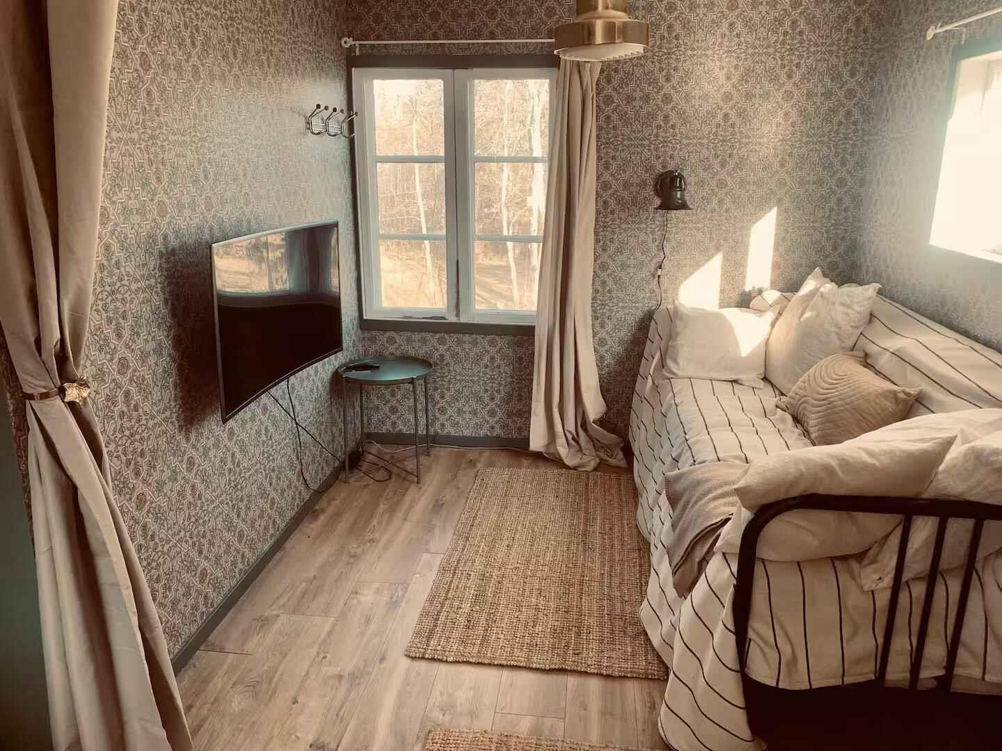 Zugang zur holzbeheizten Sauna am See nach Vereinbarung mit den Eigentümern des Ferienhauses. Neu renoviertes Gästehaus mit großer Terrasse und Grill. Im Winter gibt es einen Grillplatz auf dem Grundstück. Fantastische Badeplätze, Wanderwege, Laufstrecken, Kanuausleihe und die Möglichkeit, Pilze zu pflücken. Beeren und Wälder befinden sich nur ein paar hundert Meter vom Haus entfernt. Die gut gepflegten Skipisten des Hindås Skiclubs sind im Winter zugänglich, und wenn es kalt ist, ist es möglich, etwa 200 Meter vom Haus entfernt auf dem See zu Eislaufen. Das 12 m2 große Loft verfügt über ein Doppelbett. Eine stabile aber steile Treppe führt hinauf zum Dachboden. Im Erdgeschoss gibt es ein Schlafsofa und einen Fernseher (Streaming), der mithilfe schalldämmender Vorhänge abgetrennt werden kann. Das Badezimmer ist geräumig für ein kleines Haus und bietet sowohl eine Dusche als auch Fußbodenheizung. In der Küche gibt es alles, was man für einen kurzen Aufenthalt benötigt, einschließlich eines kleinen Kühlschranks mit Gefrierfach, Herd, Mikrowelle usw. (Es gibt keinen Ofen). Das Haus ist mit einer Luftwärmepumpe ausgestattet, die im Winter heizt und im Sommer kühlt. Es gibt einen Bahnhof nach Göteborg und Borås nur 12 Minuten zu Fuß vom Haus entfernt, und die Bushaltestelle liegt 7 Minuten entfernt. Direktzüge/Busse in die zentrale Stadt Göteborg und Borås benötigen 30 Minuten. 200 Meter vom Haus entfernt liegt der Hindås Kanoklub, wo man schwimmen und auch ein Kanu mieten kann, um durch die Östra und Västra Nedsjöarne zu paddeln (sehr zu empfehlen) sowie den alten schönen Kanal, der die Seen verbindet. Im Jahr 2025 öffnete das Spa-Hotel Hjortviken in Hindås seine Türen. Es gab einen enormen Hype um das Hotel, mit Artikeln in Forbes und The Independent, die besagen, dass es eine der am meisten erwarteten Eröffnungen der Welt in diesem Jahr ist. Man kann essen, trinken, schwimmen und andere Aktivitäten genießen, auch wenn man nicht im Hotel übernachtet. Perfekt, wenn Sie etwas Leckeres essen oder einen regnerischen Tag verbringen wollen! Hindås hat sich seit den 1940er Jahren positiv entwickelt, angetrieben durch den Tourismus, und das führte zu 14 Hotels und Pensionen als Rückzugsorte für den gestressten und wohlhabenden Bürger Göteborgs. Im Sommer zog es diese nach Hindås mit seiner erfrischenden, reinen Luft, der schönen Natur und den herrlichen Badeplätzen in den klaren Västra und Östre Nedsjöarne (Göteborg bezieht sein Trinkwasser aus diesen Seen). Im Winter verkehrte am Wochenende ein spezieller Sportzug mit Skihaltern außen am Zug von Göteborg nach Hindås für entspannende Wochenenden auf den Pisten und Hängen. In den soliden, warmen Hotels und Pensionen der 1940er Jahre wurde traditioneller süßer Punch als Après-Ski serviert. Schneekanonen sorgen für Langlaufbedingungen im Winter.