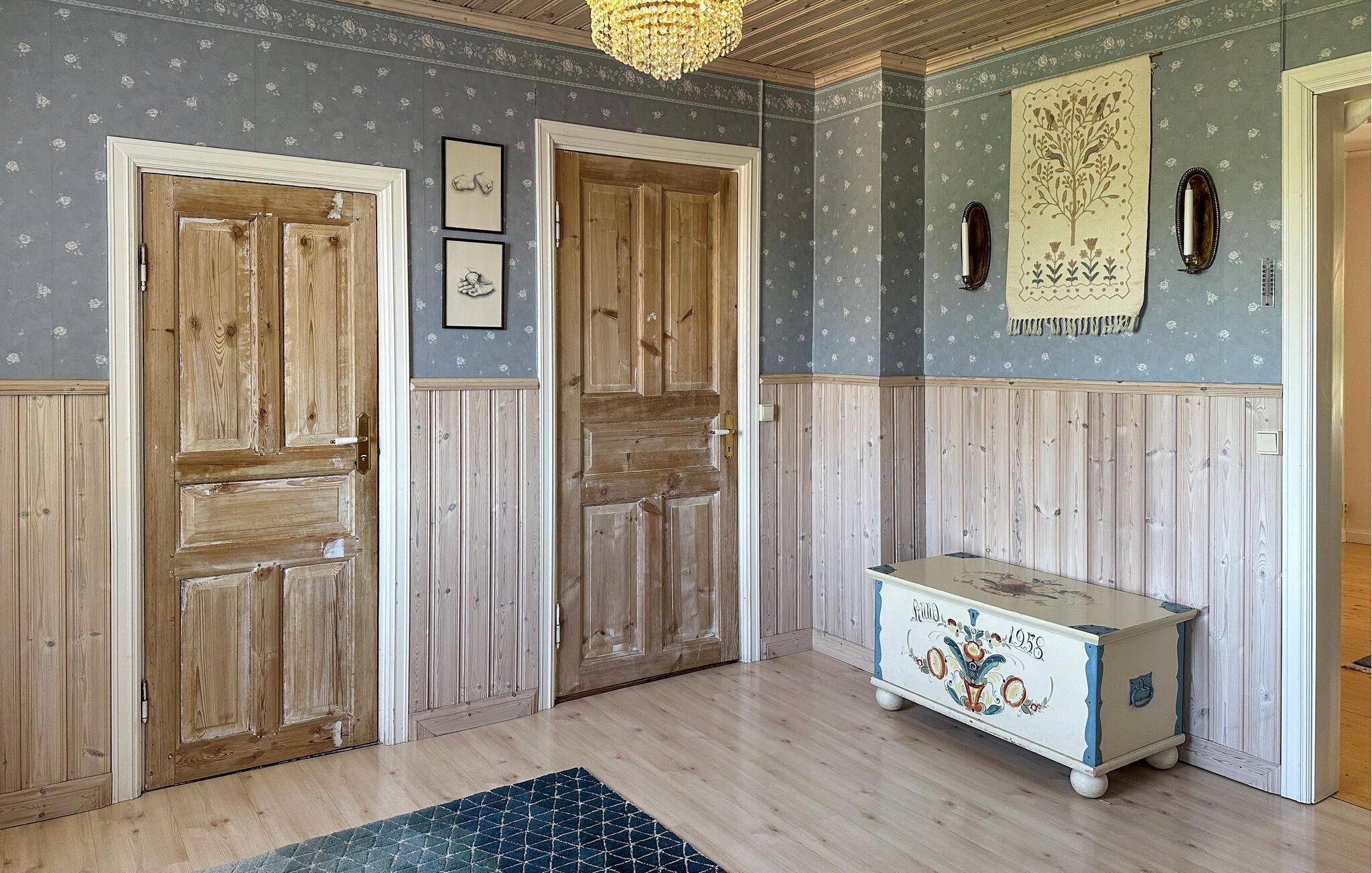 Dieses charmante Haus bietet Ihnen ein traditionelles und komfortables Ambiente und verspricht eine sorglose Urlaubszeit. Freuen Sie sich morgens bei schönem Wetter auf das Frühstück auf der gemütlichen Veranda und genießen Sie den herrlichen Blick auf den gepflegten, parkähnlichen Garten. Spazieren Sie anschließend entlang der hübschen Gartenwege und lassen Sie sich von der Ruhe und der Idylle verzaubern. Nutzen Sie auch die zahlreichen Sitzgelegenheiten im Freien. Im Inneren des Hauses erwartet Sie ein einladender Wohnbereich mit stilvollen Möbeln und einem traditionellen Kaminofen. Machen Sie es sich auf dem bequemen Sofa gemütlich und verbringen Sie entspannte Abende bei einem guten Buch oder lustigen Brettspielen. Die eleganten Kronleuchter und die geschmackvolle Dekoration verleihen dem Raum eine besondere Atmosphäre.